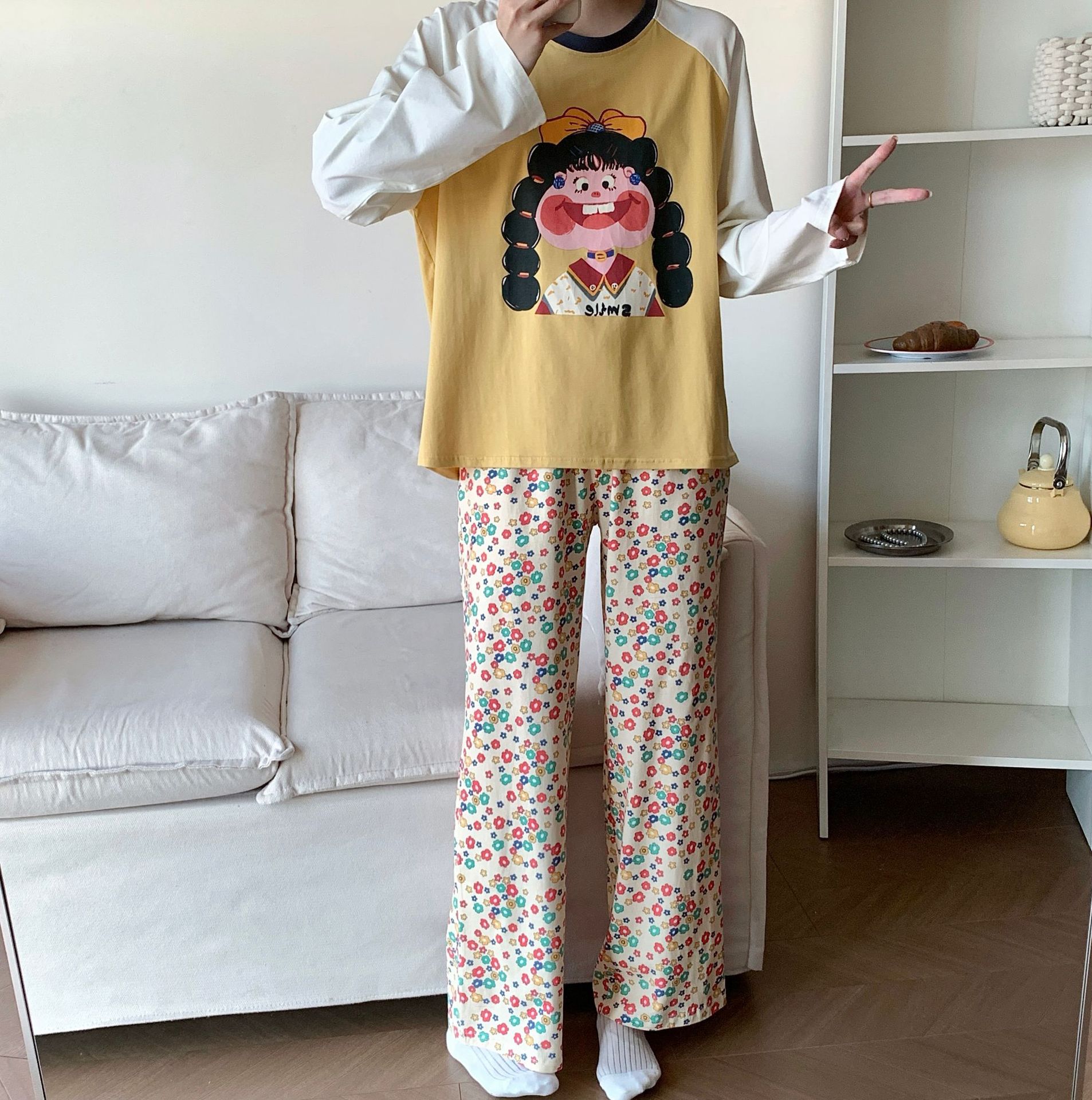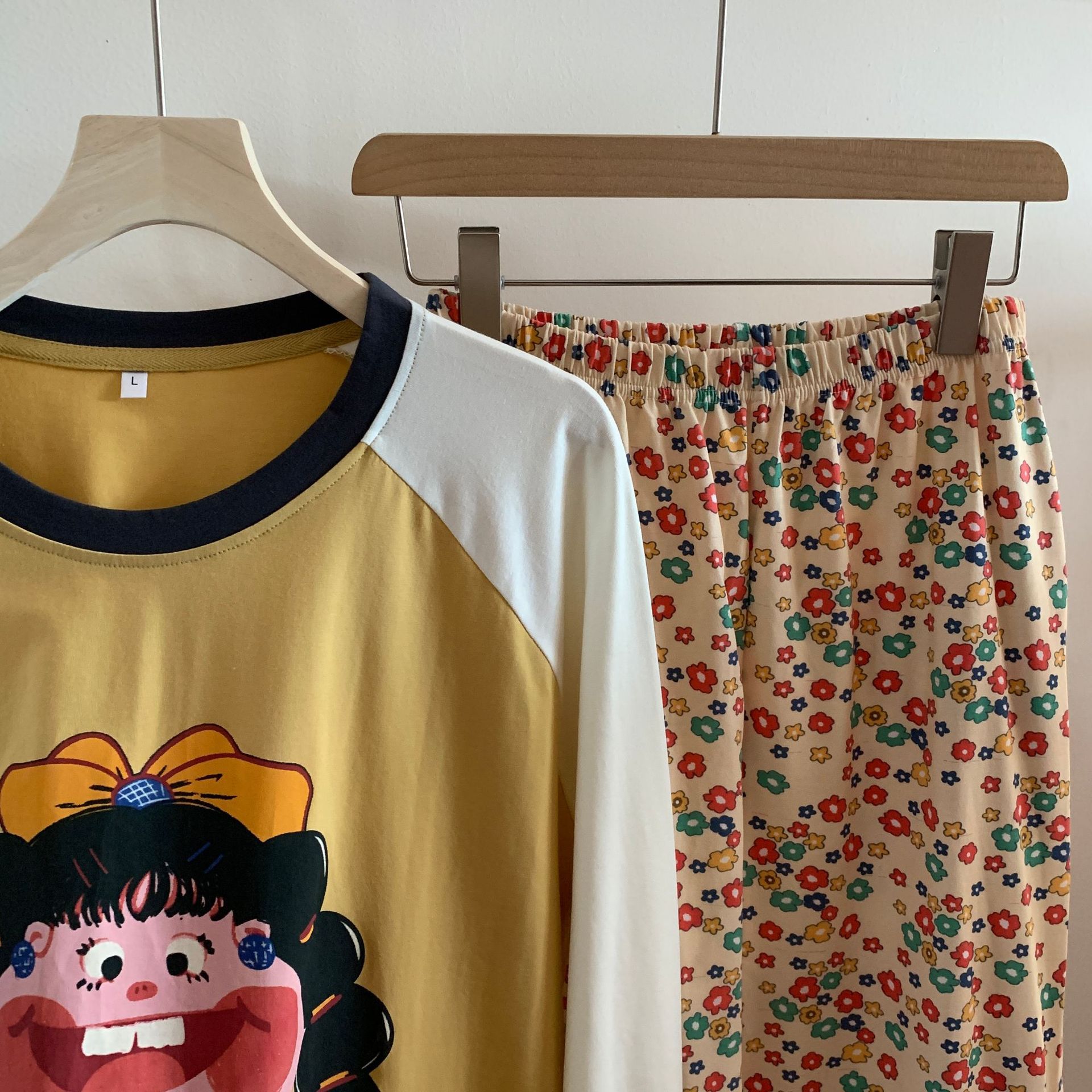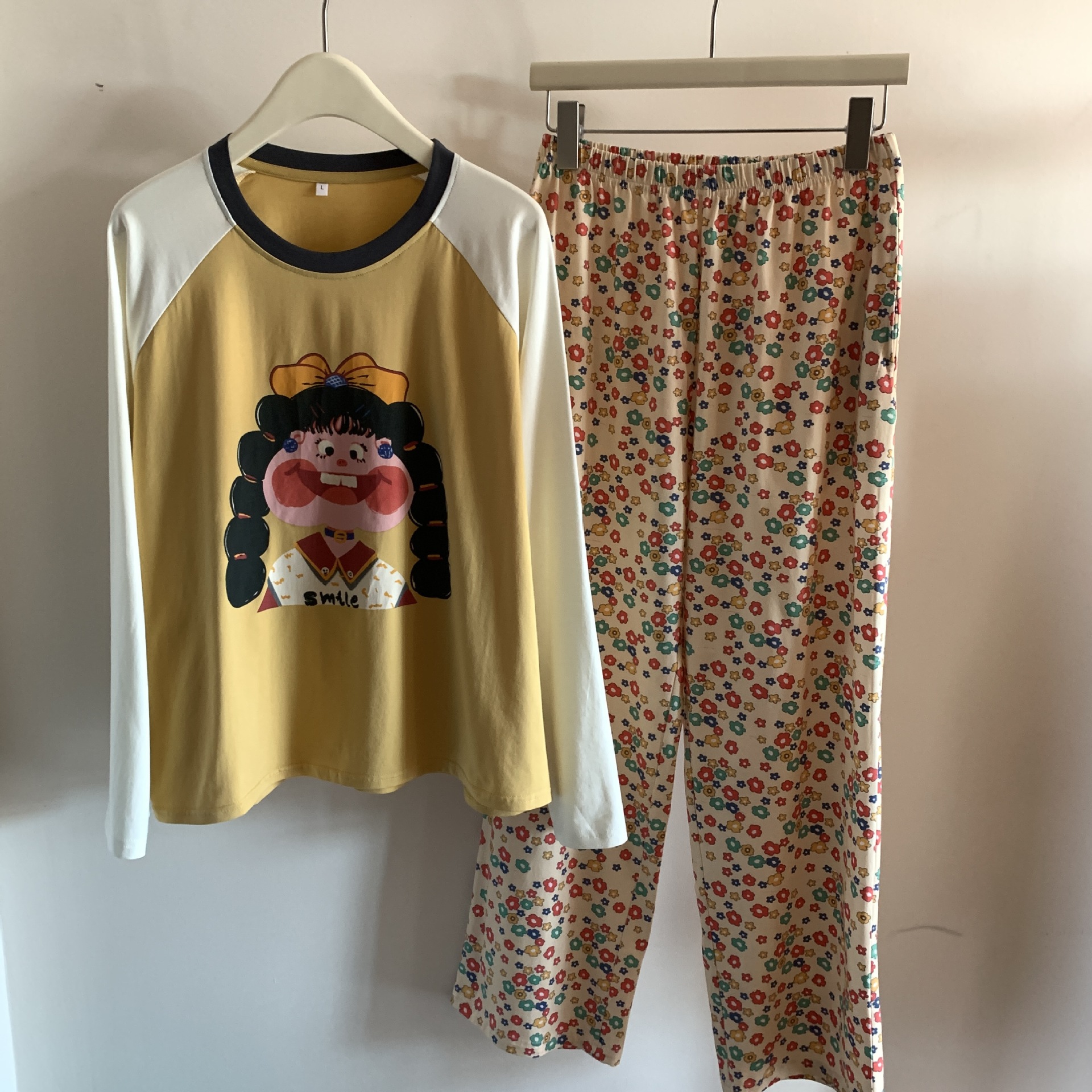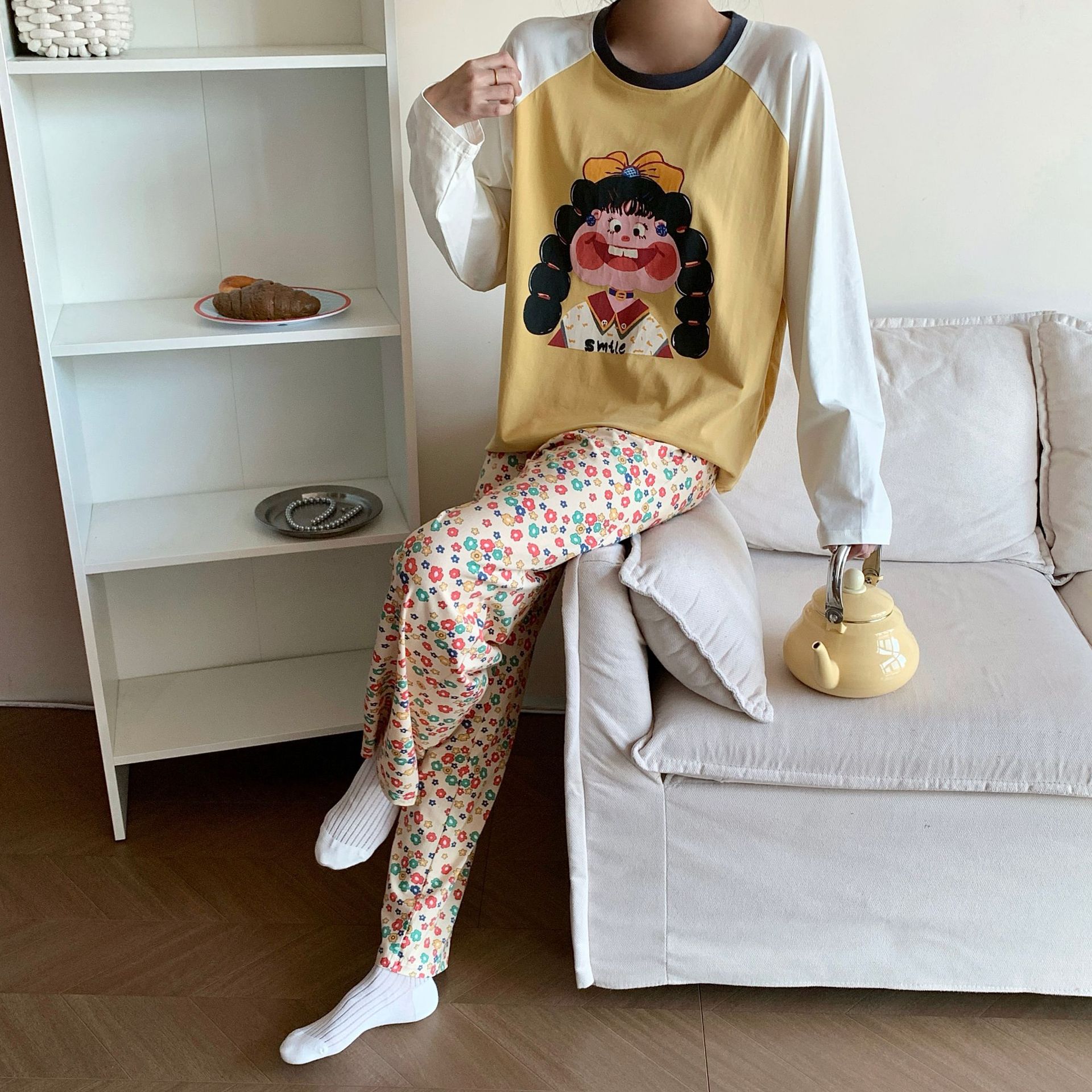 봄과 가을 새로운 Colorblock Raglan 슬리브 만화 머리띠 소녀 큰 이빨 소녀 면 통기성 의상 세트 홈 옷