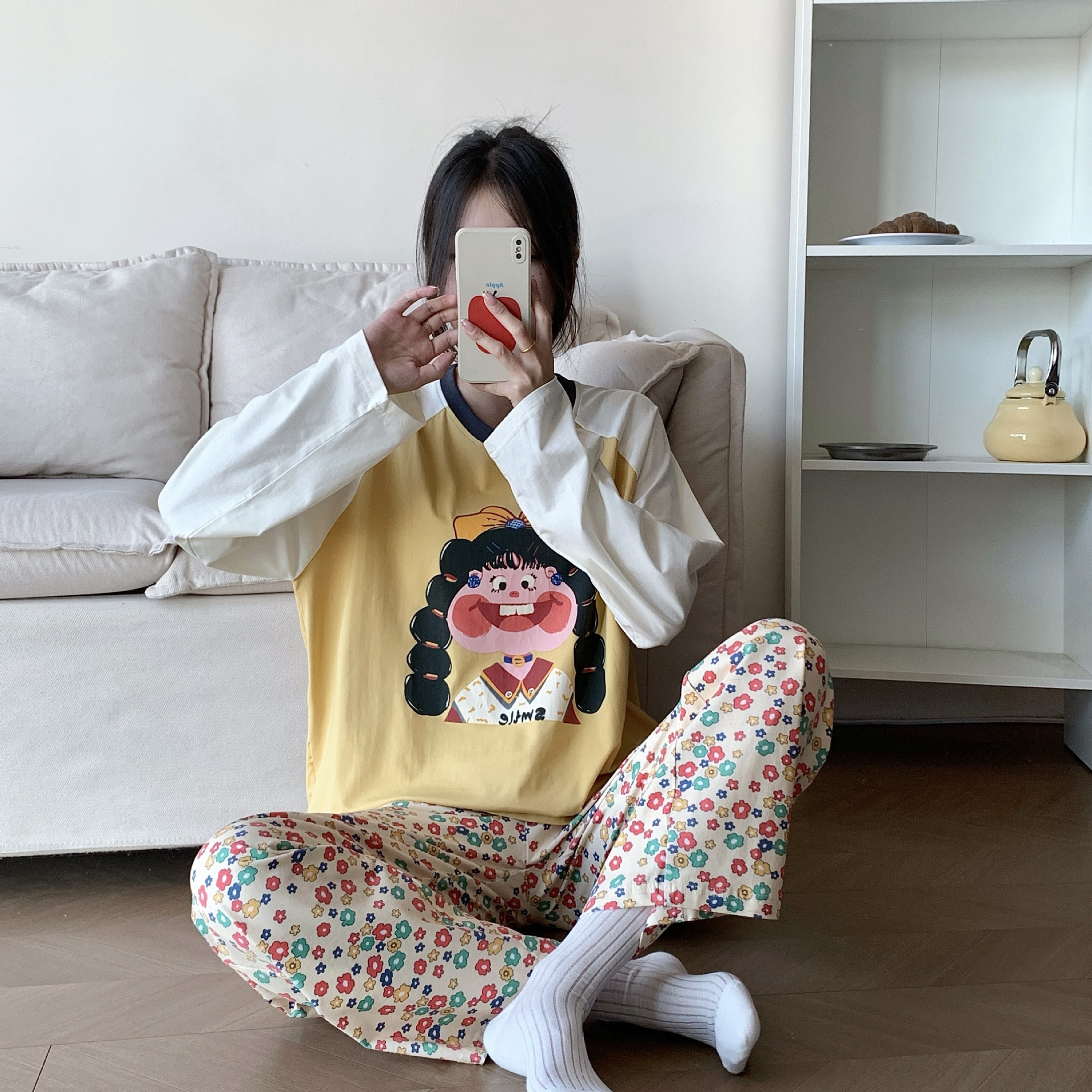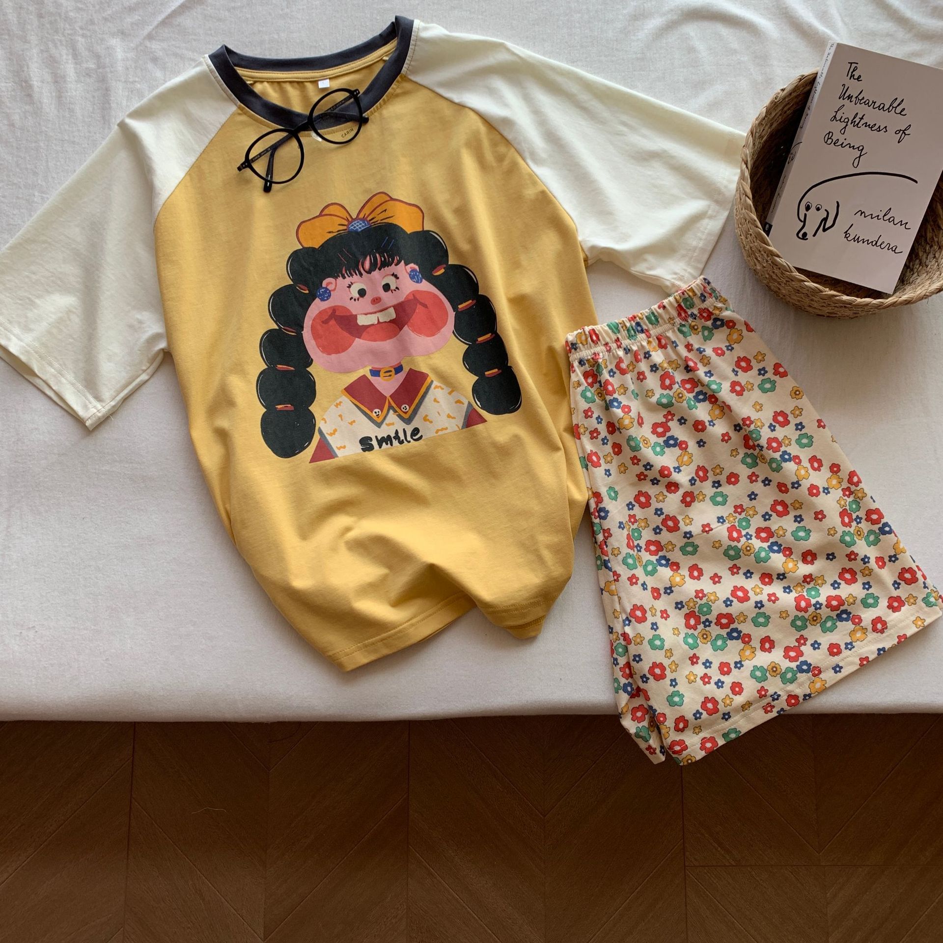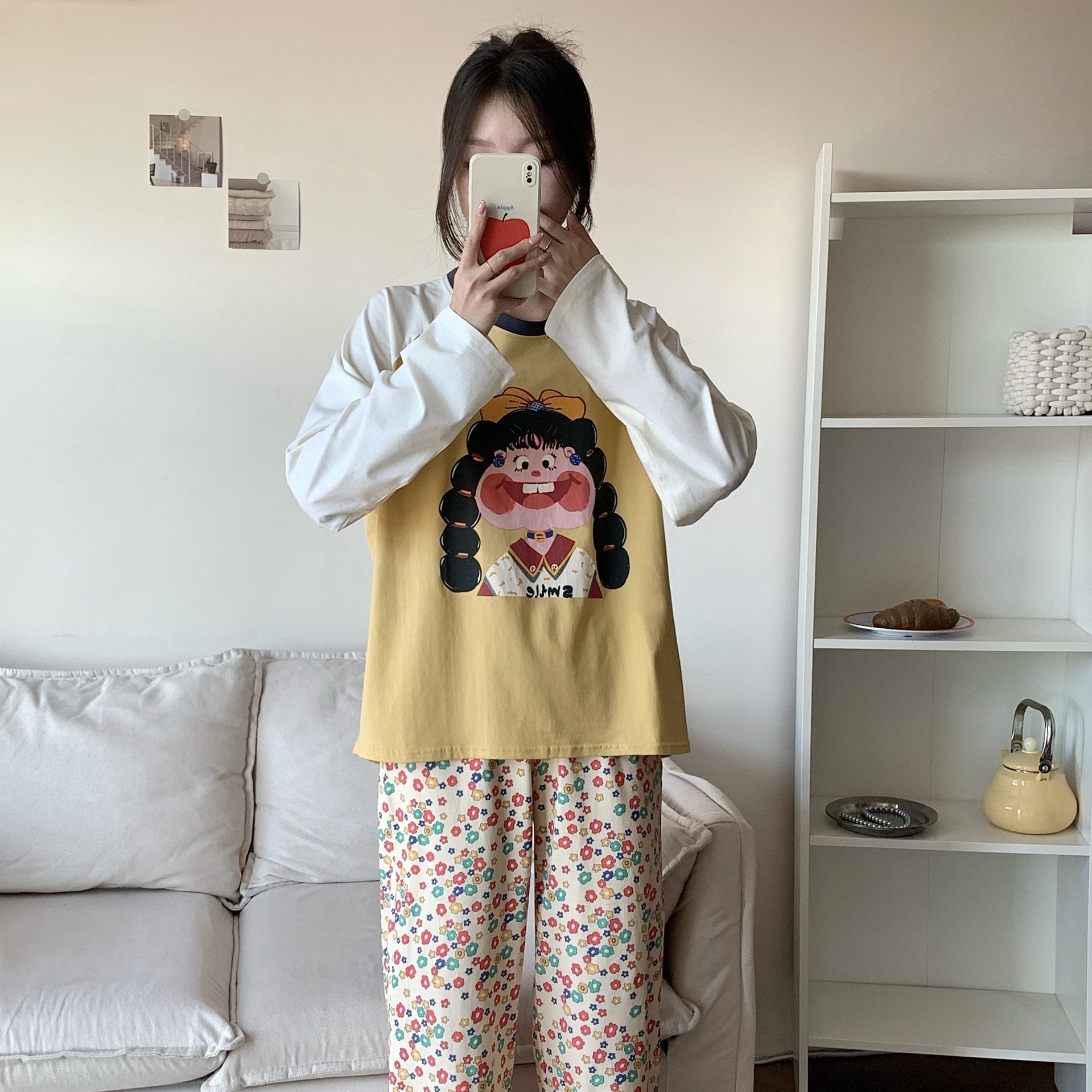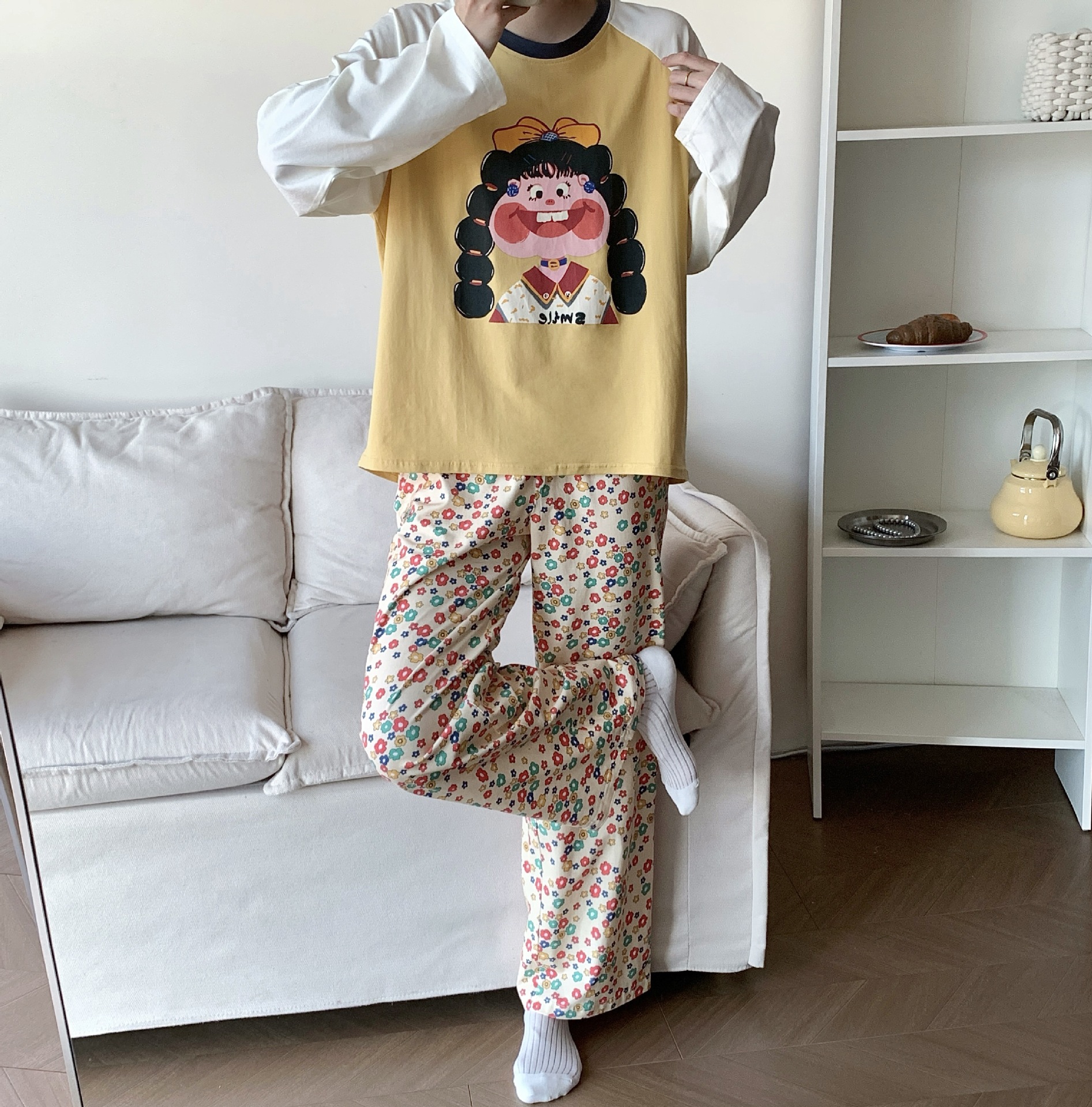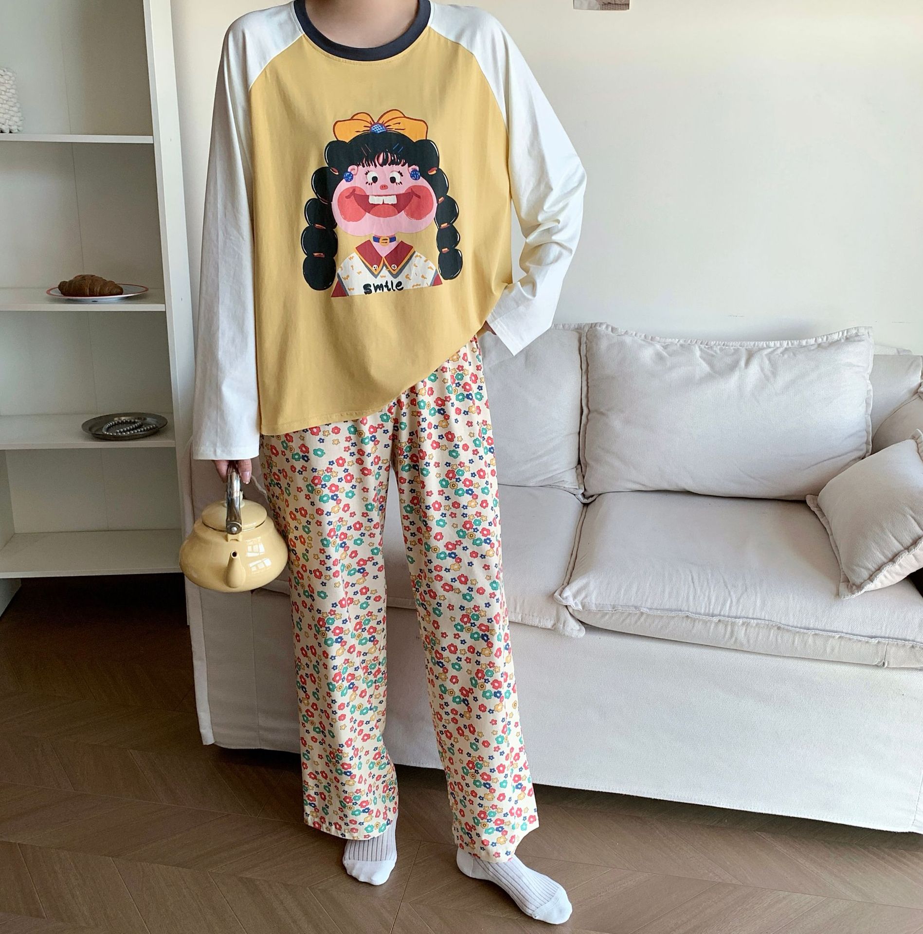 봄과 가을 새로운 Colorblock Raglan 슬리브 만화 머리띠 소녀 큰 이빨 소녀 면 통기성 의상 세트 홈 옷