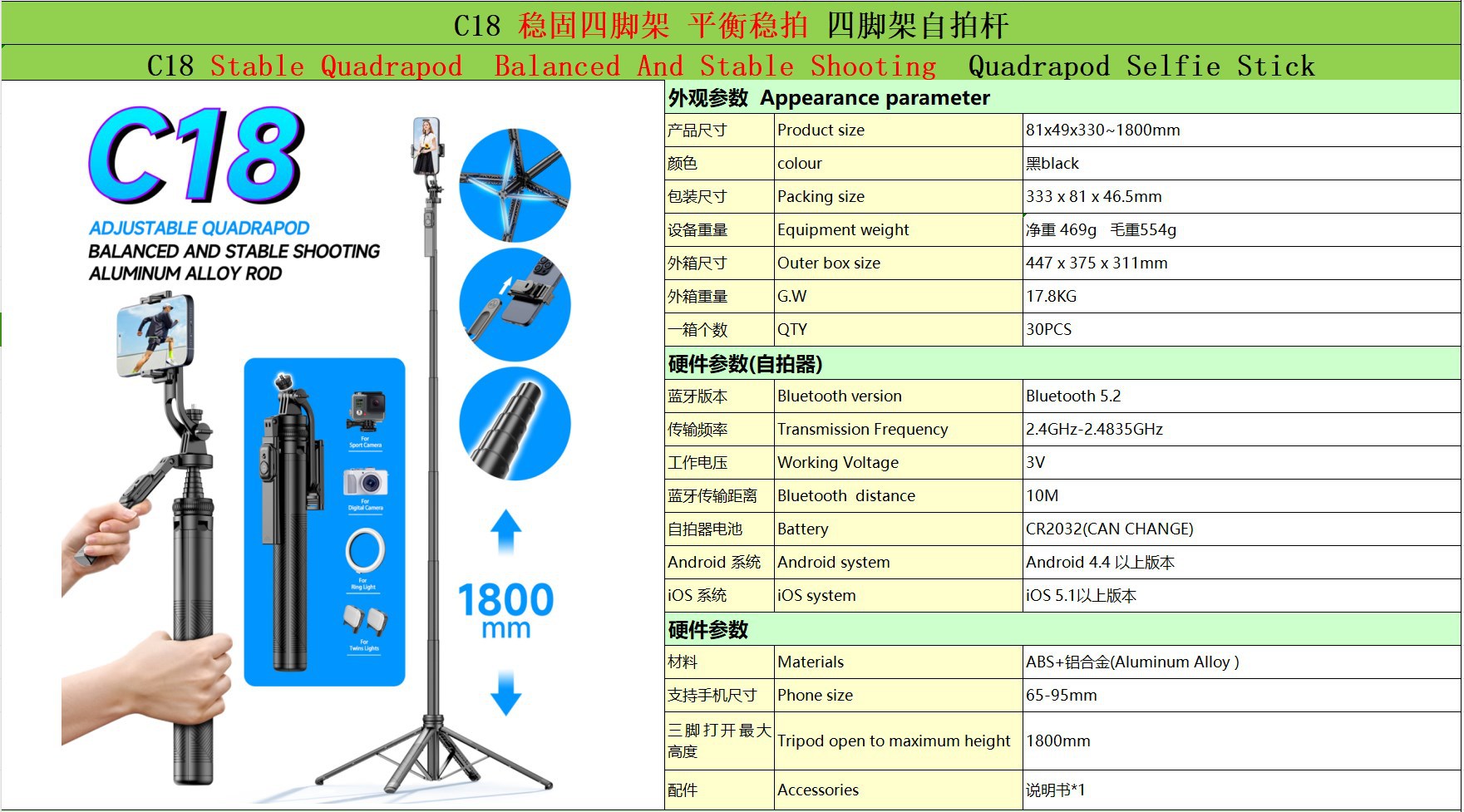 • C18-1 알루미늄 합금 1.8 m 블루투스 (G13) 셀카 스틱 빛