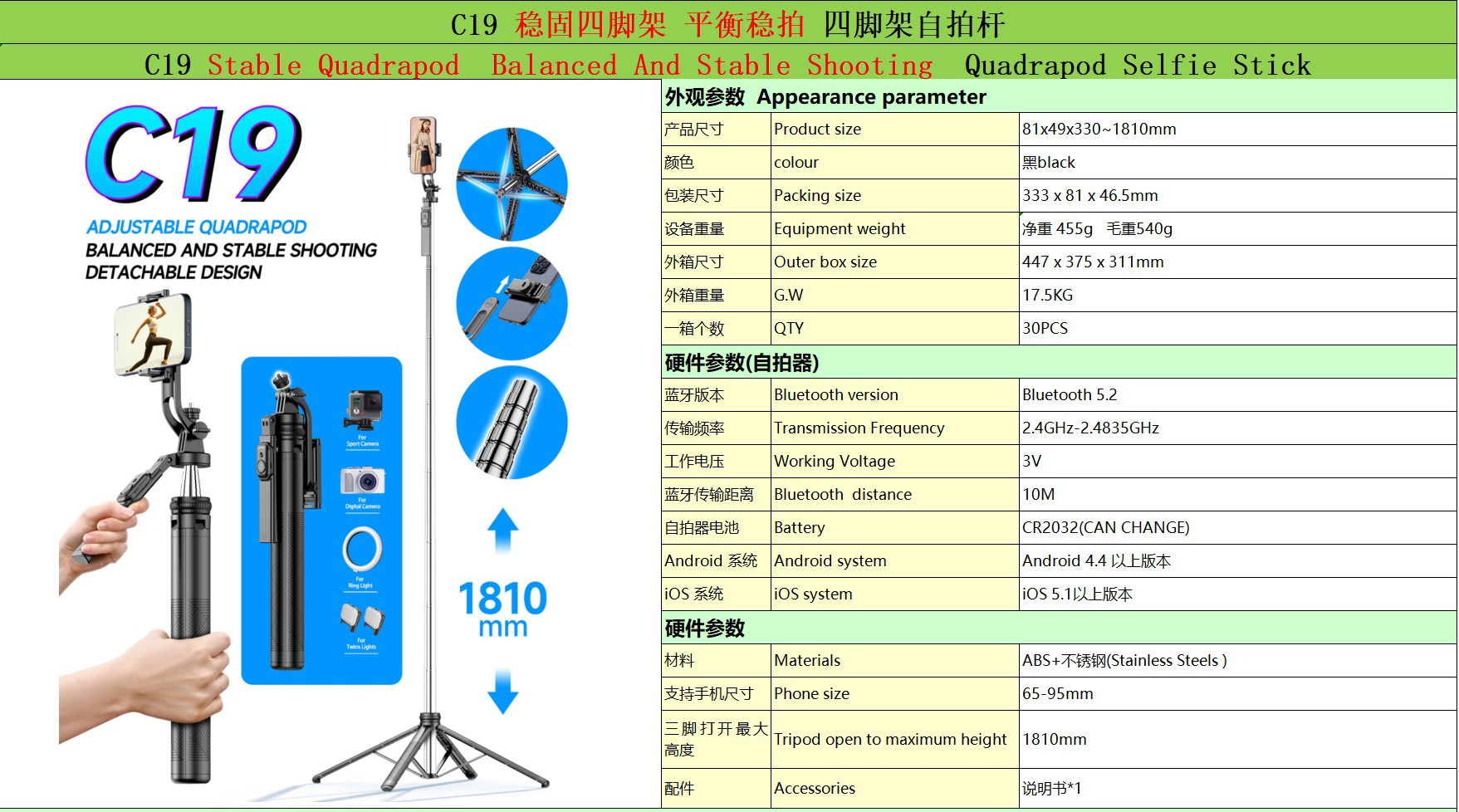 • C19-1 스테인레스 스틸 1.8 m 블루투스 (G13) 셀카 스틱 빛 없음