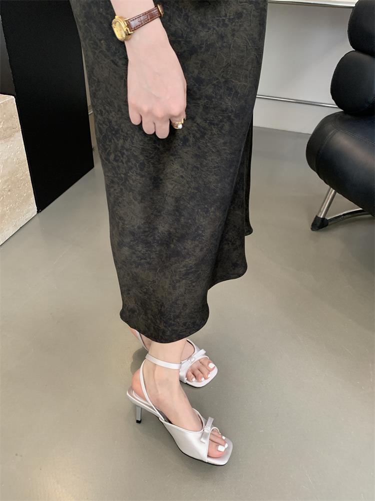 法式淑女细跟一字带凉拖鞋2024夏季蝴蝶结脚腕扣绊带露趾高跟鞋
