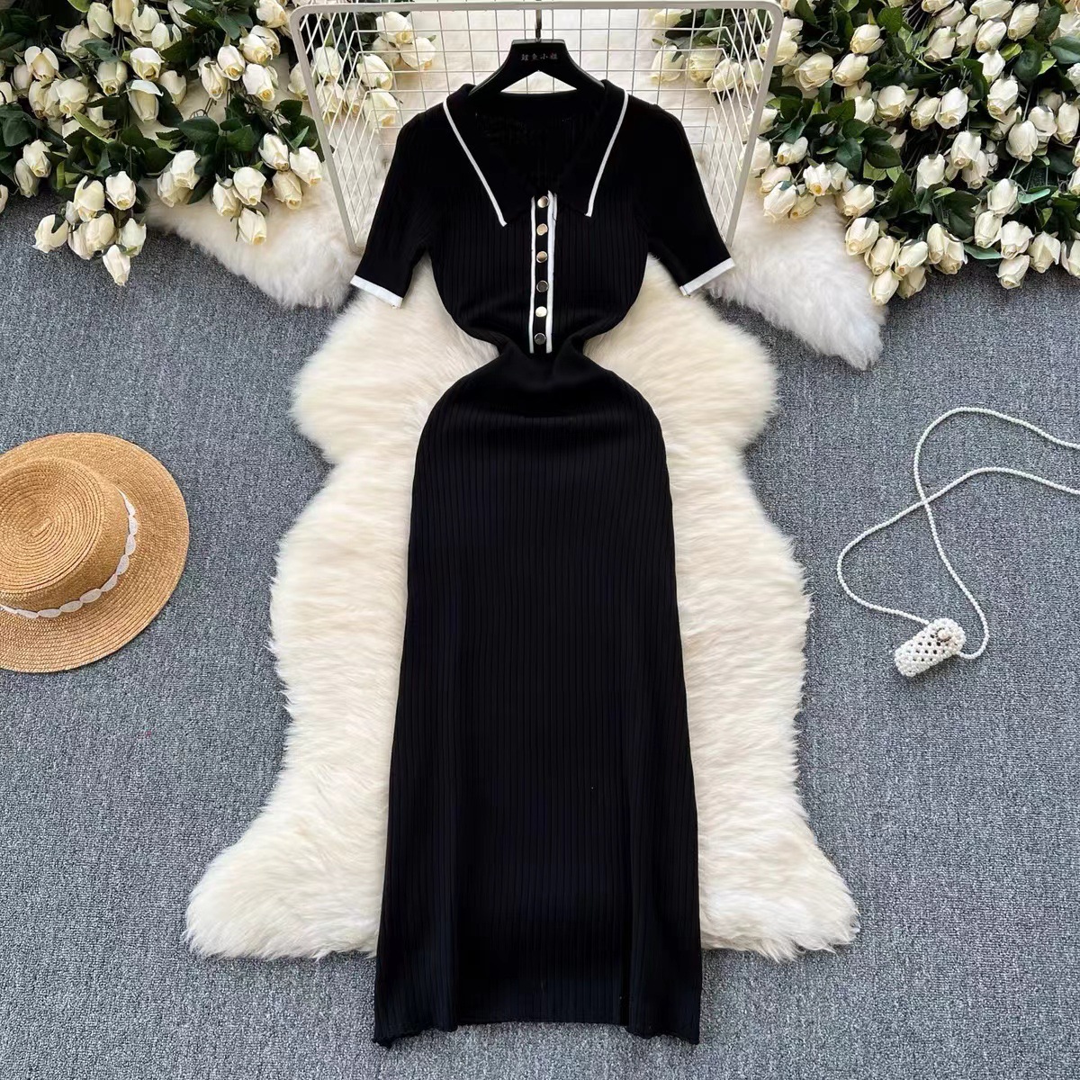 대외 무역 우아한 우아한 콘트라스트 옷깃 반팔 원피스 여성 웨이스트 간단한 슬림 핏 긴 원피스
