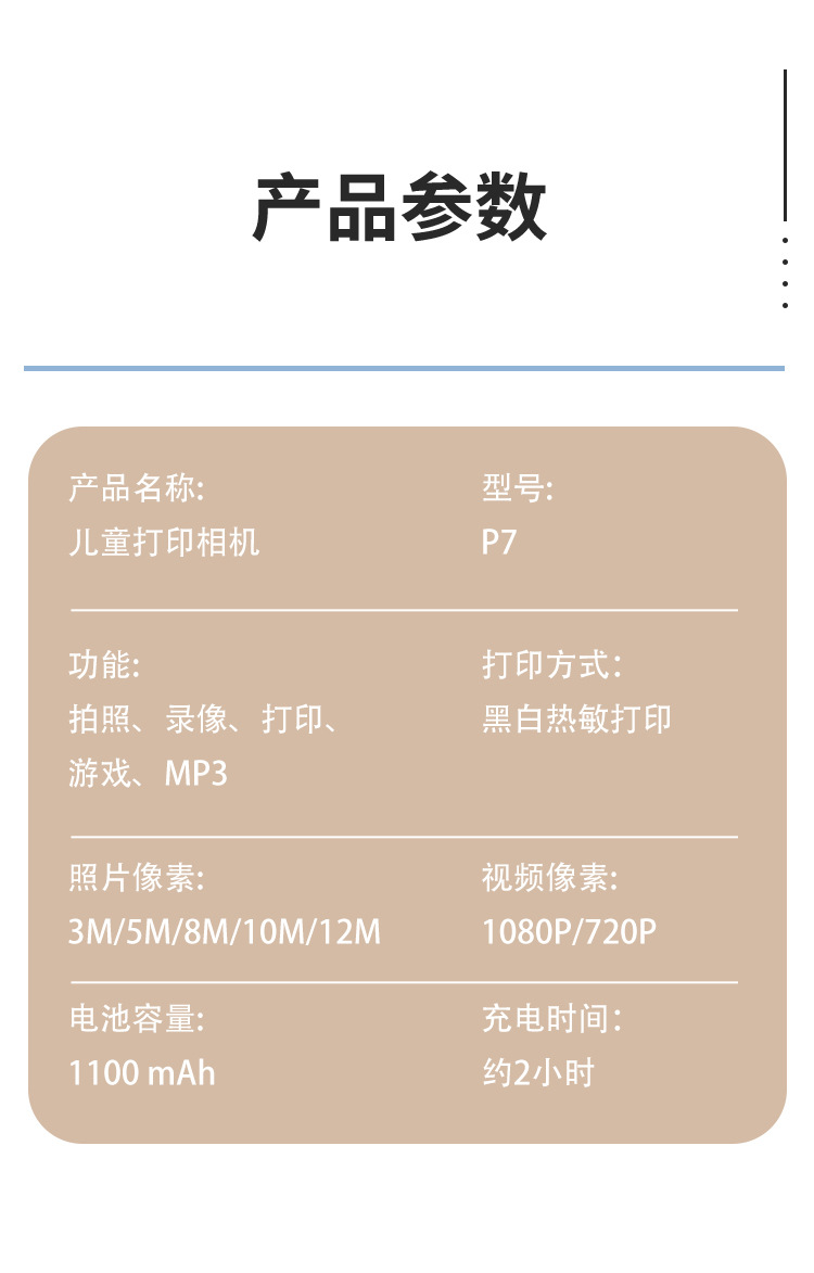 P7是2024年生产的最新儿童即时打印相机,采用精致的外壳设计,更适合图案定制。极简风格的外观可以设计成不同的卡通图案,以满足不同的市场需求,并易于通过OEM订单进行定制。P7采用720p硬件,确保良好的视频和图像质量,并热打印黑色和白色。它支持两种打印模式、三种打印密度和10级音量设置,以满足不同儿童和成人的视觉和使用习惯。10倍数码变焦、循环录音等多种功能。