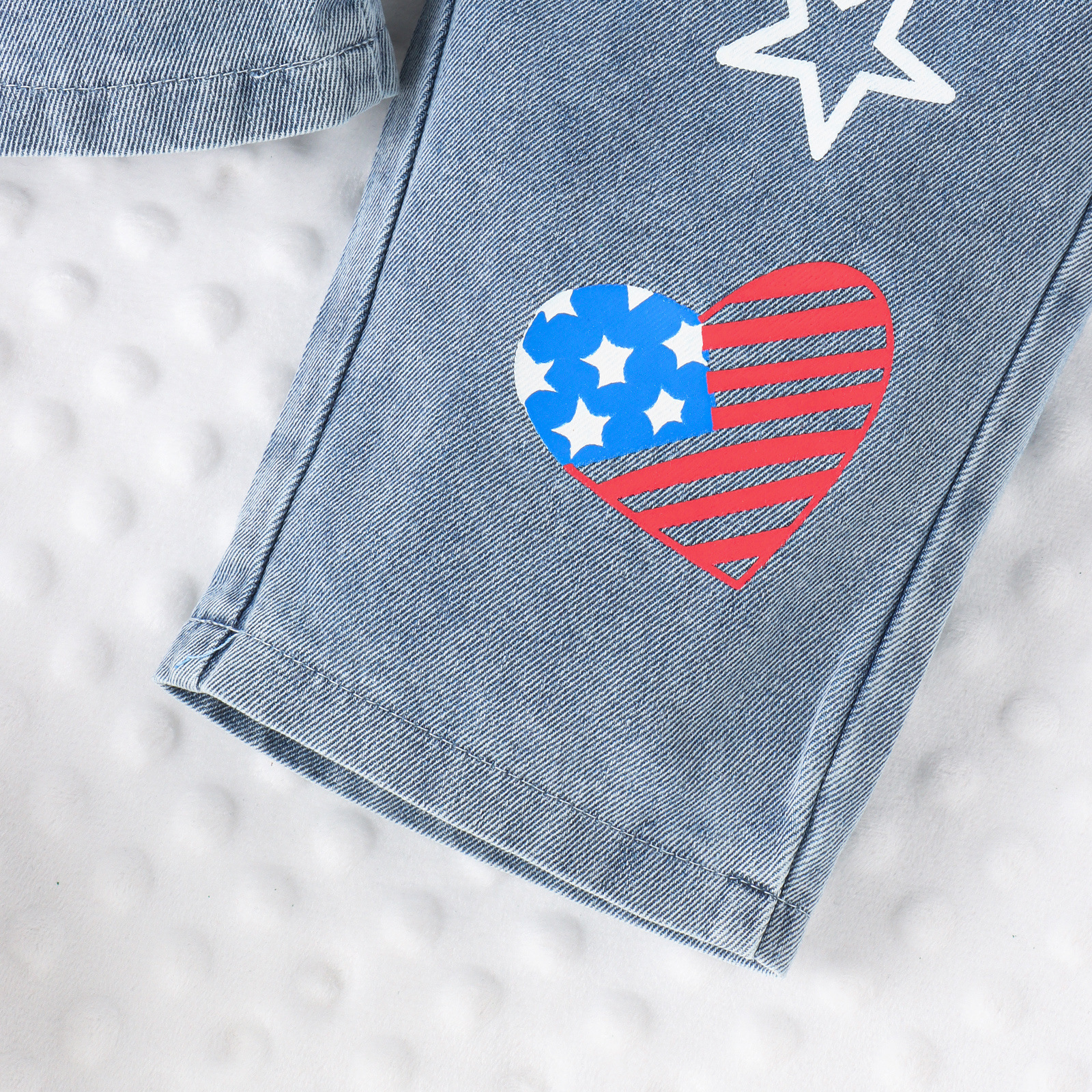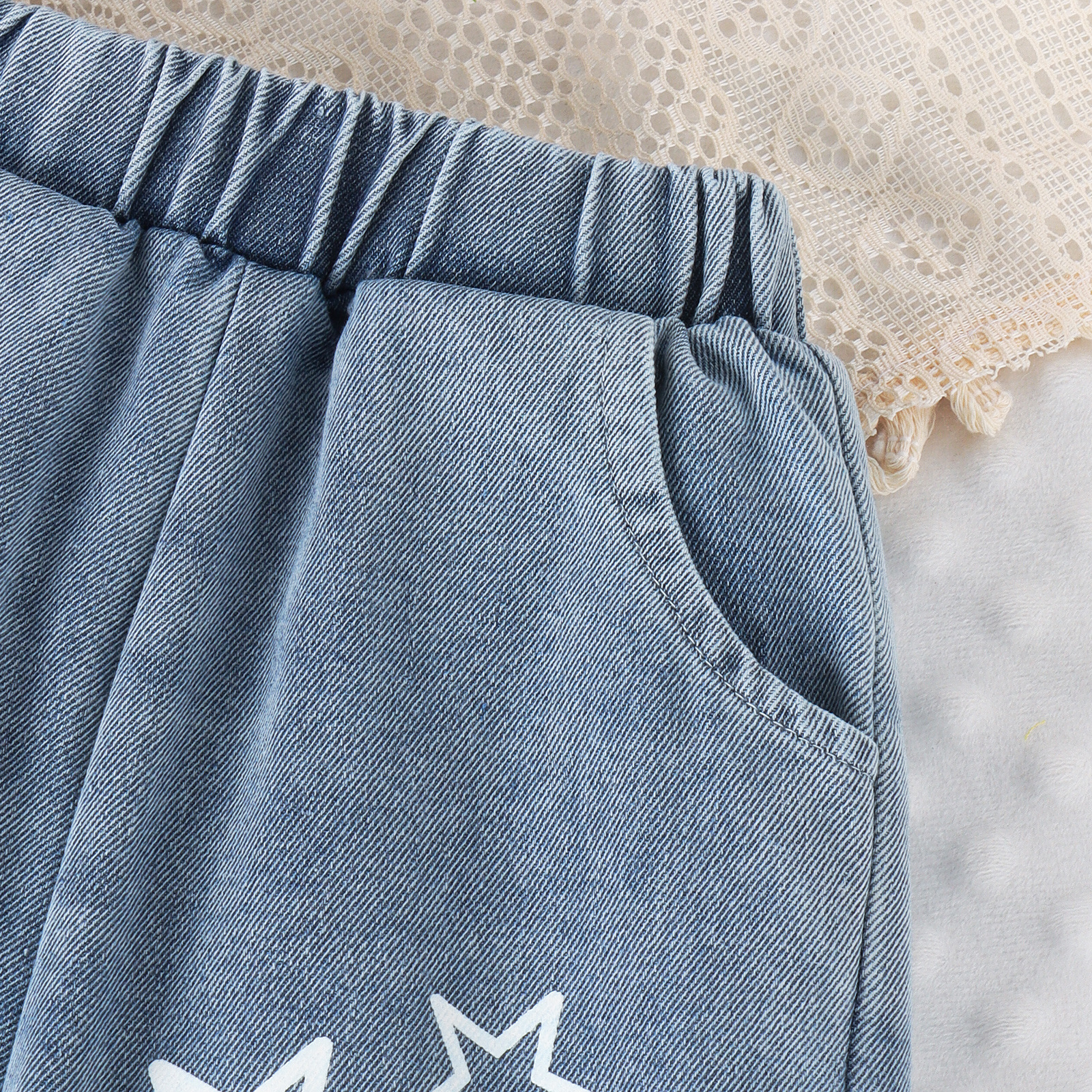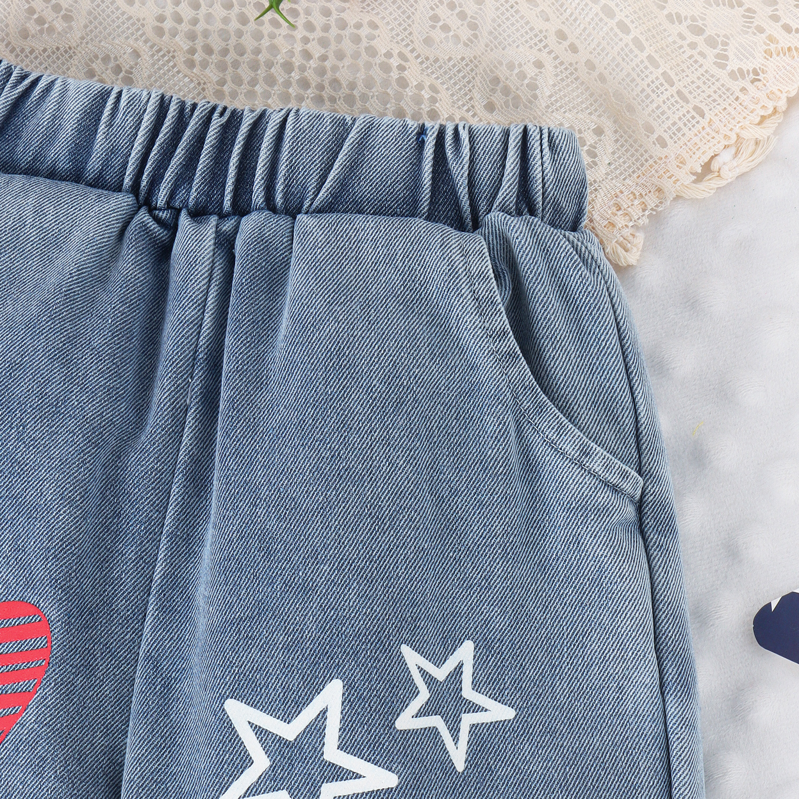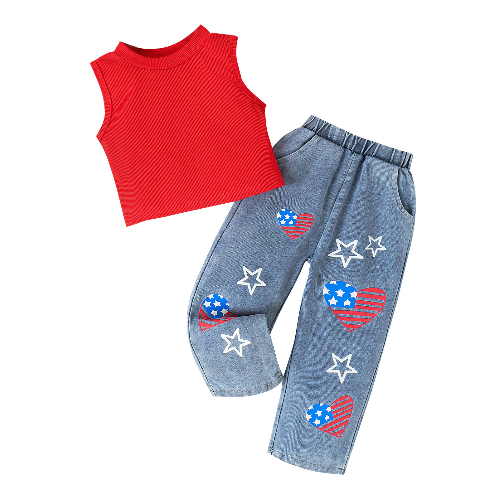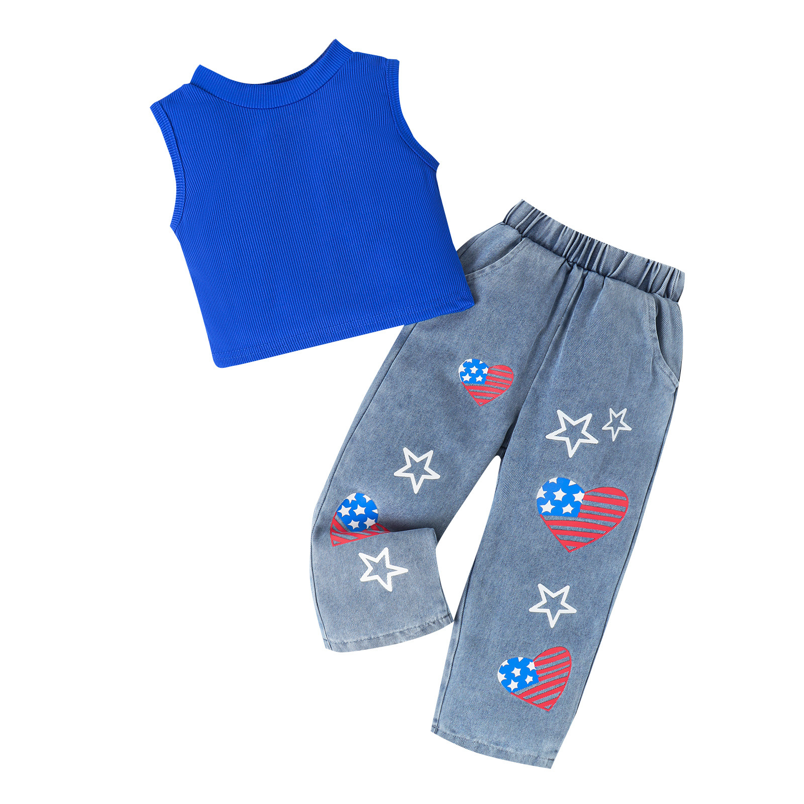 Baopin 아동복 아마존 여름 유럽과 미국의 새로운 소녀 세트 민소매 조끼 데님 인쇄 바지 2 피스 세트
