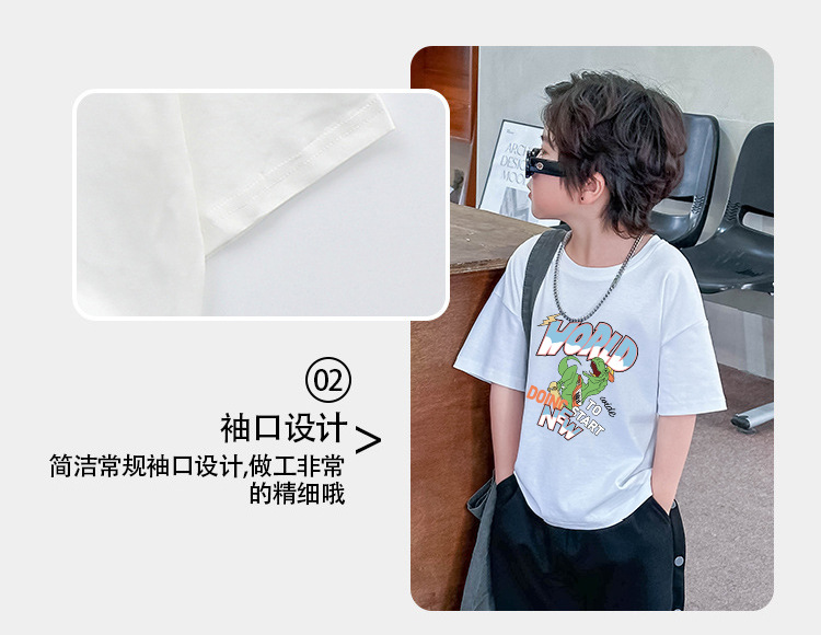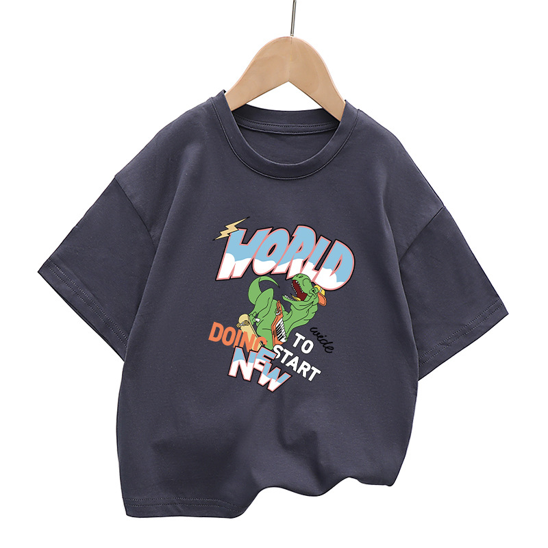 여름 얇은 어린이 티셔츠 반소매 소년 및 소녀 어깨 드롭 반소매 공룡 인쇄 면 상단 재고 트렌디스토어 가기