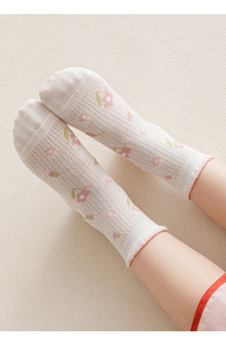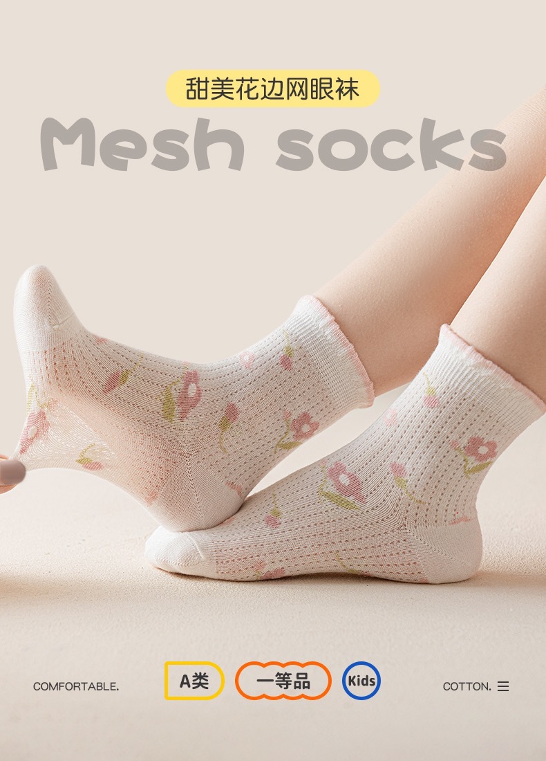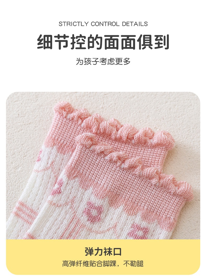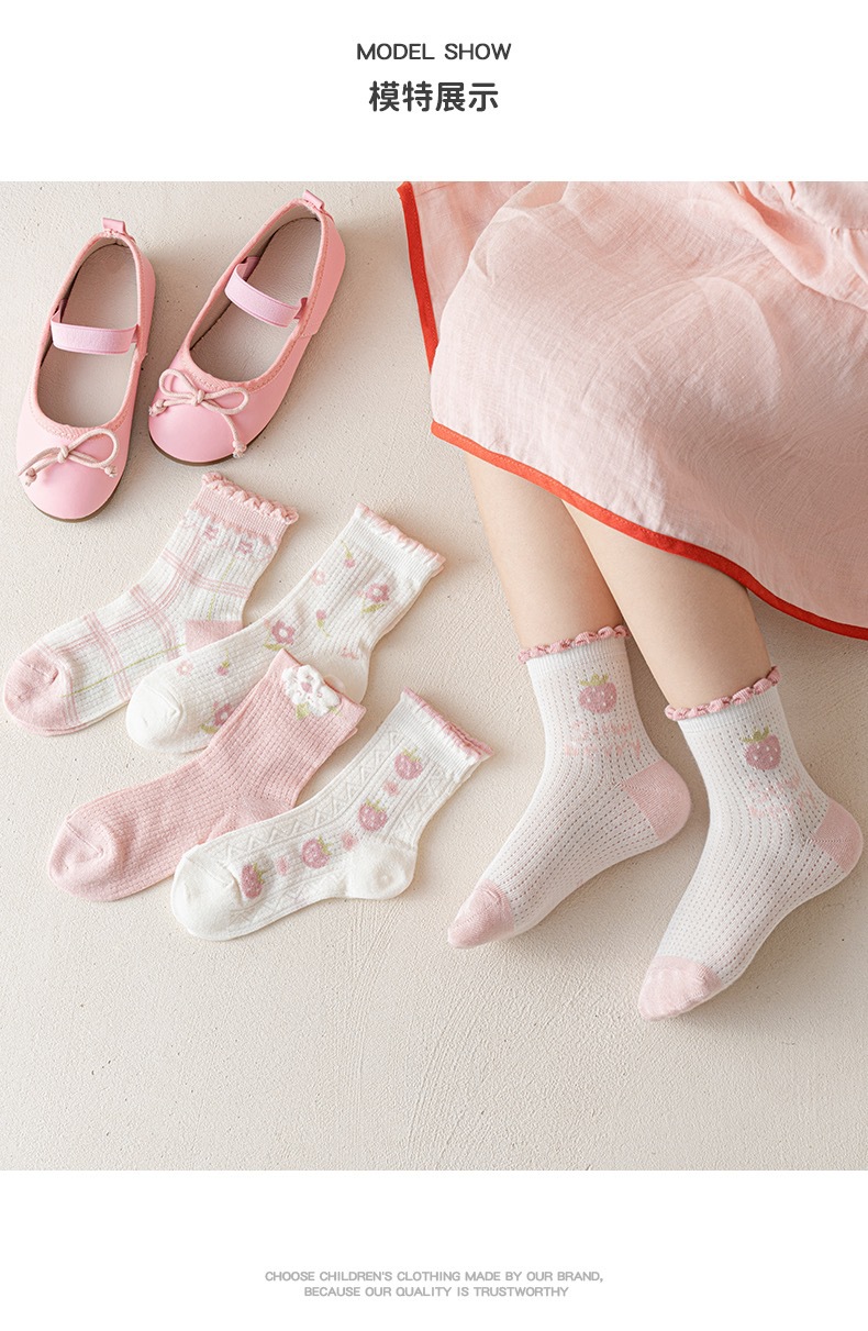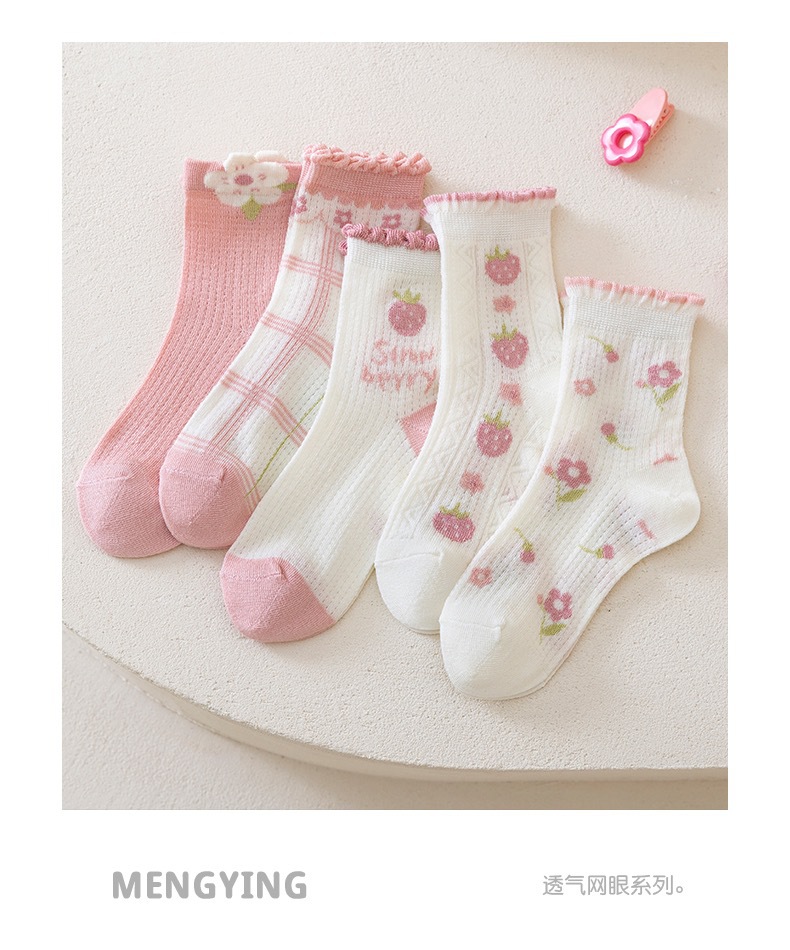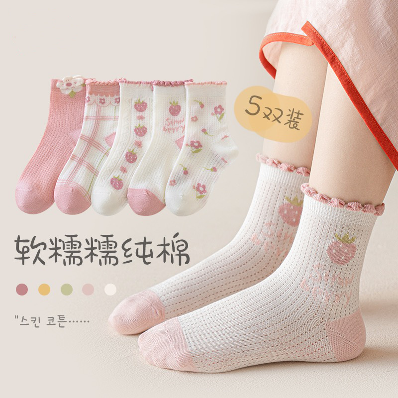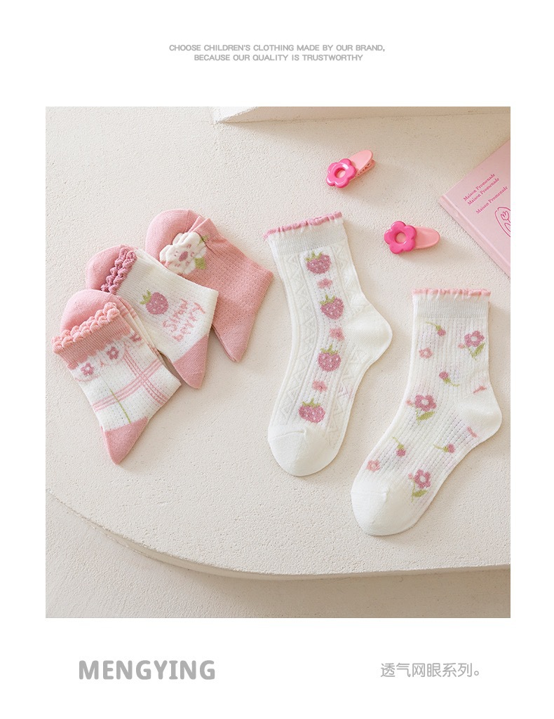 여자 양말 봄 얇은 어린이 면 양말 메쉬 통기성 소녀 딸기 레이스 미드 튜브 양말 아기 공주 양말