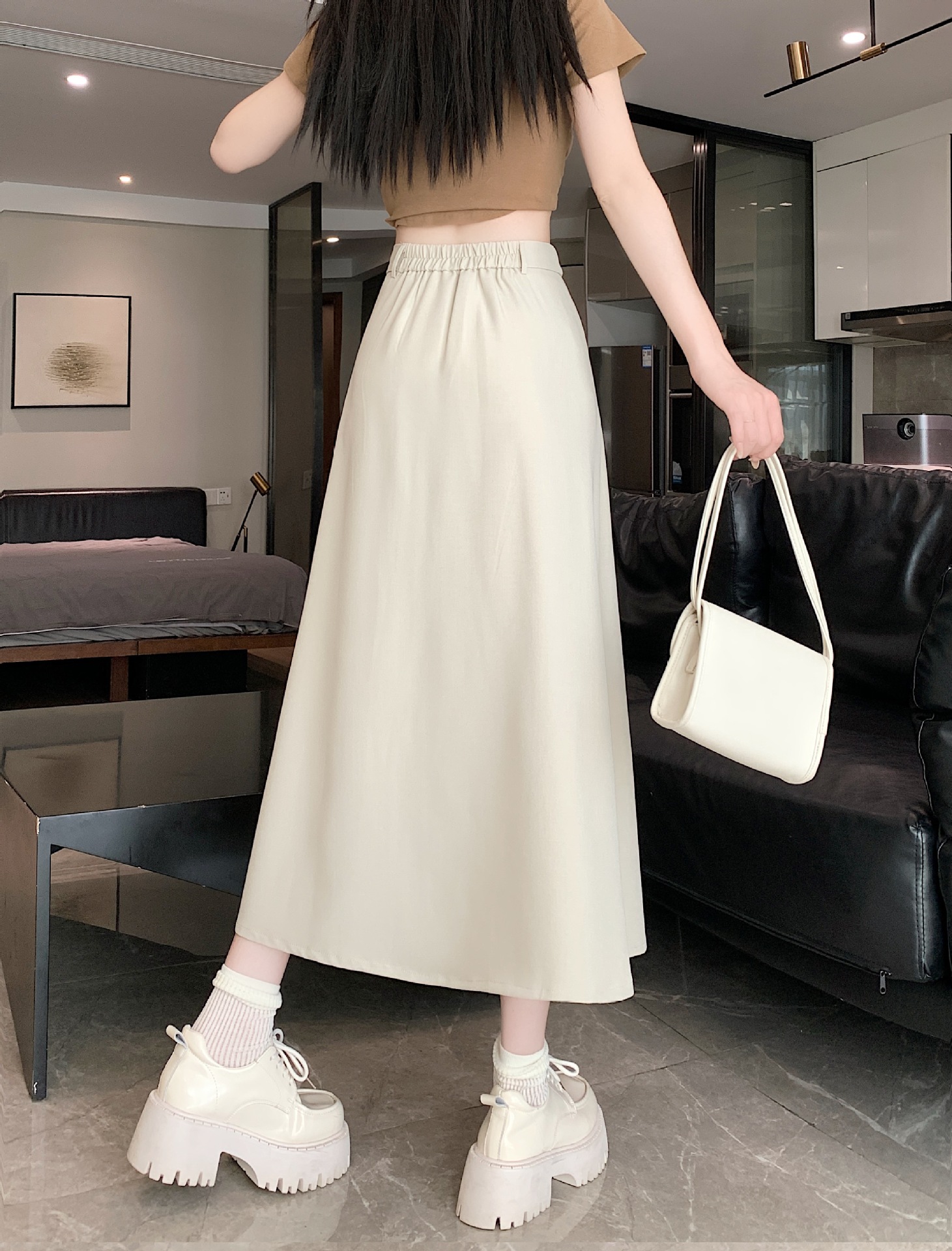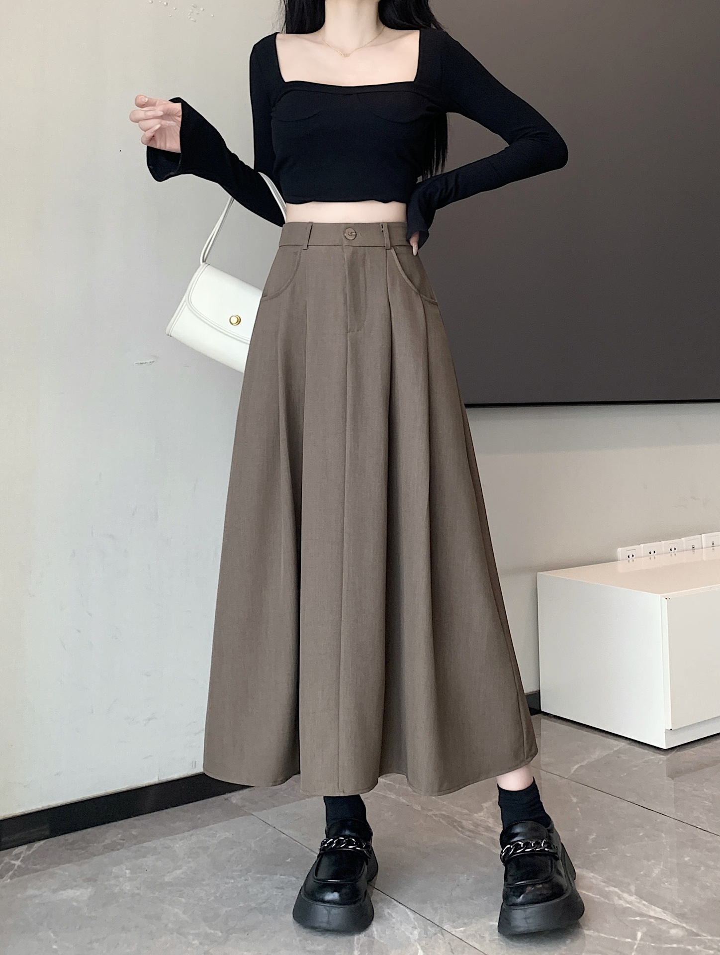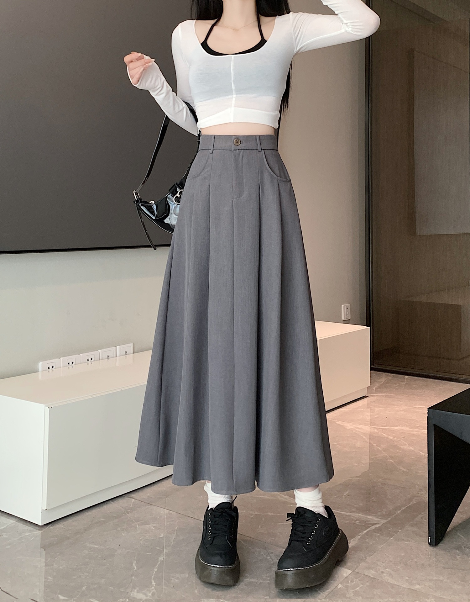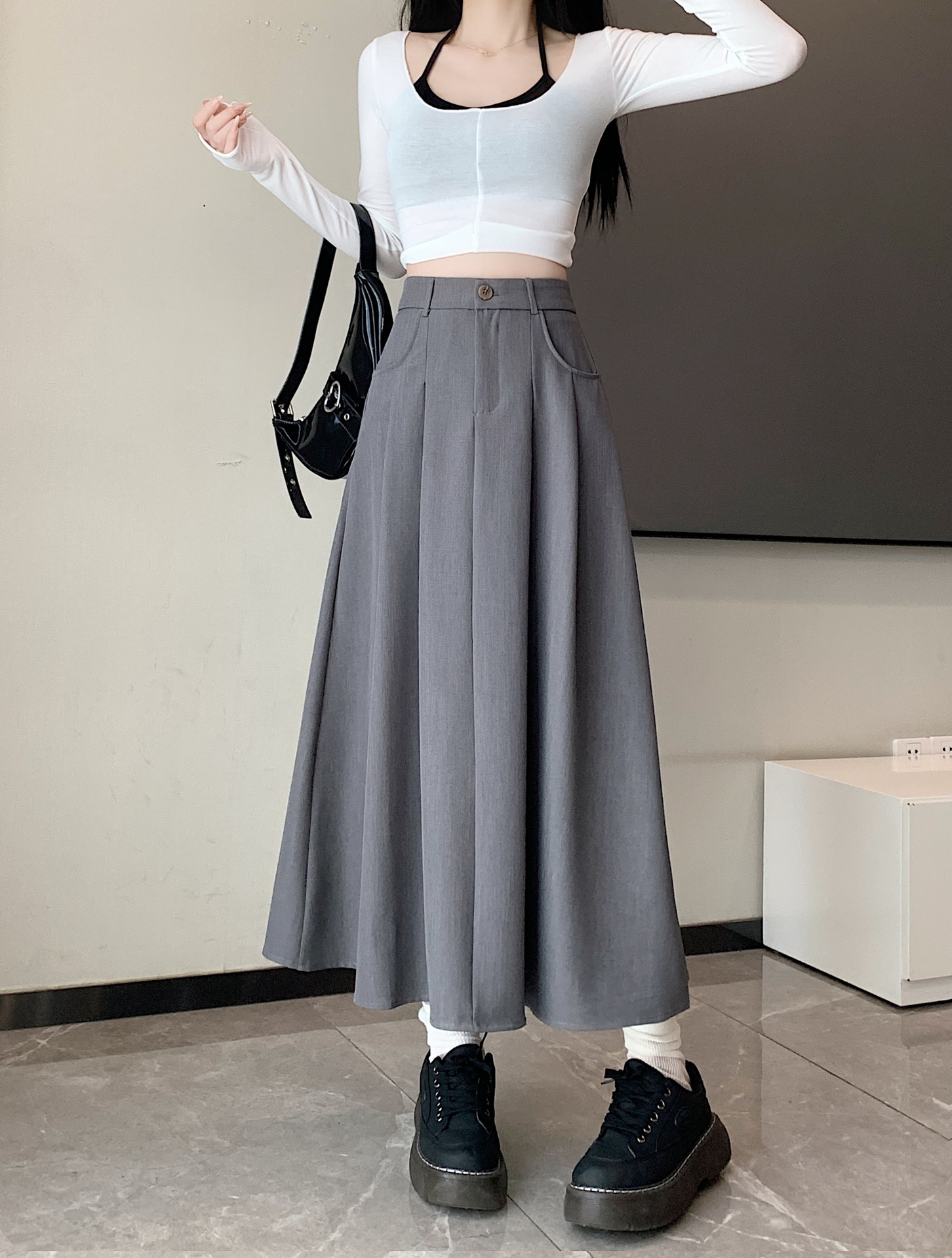 세트 패브릭 스커트 여성용 봄과 가을 새로운 캐주얼 A 라인 스커트 높은 허리 슬리밍 한국식 롱 스커트스토어 가기