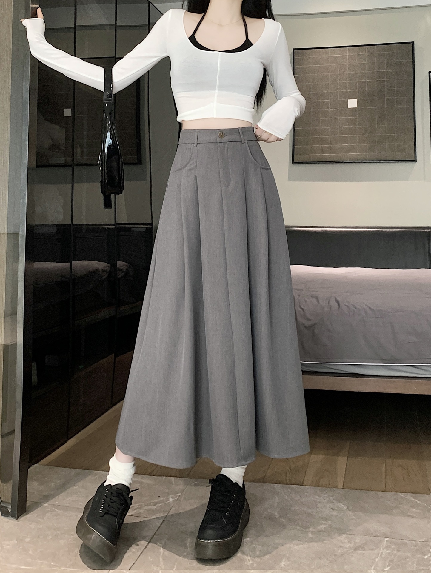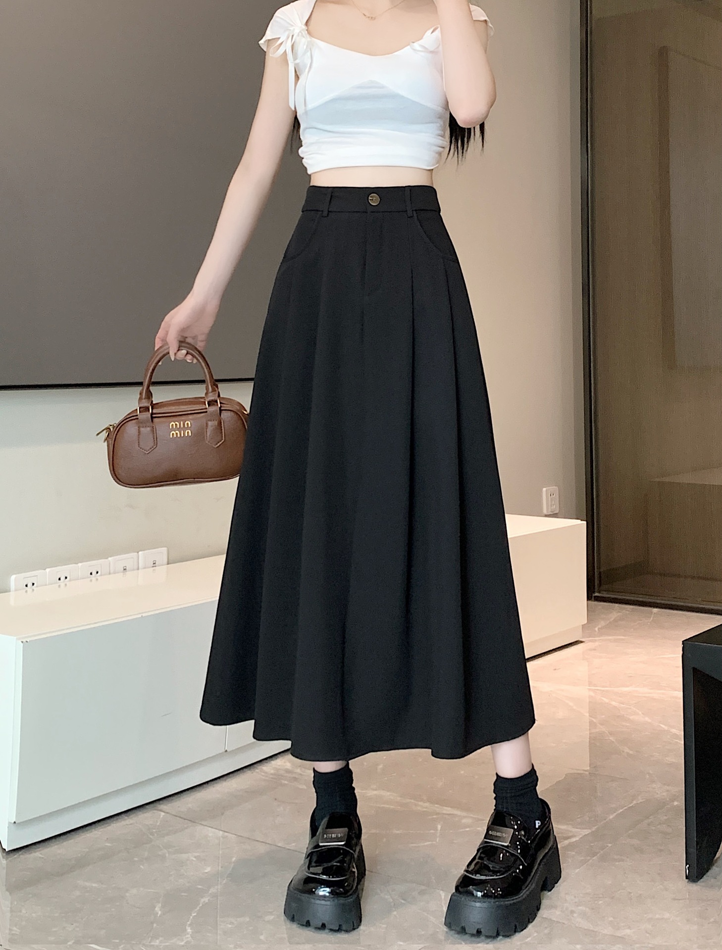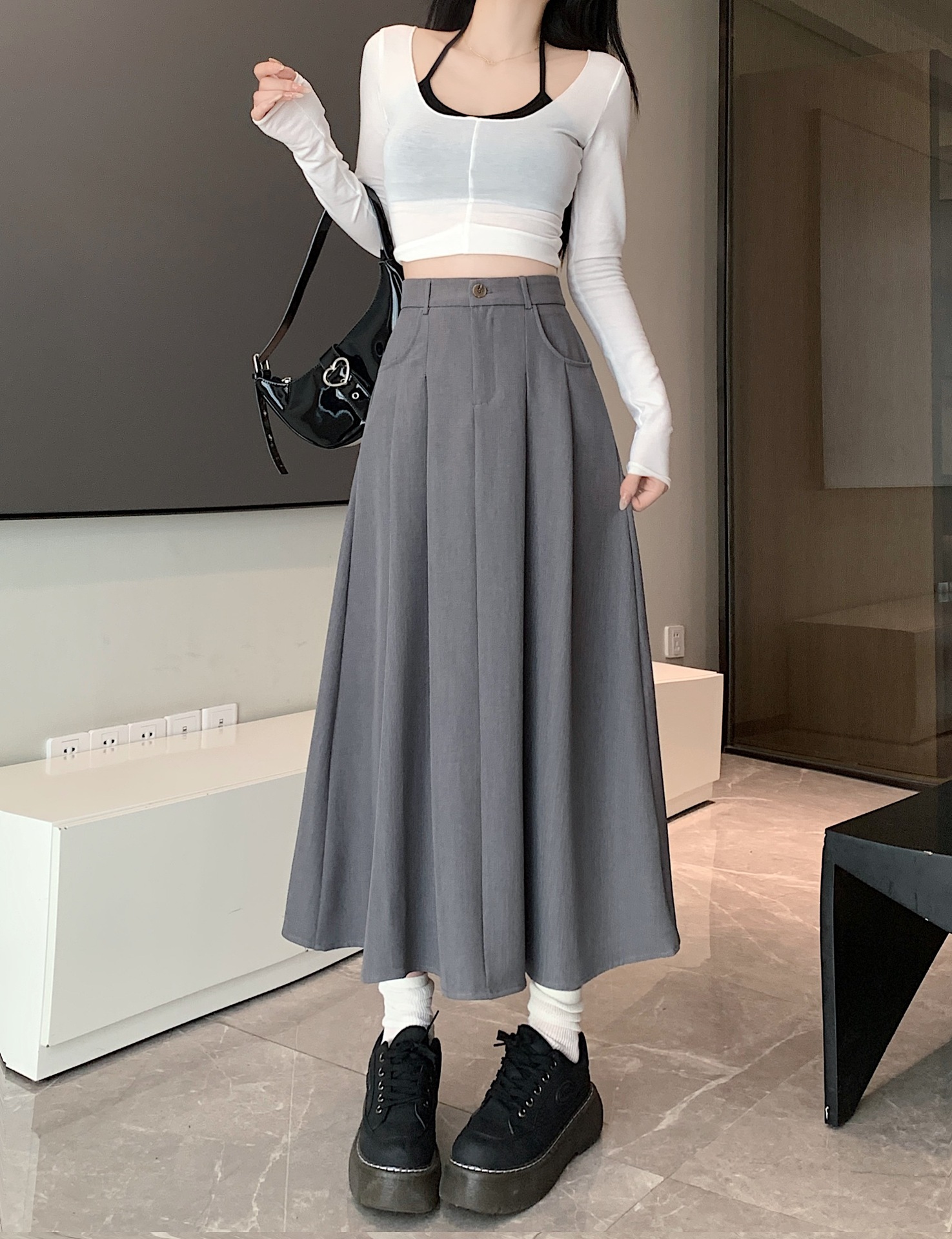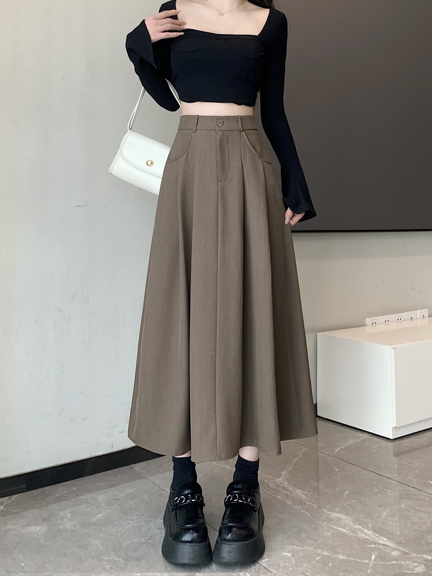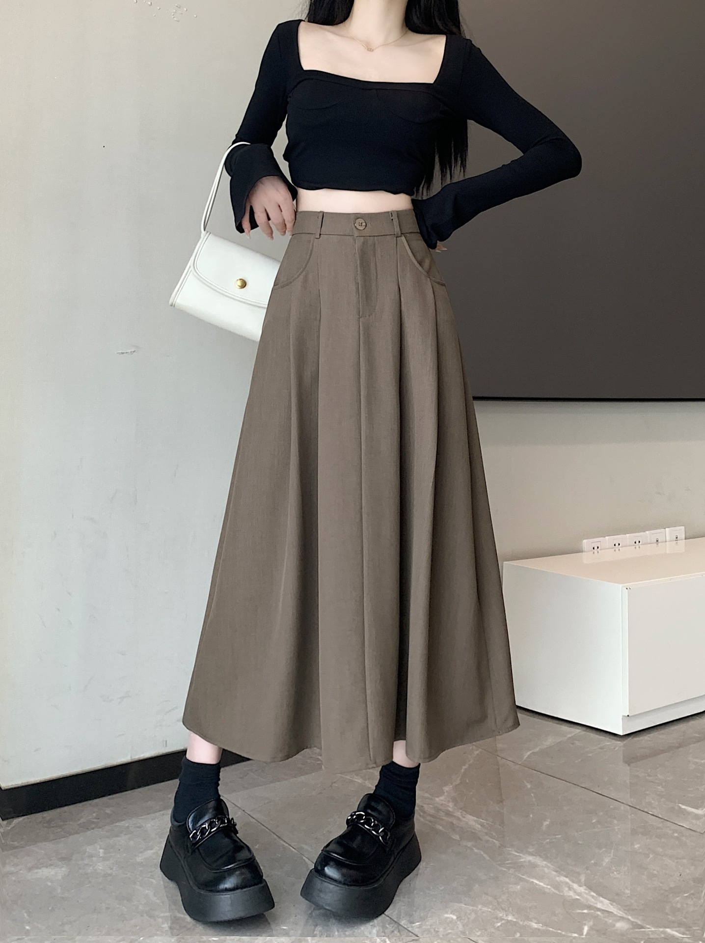 세트 패브릭 스커트 여성용 봄과 가을 새로운 캐주얼 A 라인 스커트 높은 허리 슬리밍 한국식 롱 스커트스토어 가기