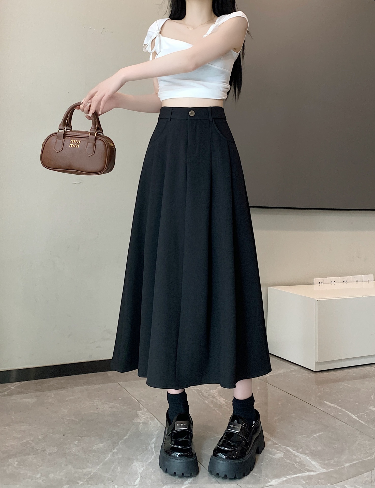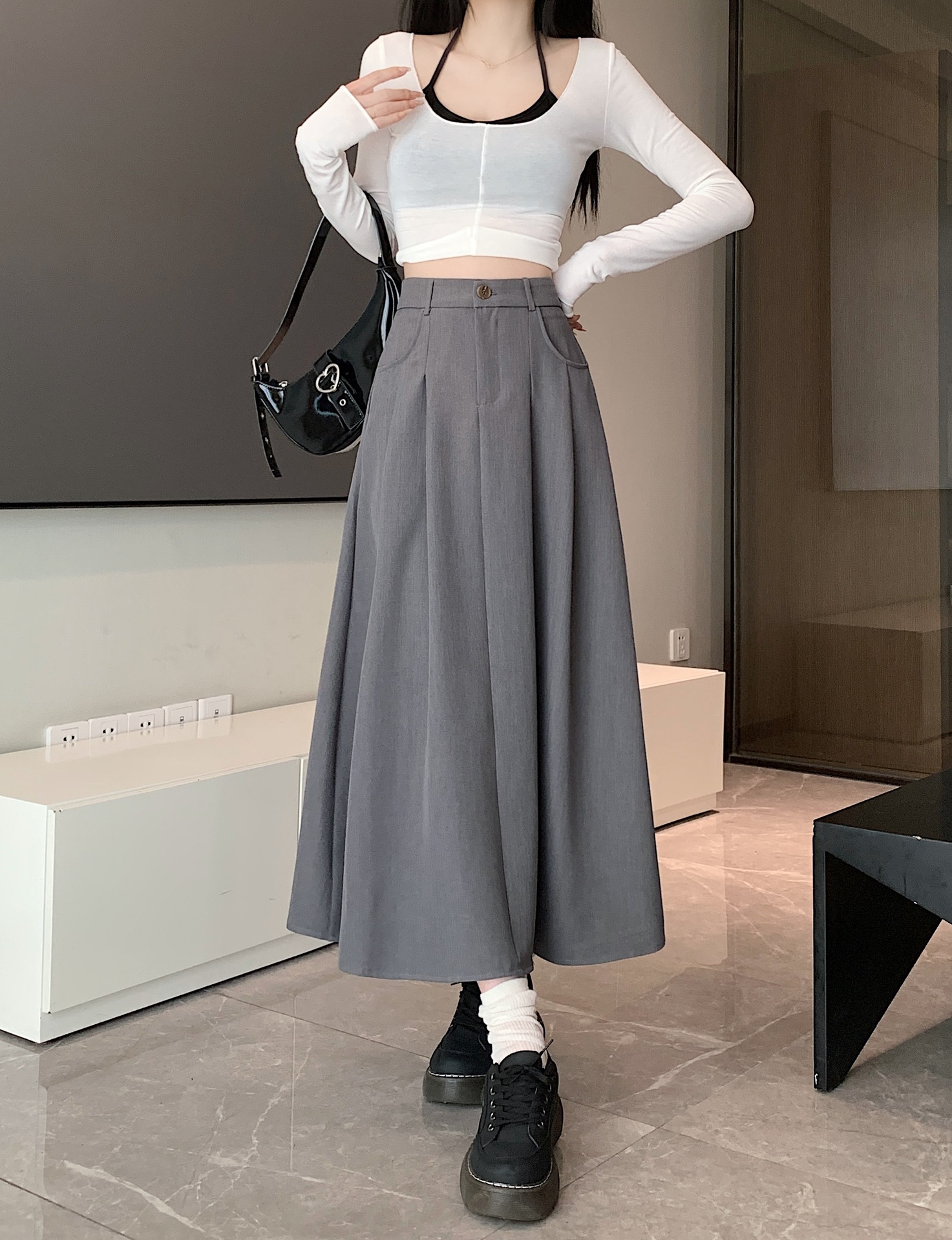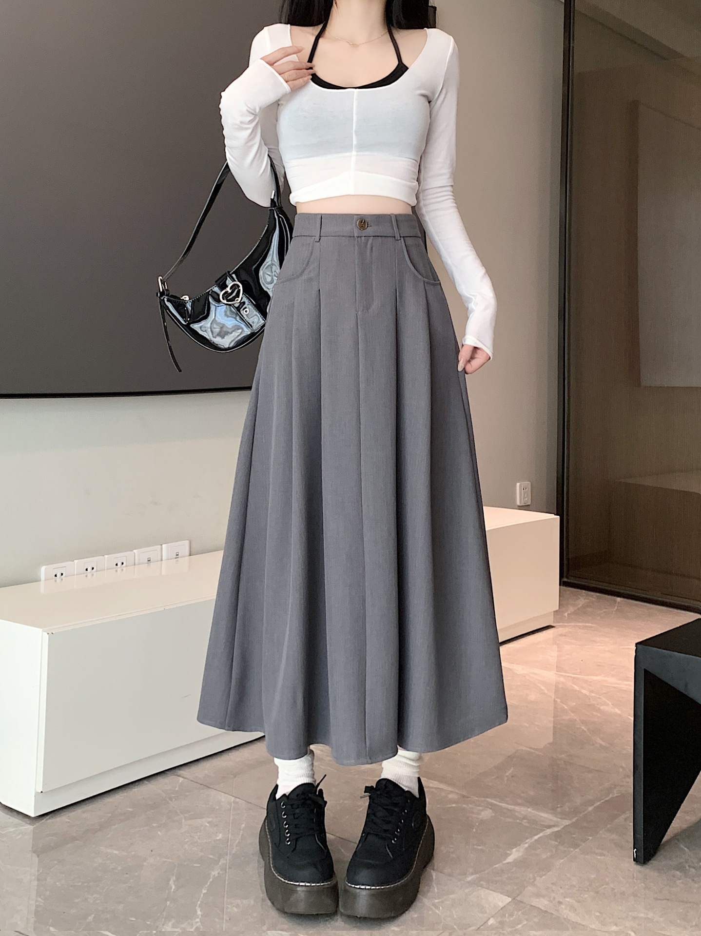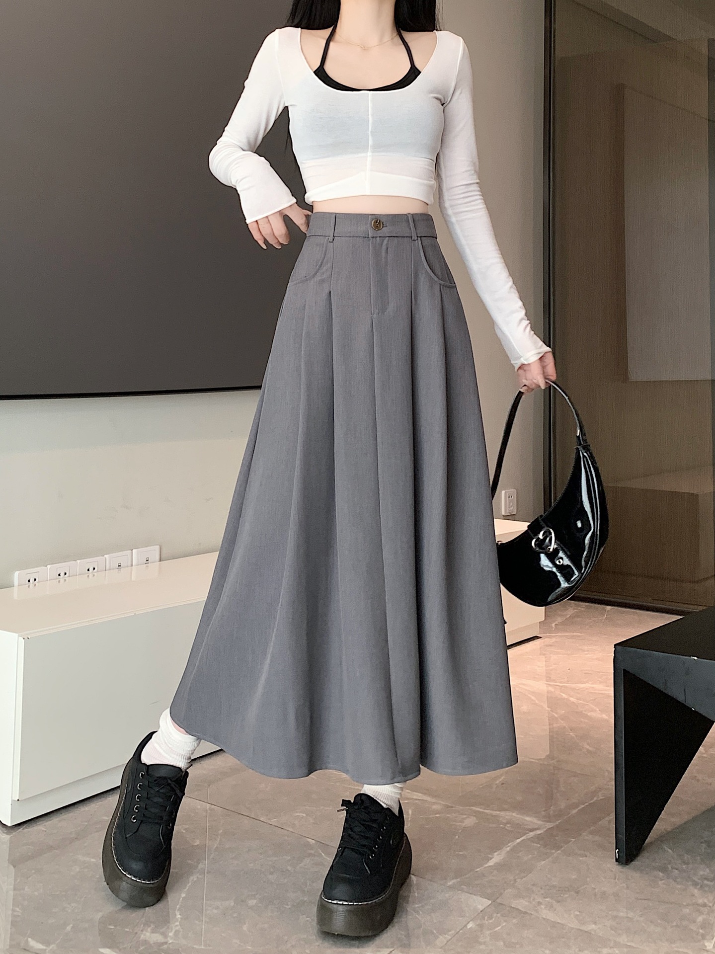 세트 패브릭 스커트 여성용 봄과 가을 새로운 캐주얼 A 라인 스커트 높은 허리 슬리밍 한국식 롱 스커트스토어 가기