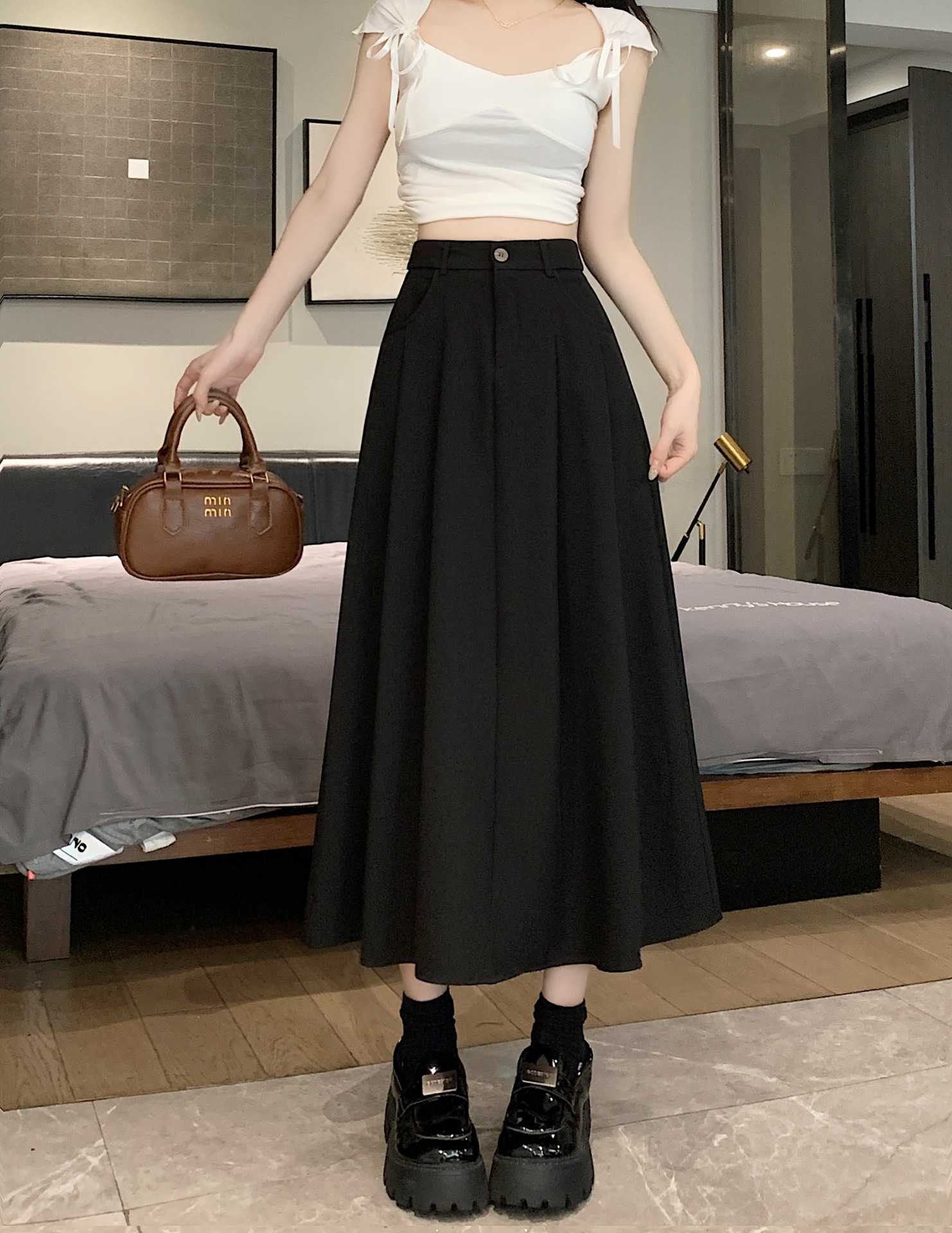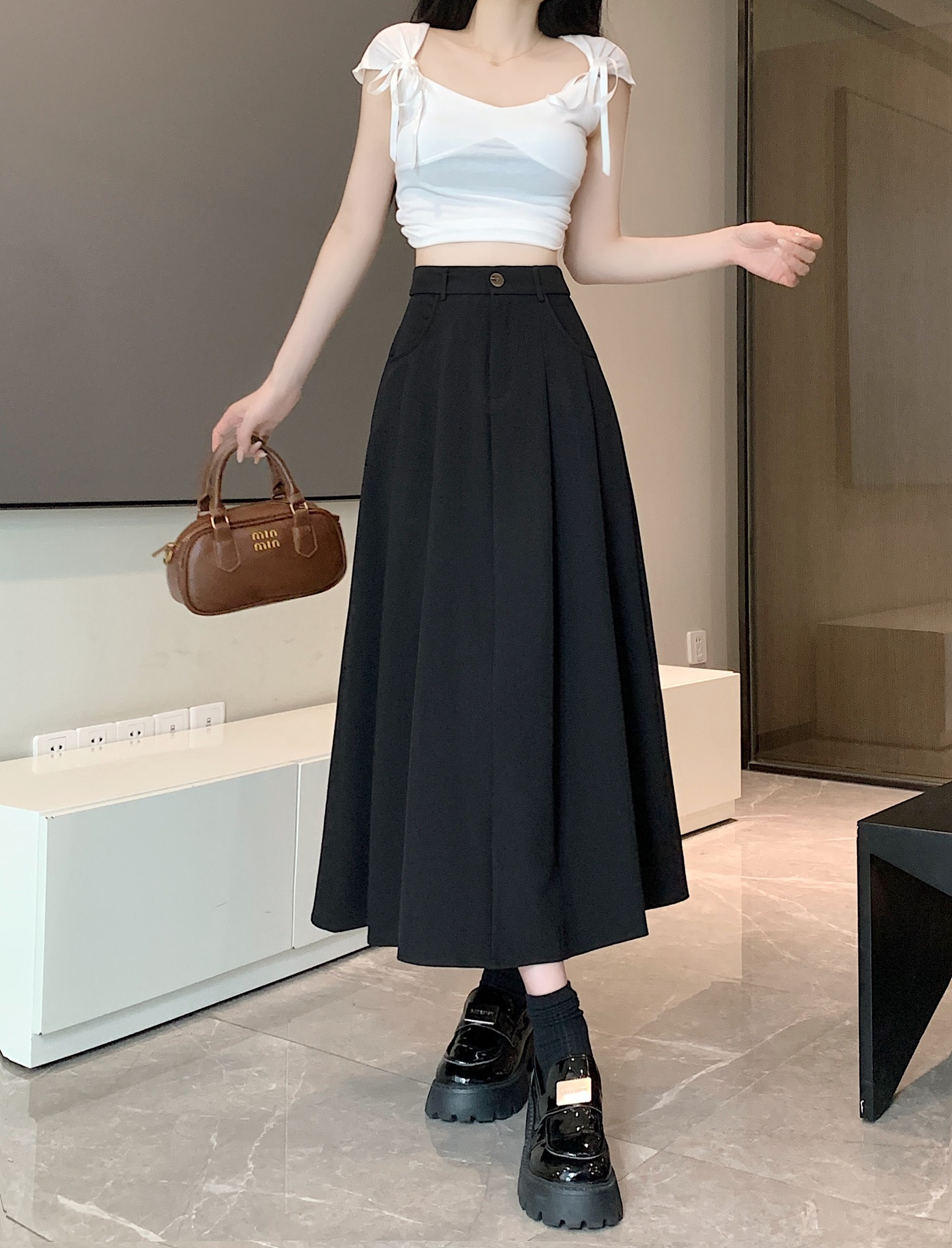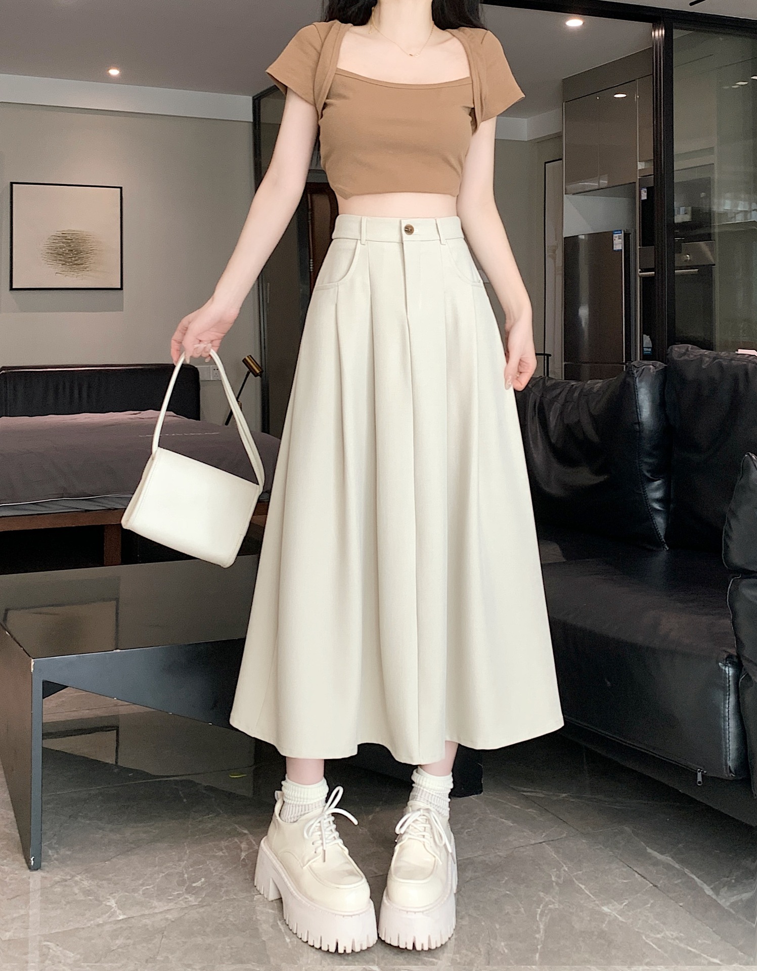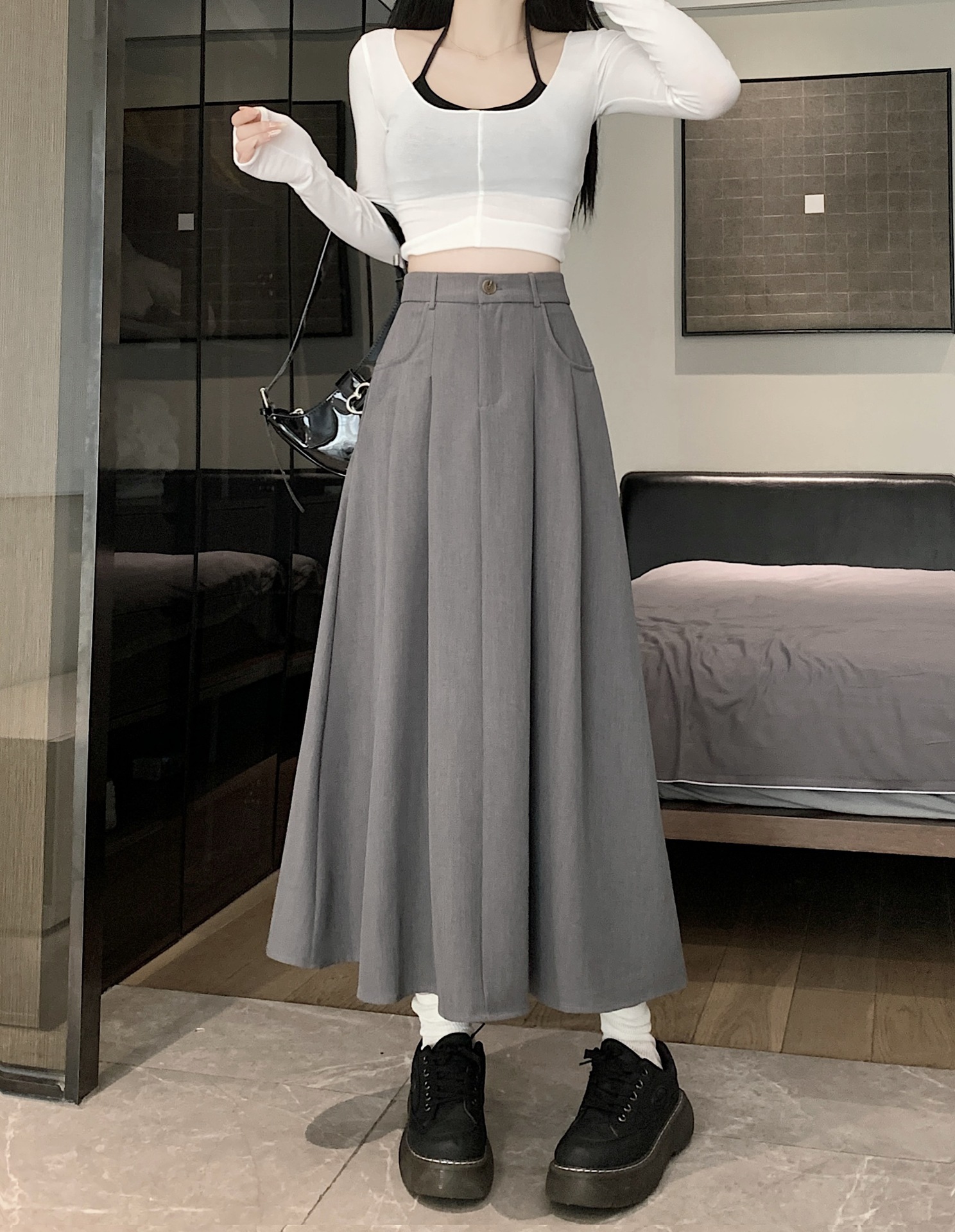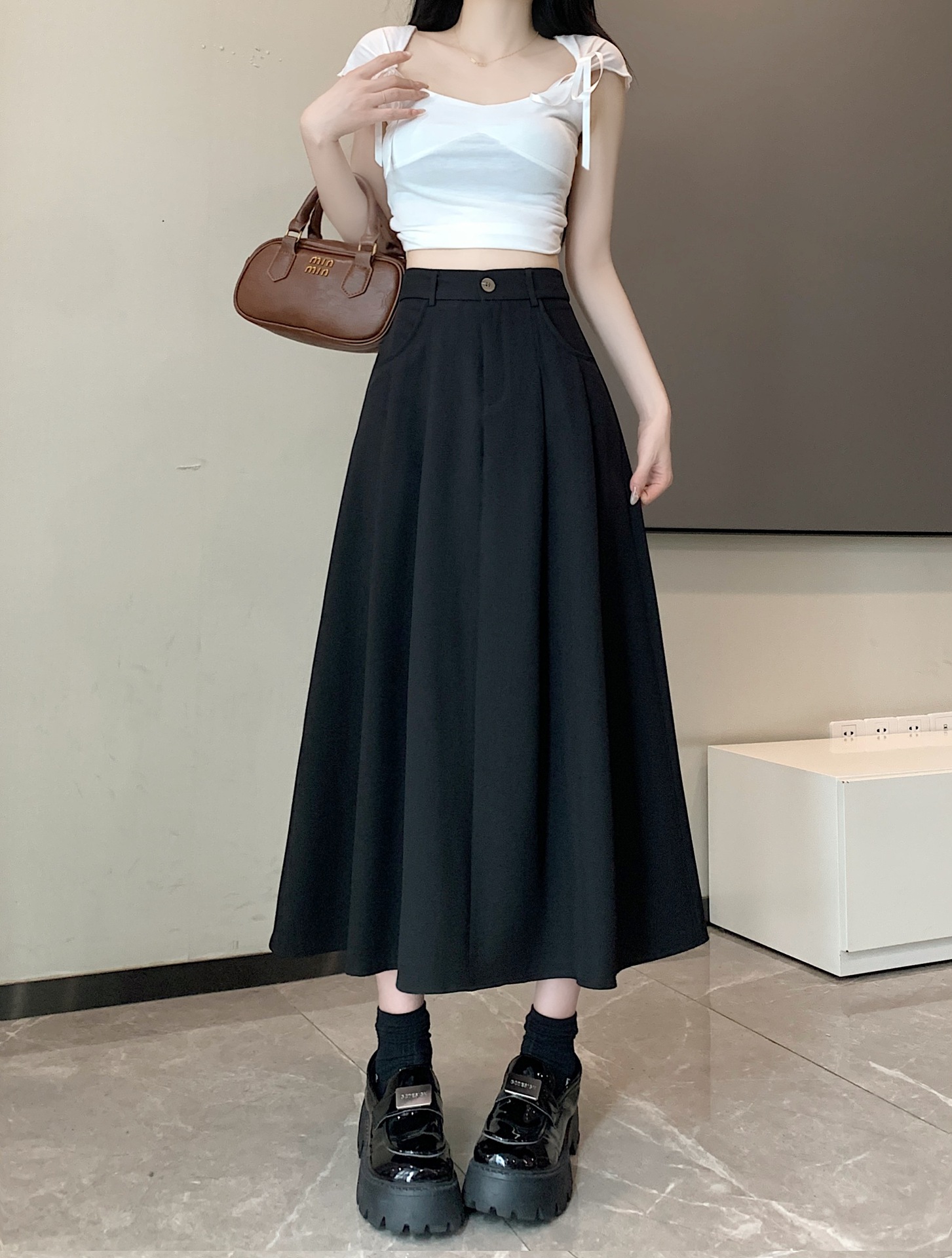 세트 패브릭 스커트 여성용 봄과 가을 새로운 캐주얼 A 라인 스커트 높은 허리 슬리밍 한국식 롱 스커트스토어 가기