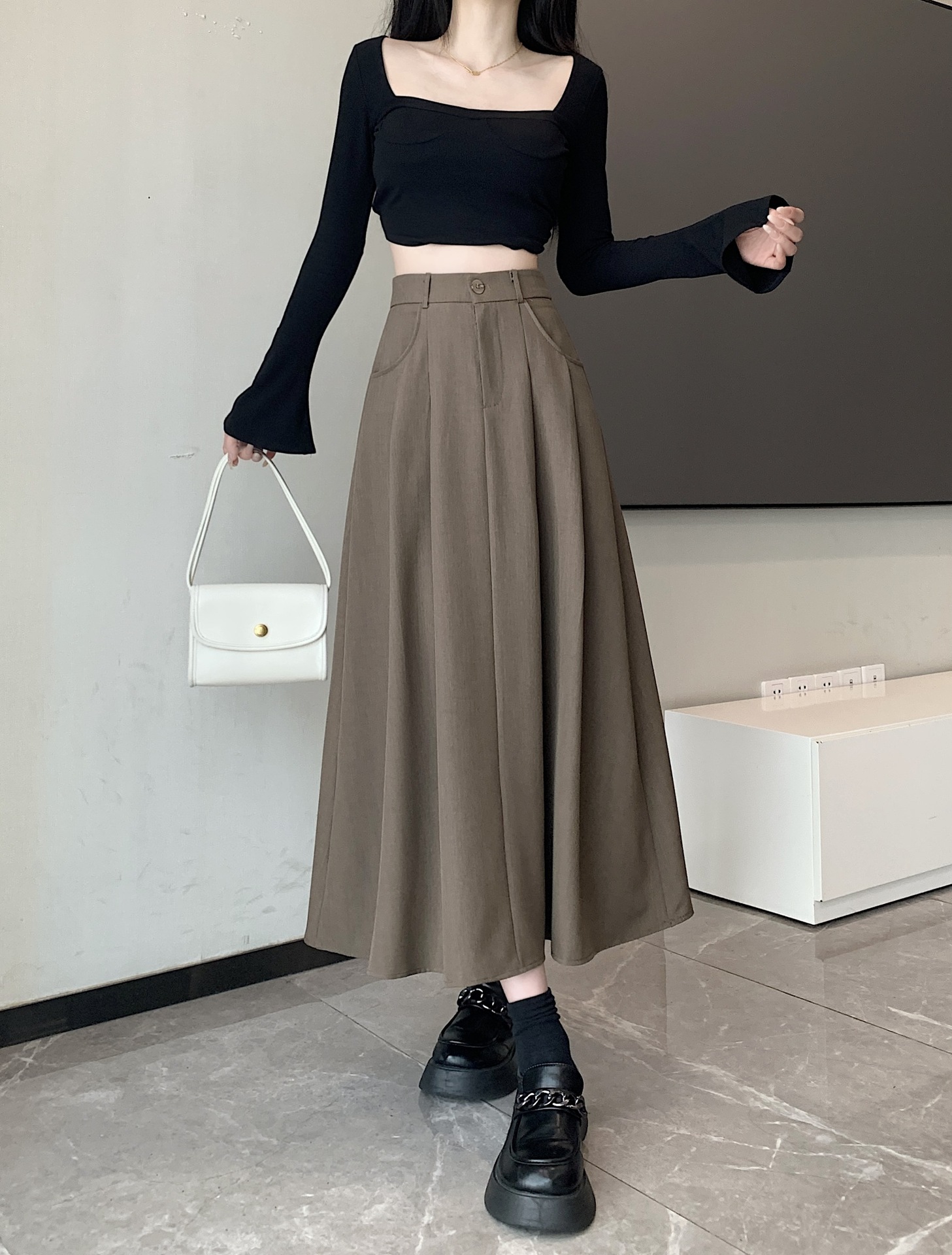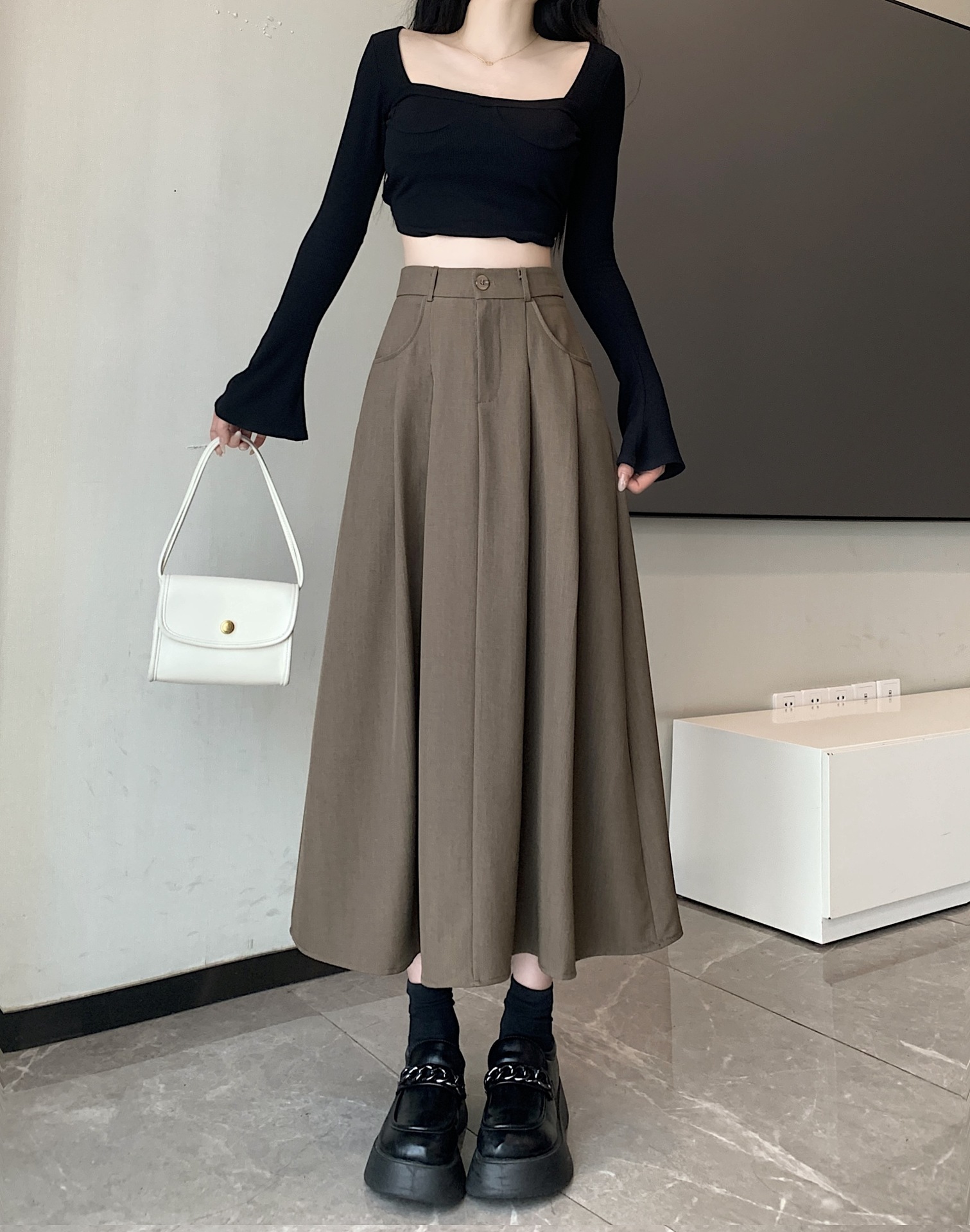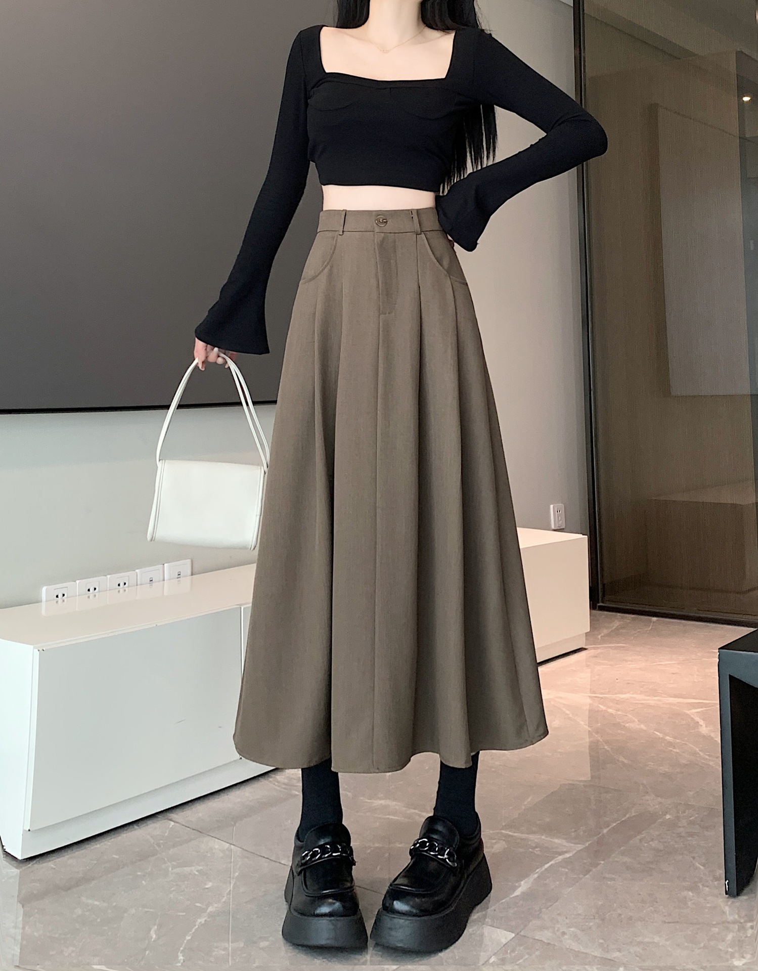 세트 패브릭 스커트 여성용 봄과 가을 새로운 캐주얼 A 라인 스커트 높은 허리 슬리밍 한국식 롱 스커트
