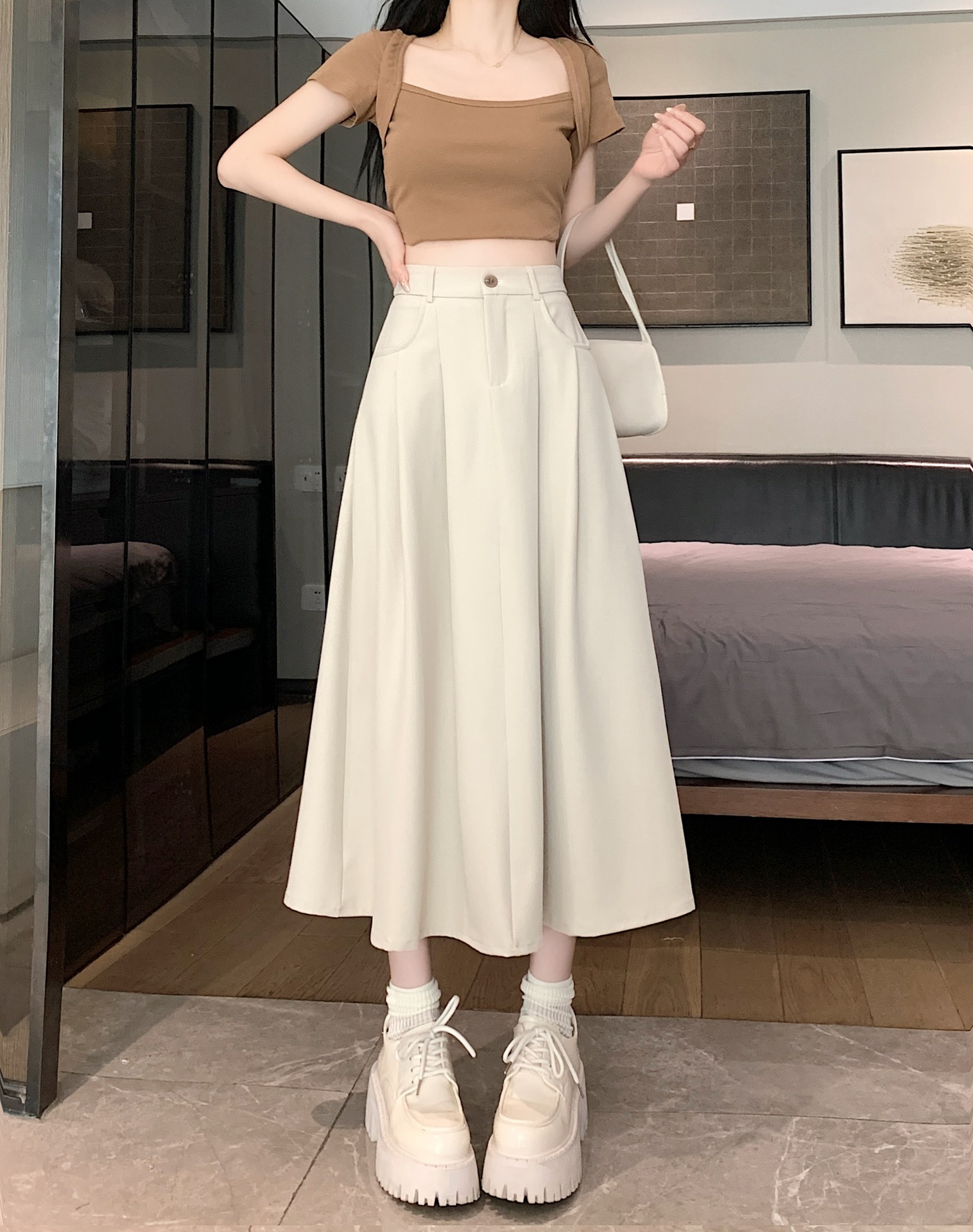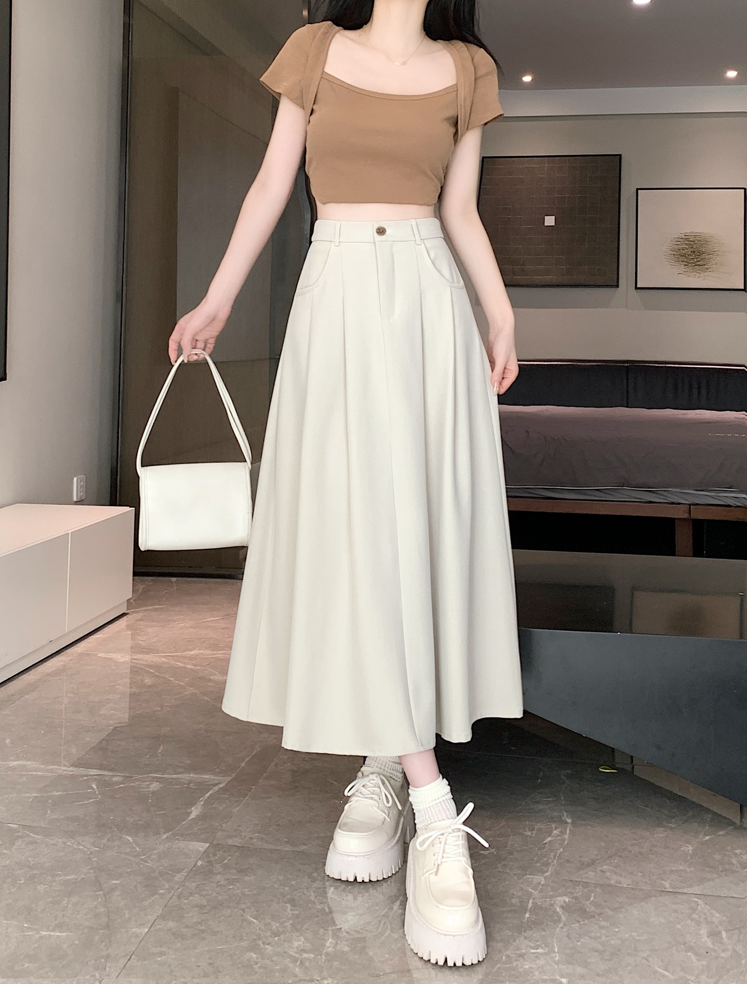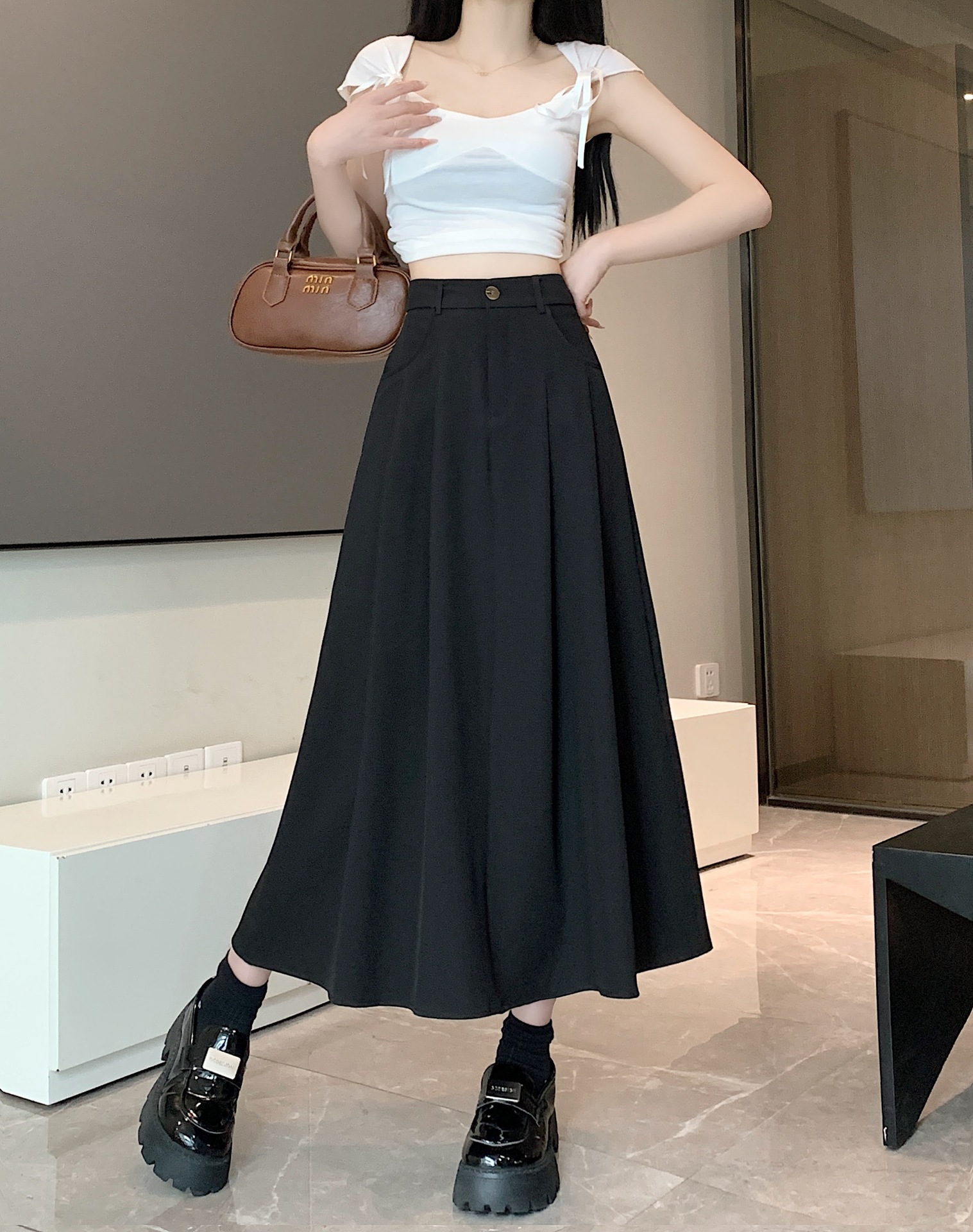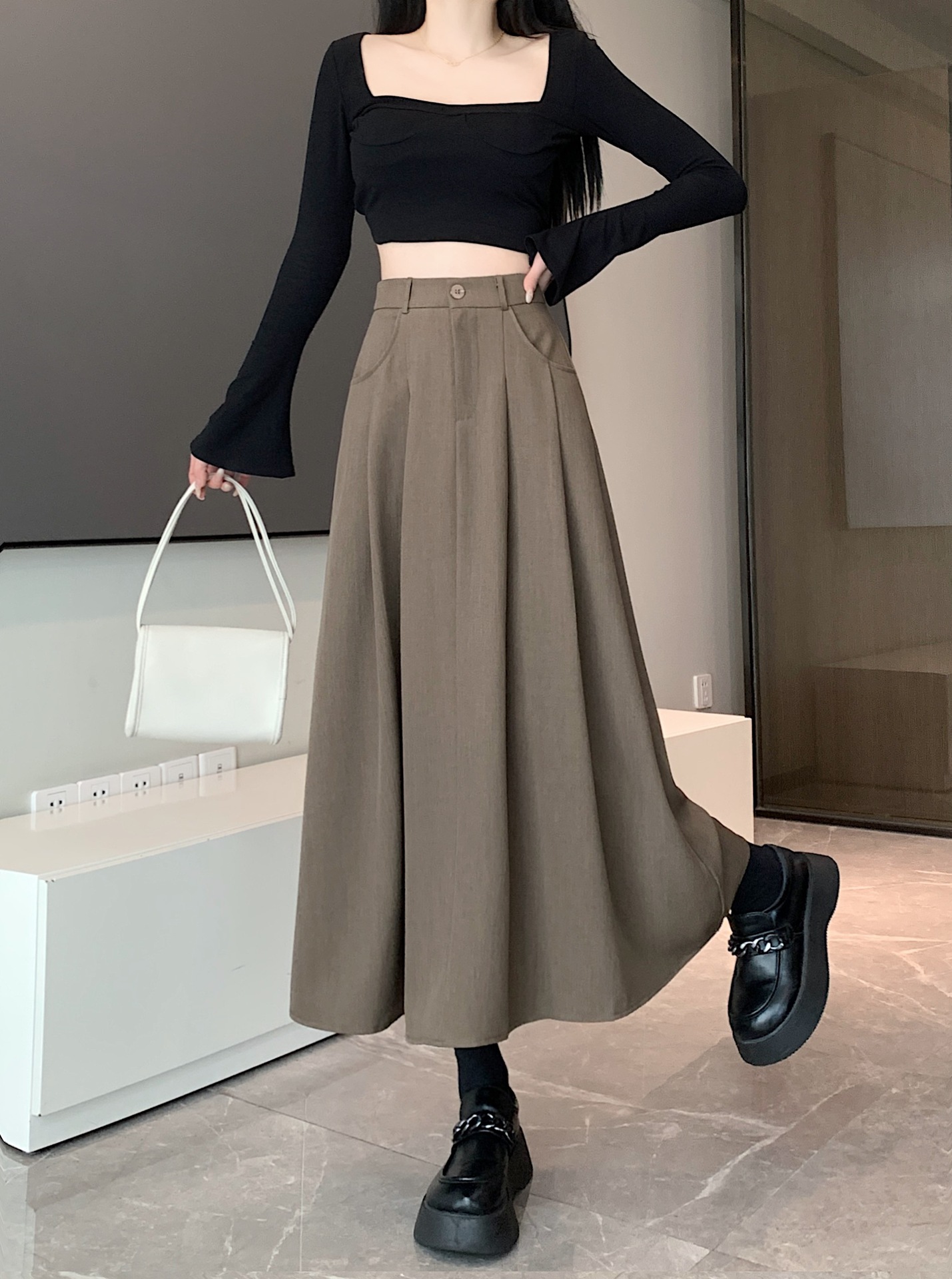 세트 패브릭 스커트 여성용 봄과 가을 새로운 캐주얼 A 라인 스커트 높은 허리 슬리밍 한국식 롱 스커트