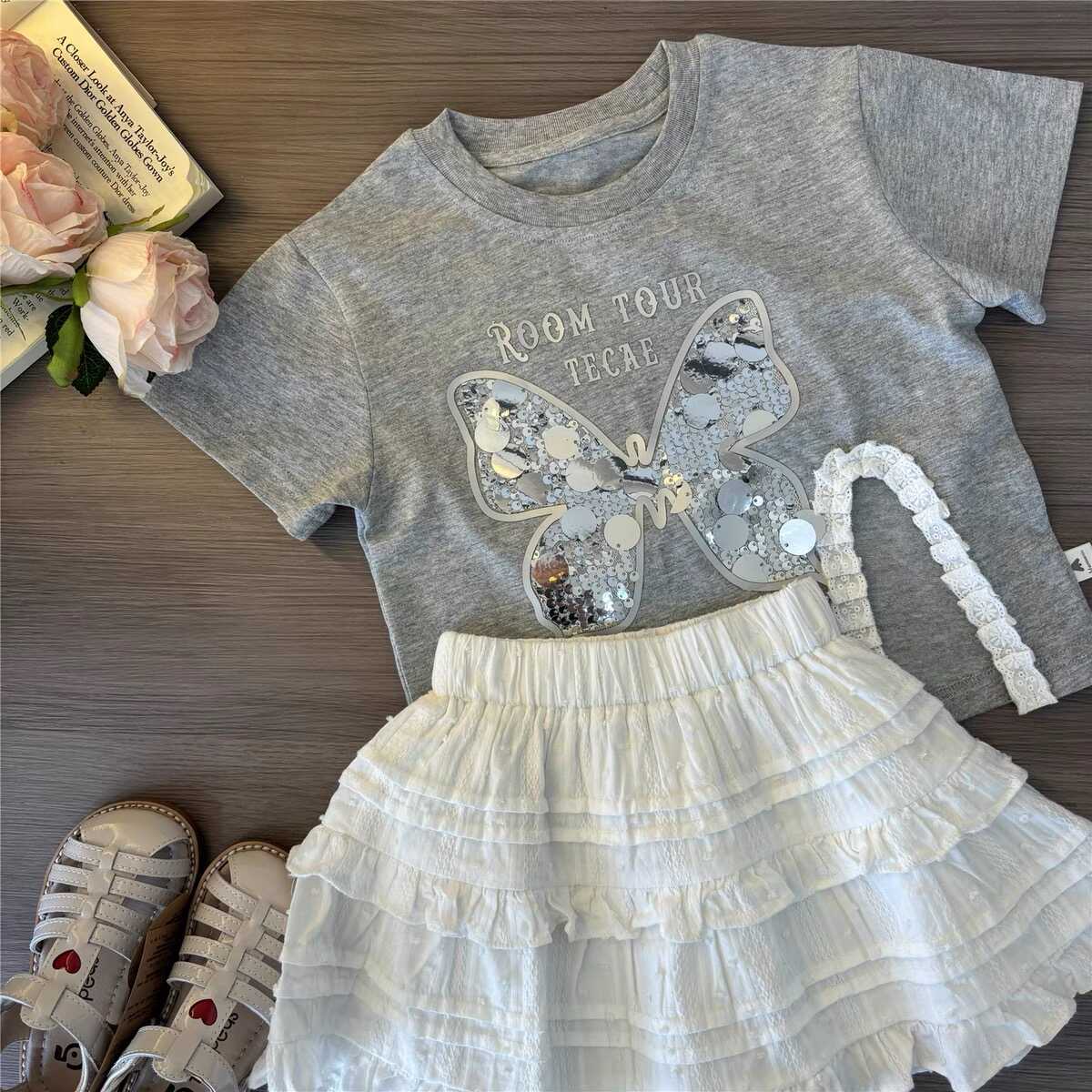 여자 여름 세트 2024 새로운 세련된 해골 나비 반팔 어린이 패션 스커트 아기 소녀 두 조각스토어 가기