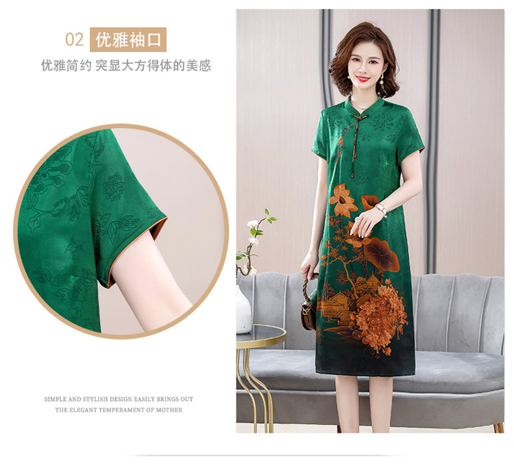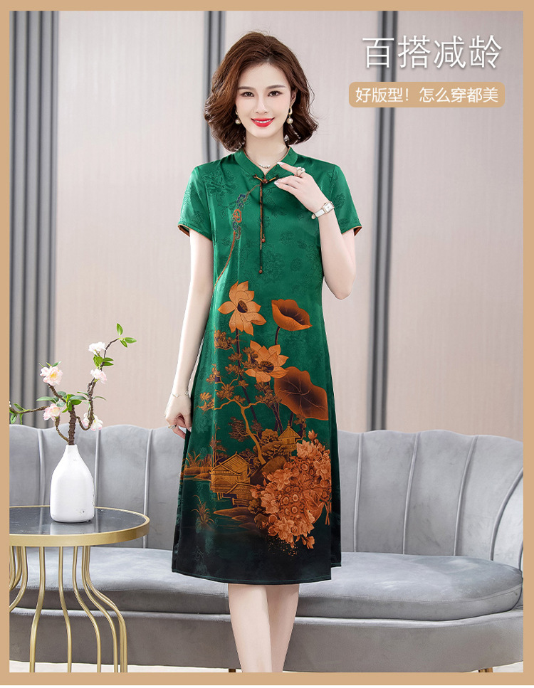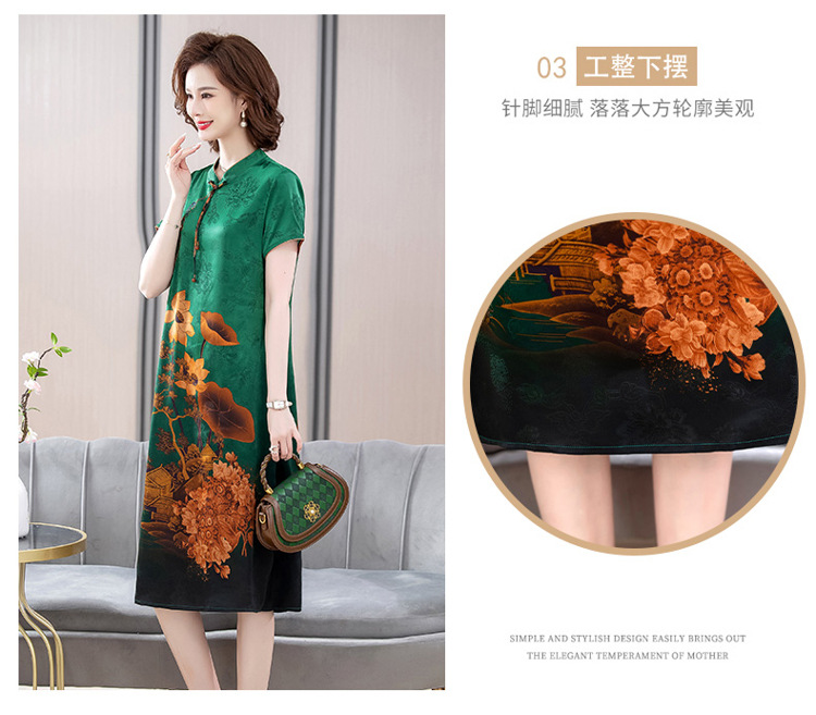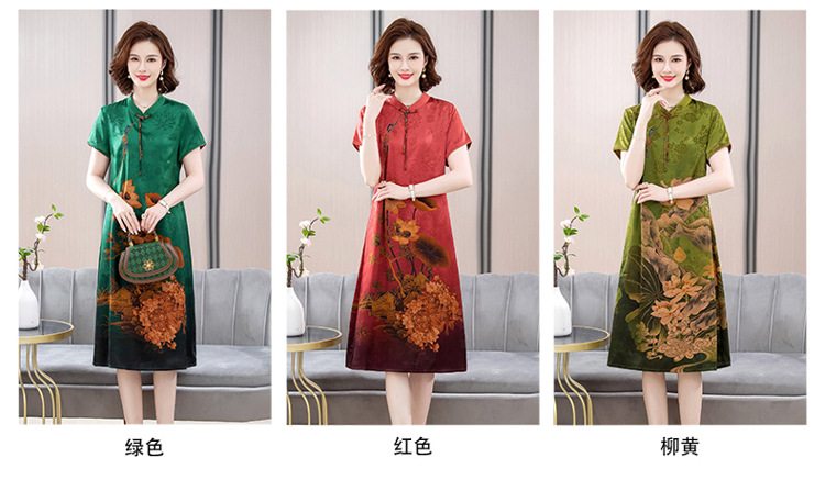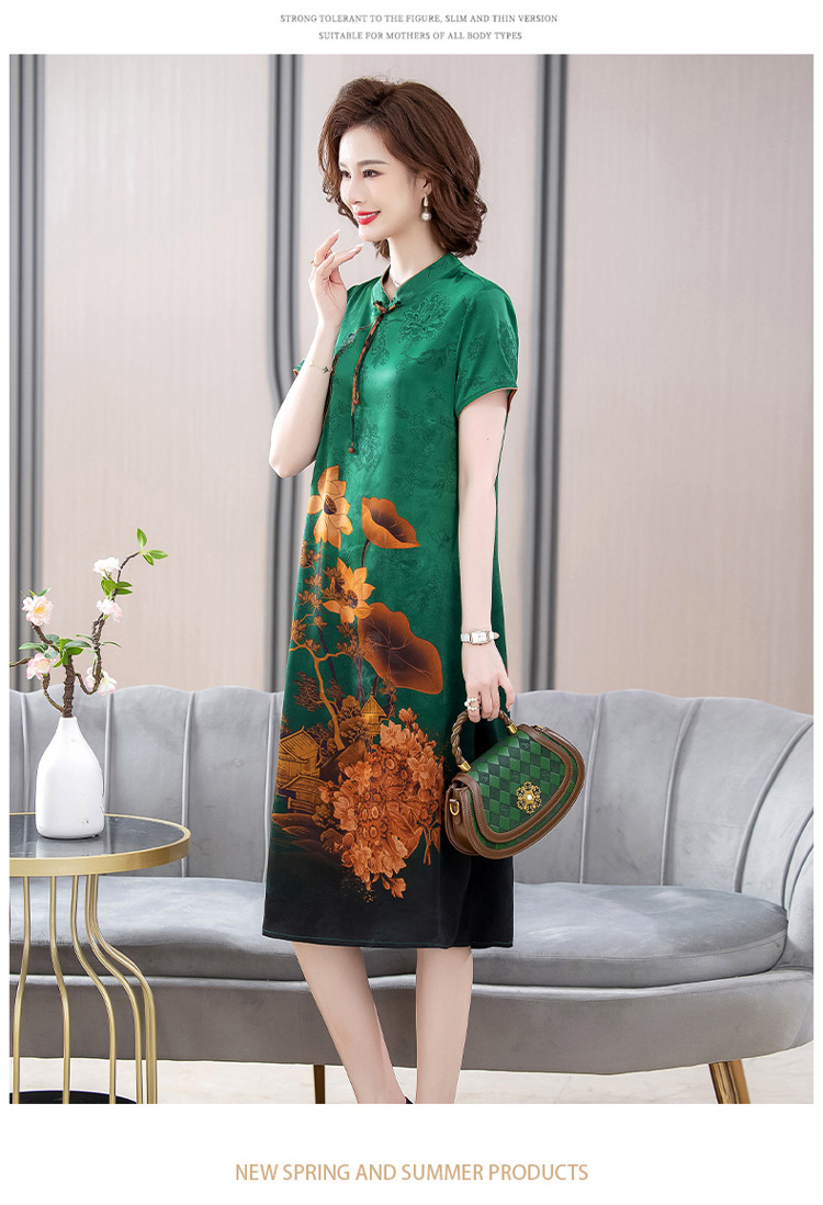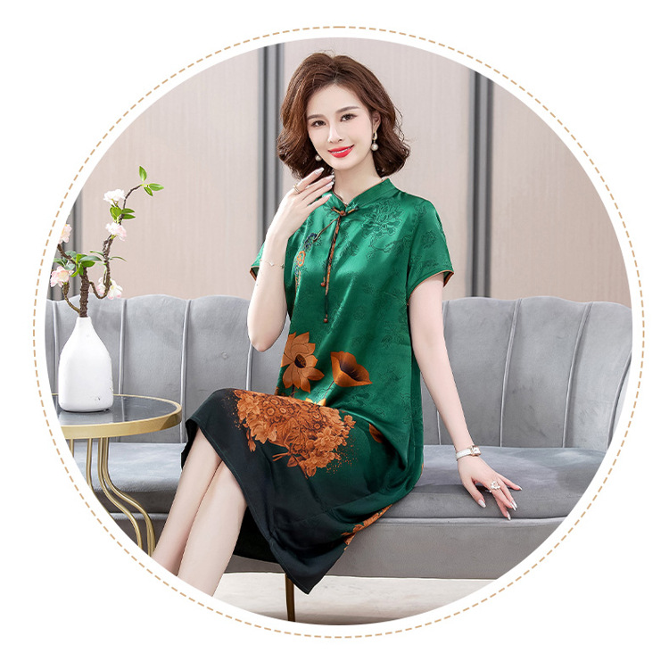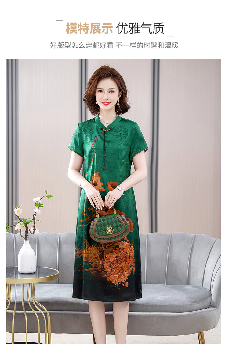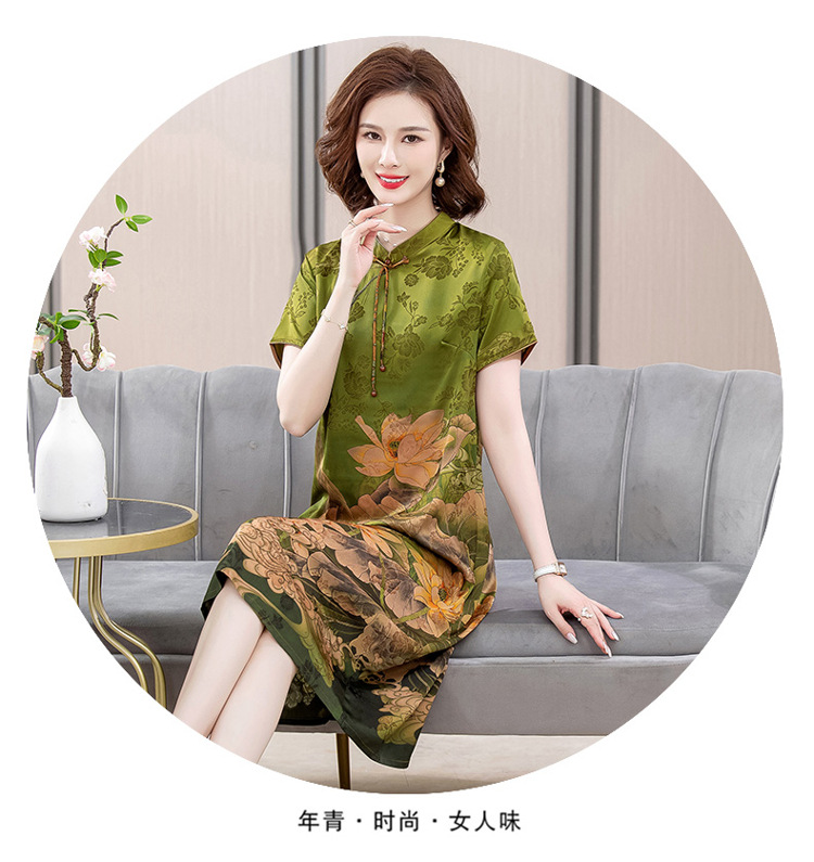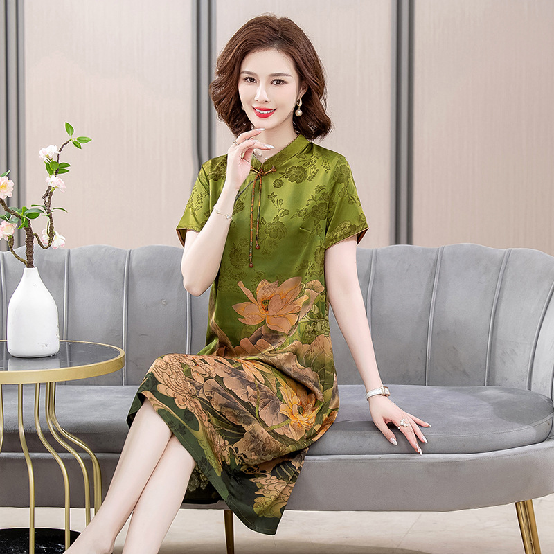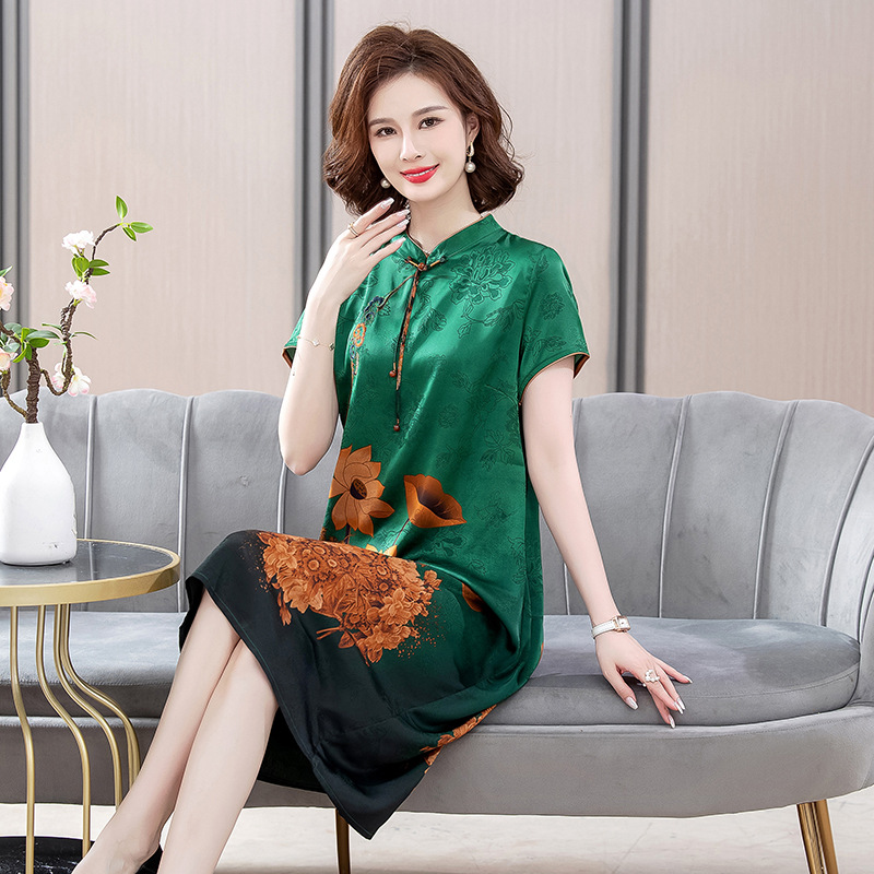 엄마 여름 원피스 청삼 칼라 반팔 원피스 여성 고귀한 패션 실크 긴 원피스 중년 노인 우아한 치마