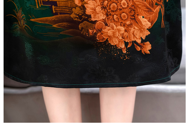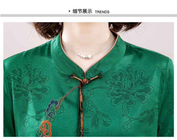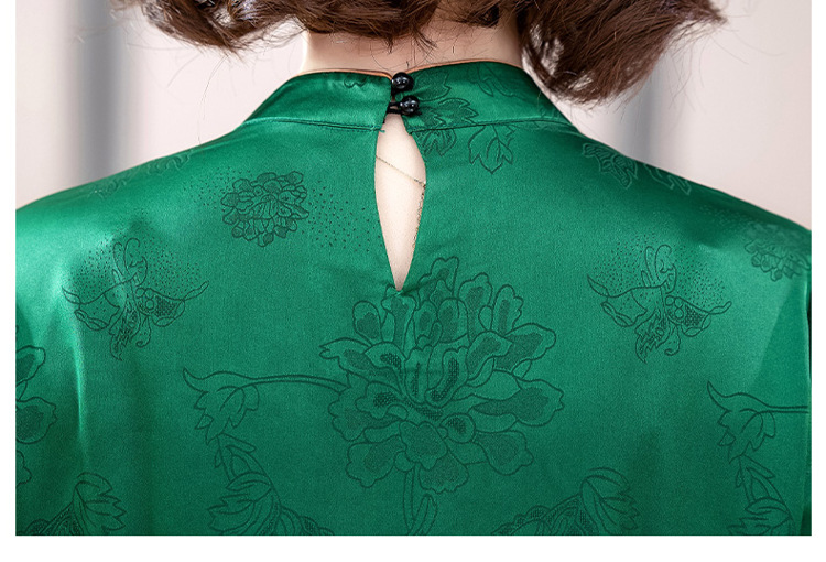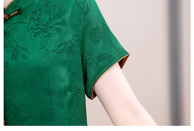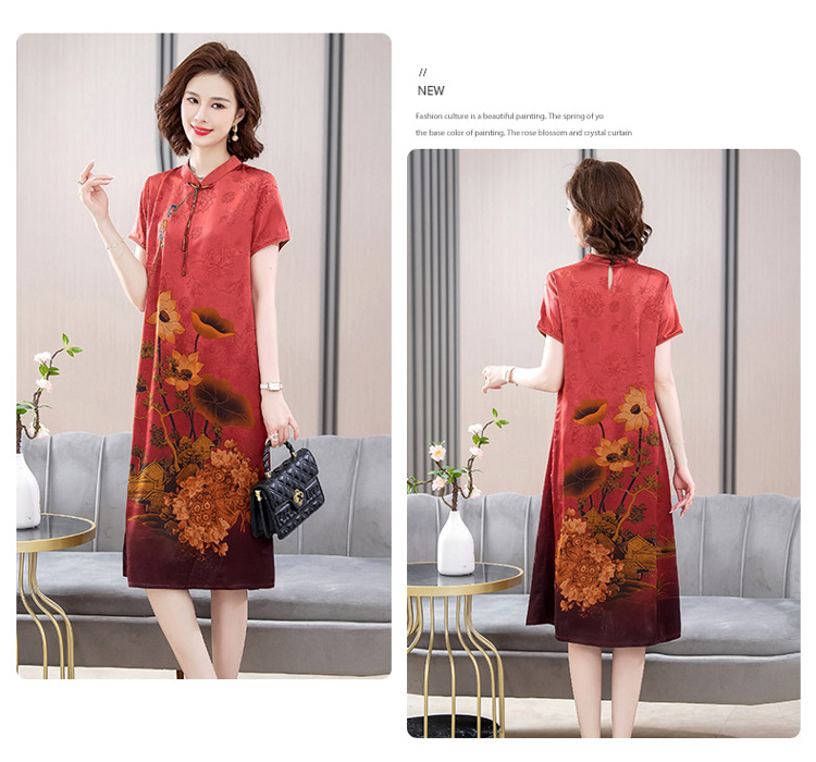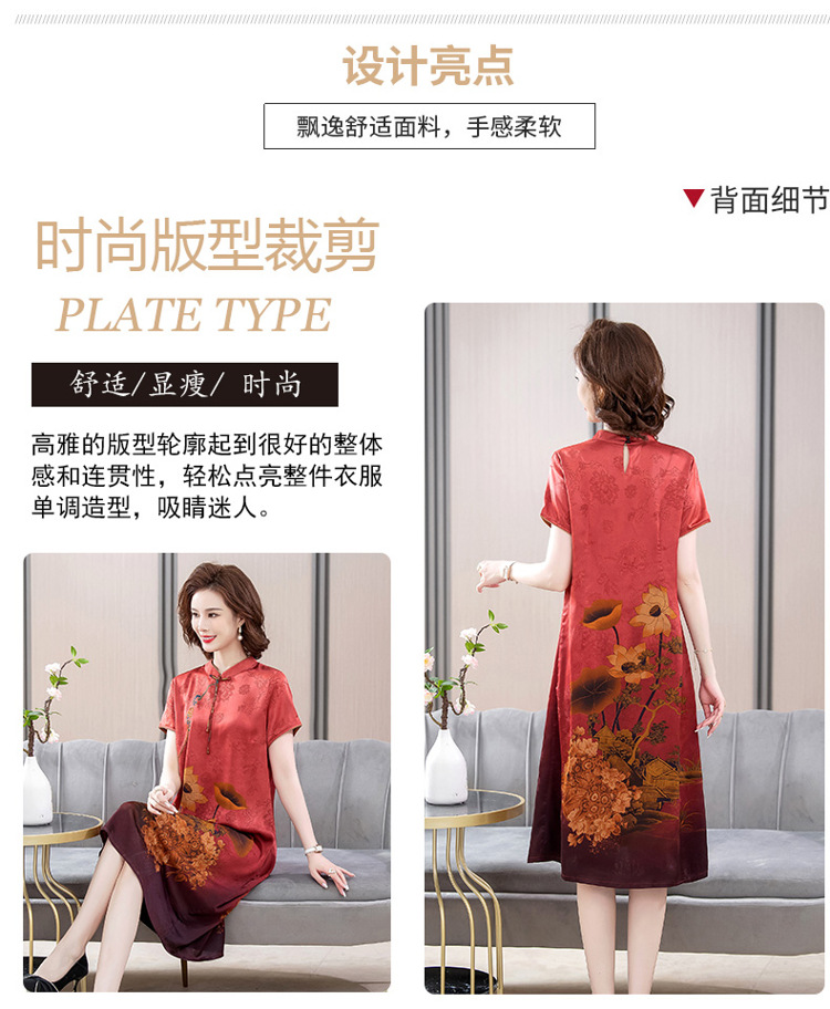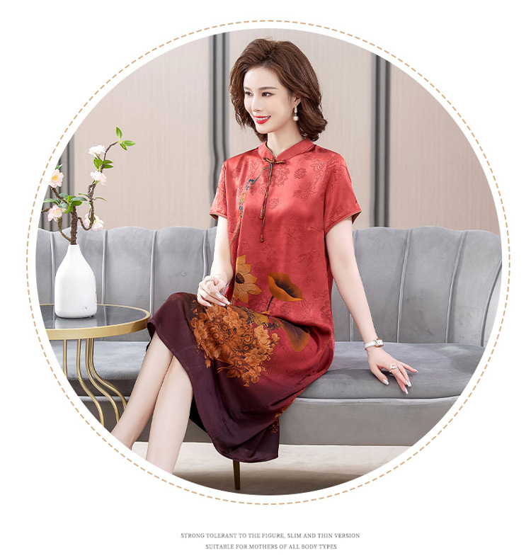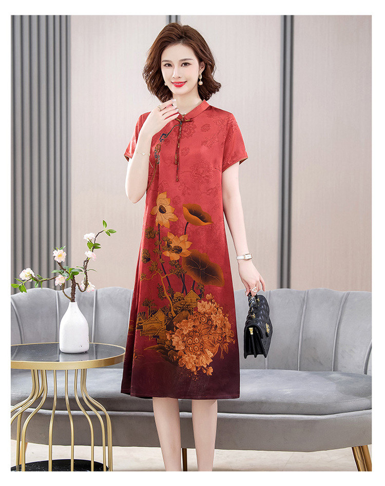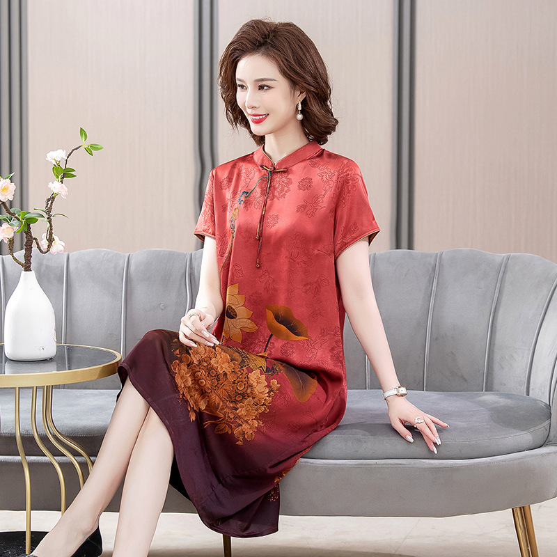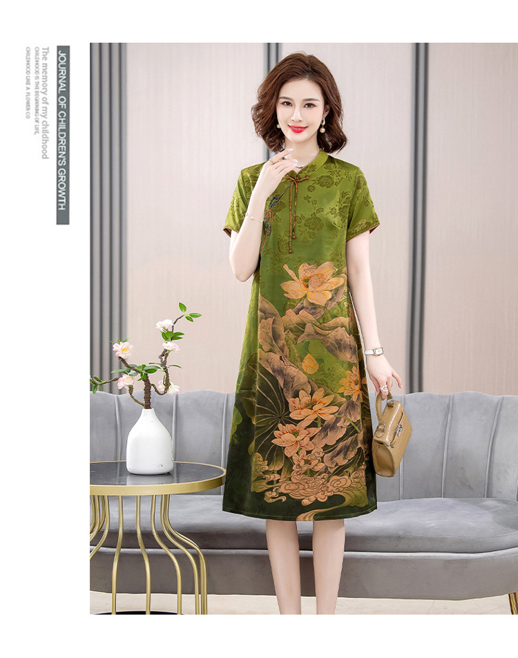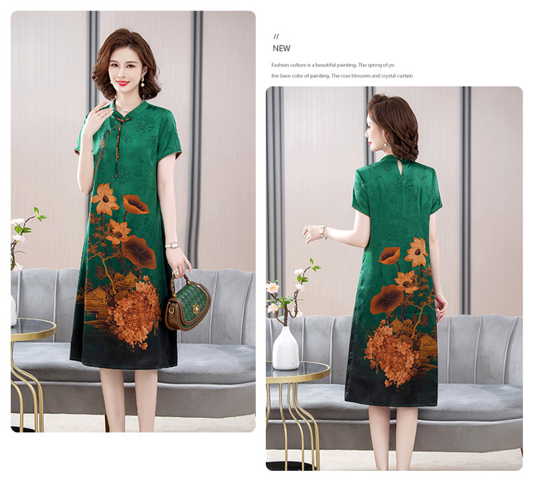 엄마 여름 원피스 청삼 칼라 반팔 원피스 여성 고귀한 패션 실크 긴 원피스 중년 노인 우아한 치마