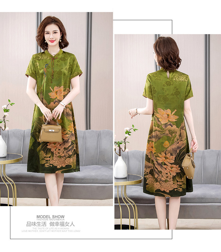 엄마 여름 원피스 청삼 칼라 반팔 원피스 여성 고귀한 패션 실크 긴 원피스 중년 노인 우아한 치마스토어 가기