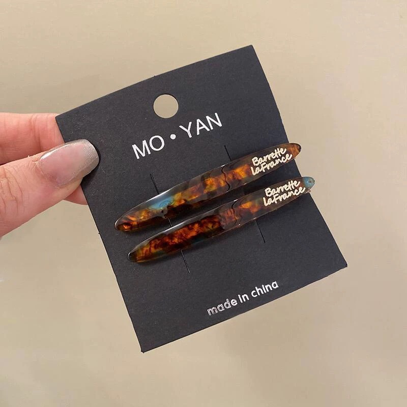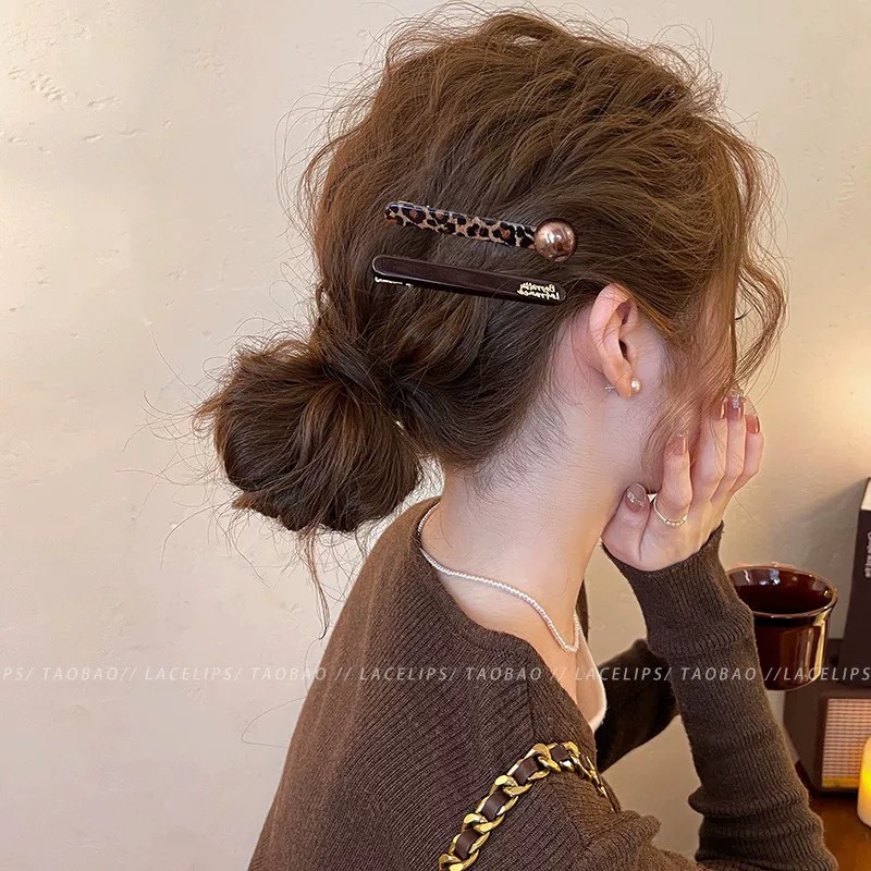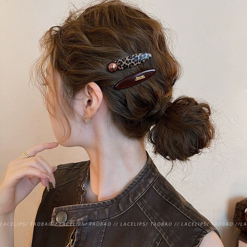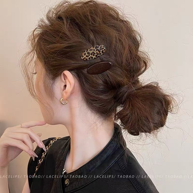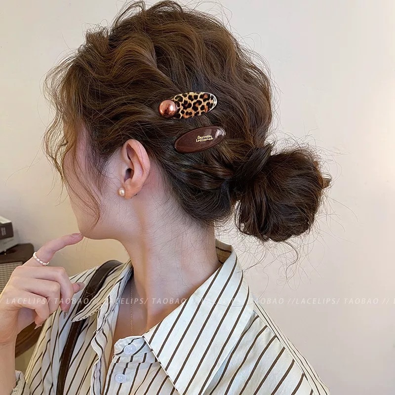 • 17#짧은 타원형 브라운 비즈 레오파드 프린트 헤어 클립 [1쌍]