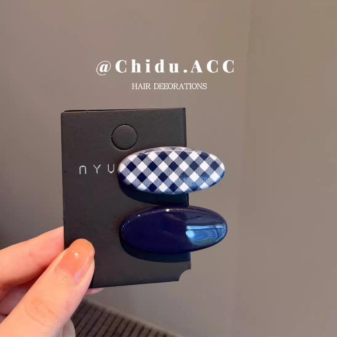 • 네이비 블루 체크 무늬 솔리드 컬러 투피스 헤어 클립 세트