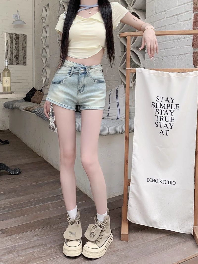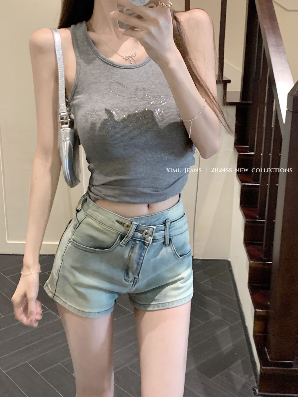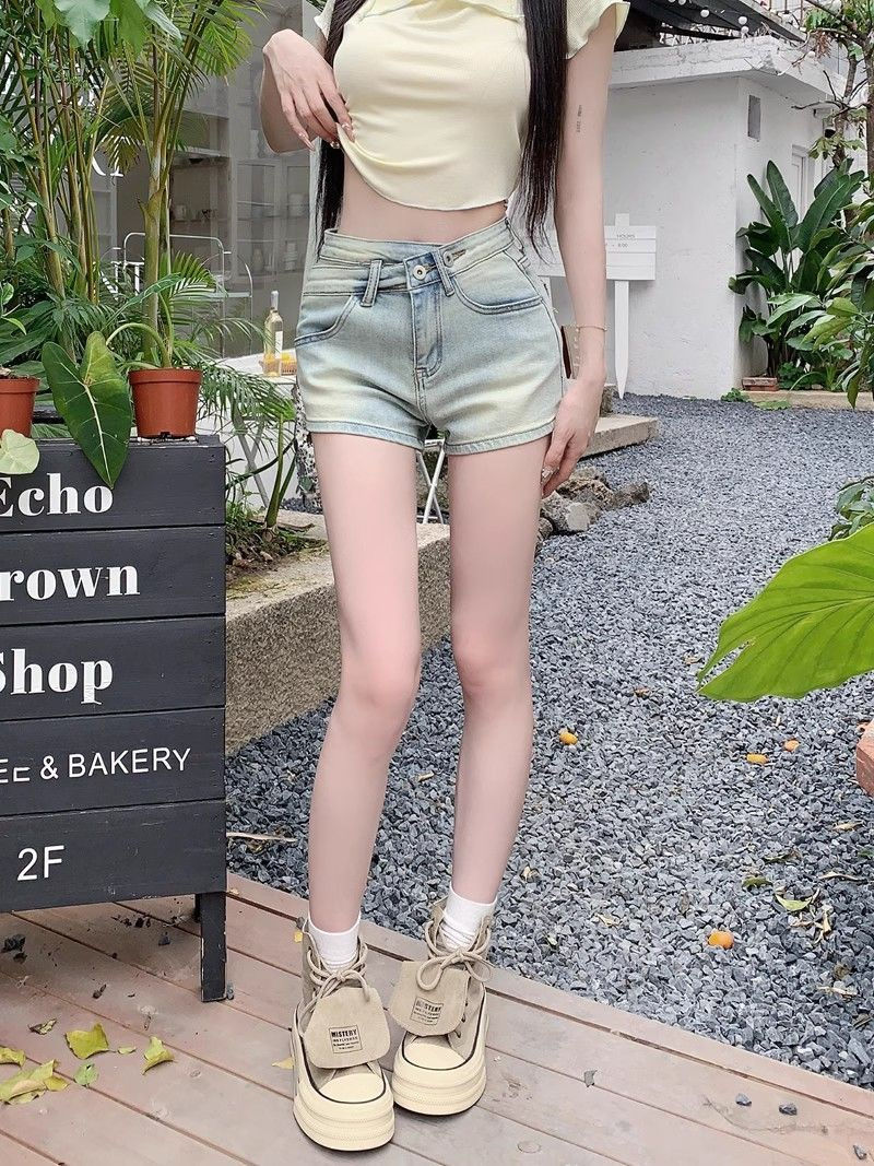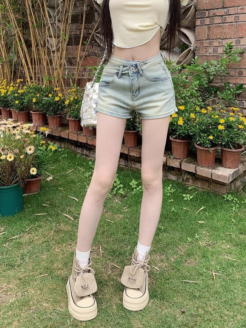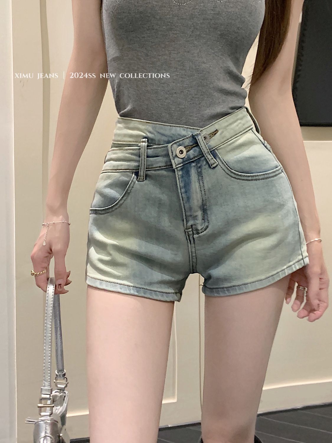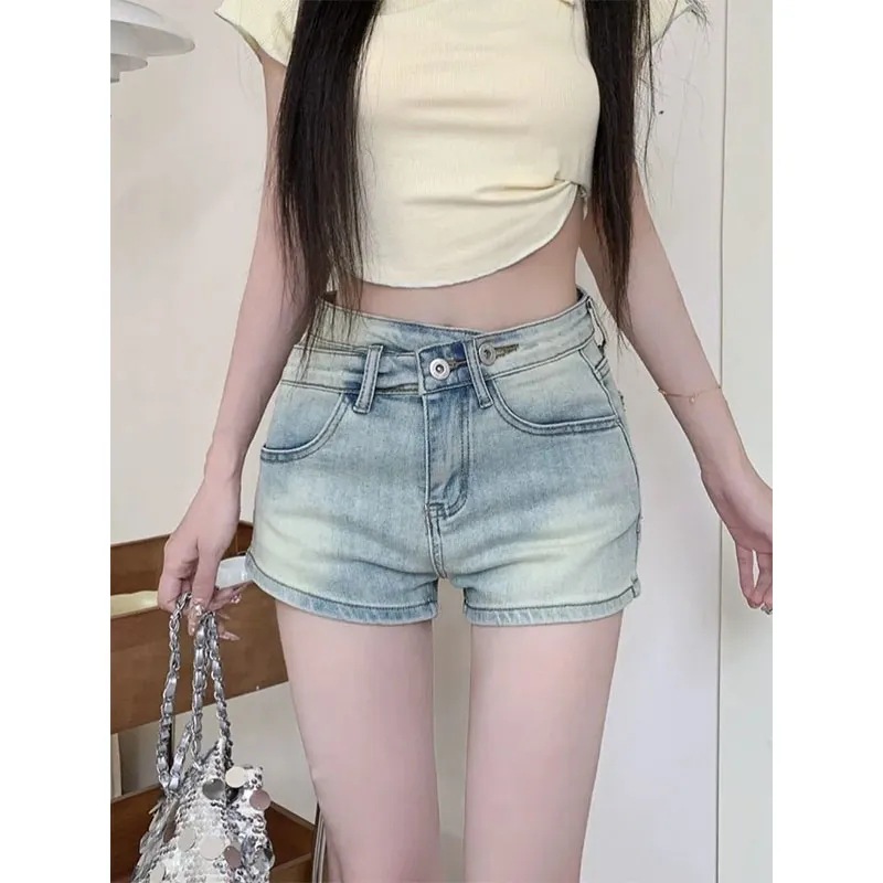 미국의 빈티지 데님 반바지 여성 여름 2024 새로운 허리 틈새 디자인 슈퍼 짧은 핫 팬츠스토어 가기