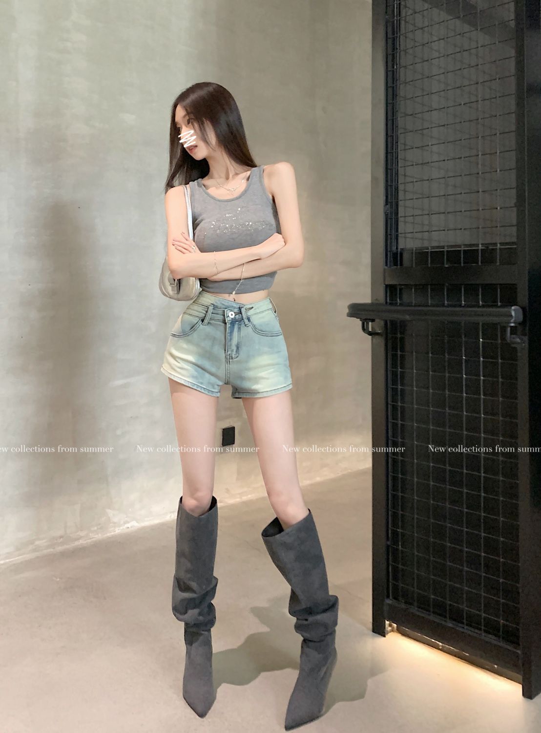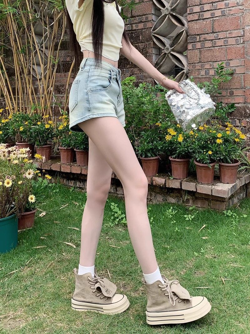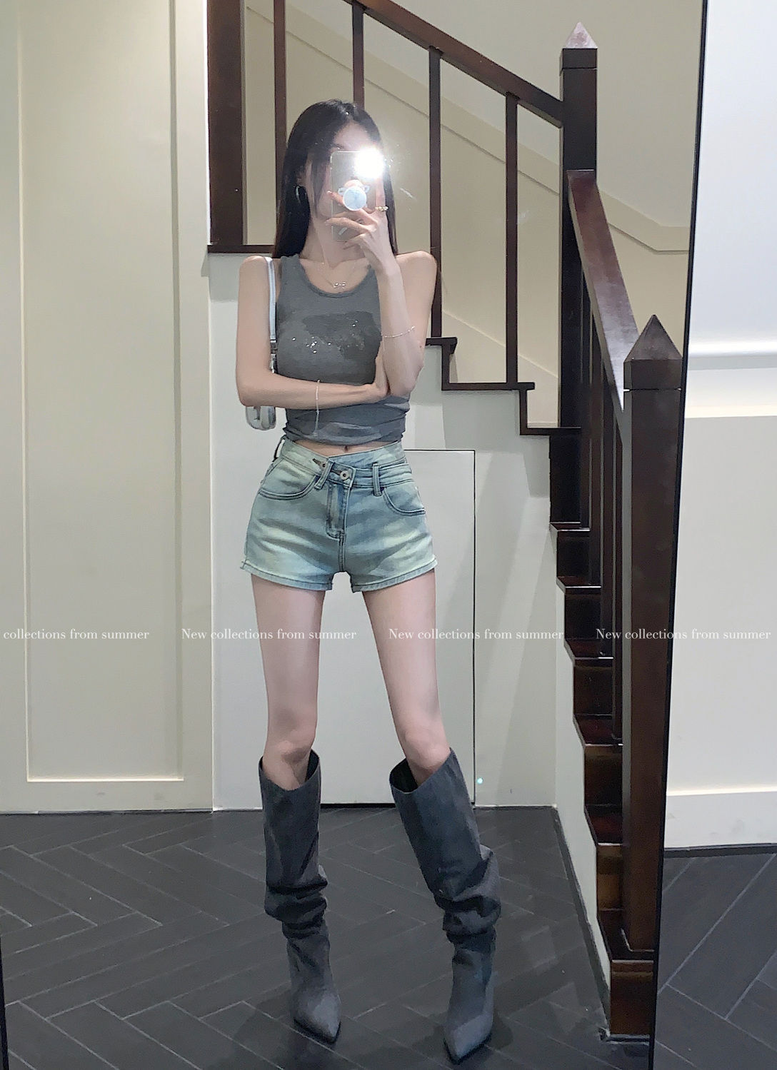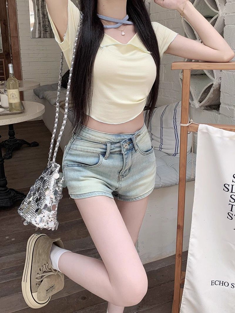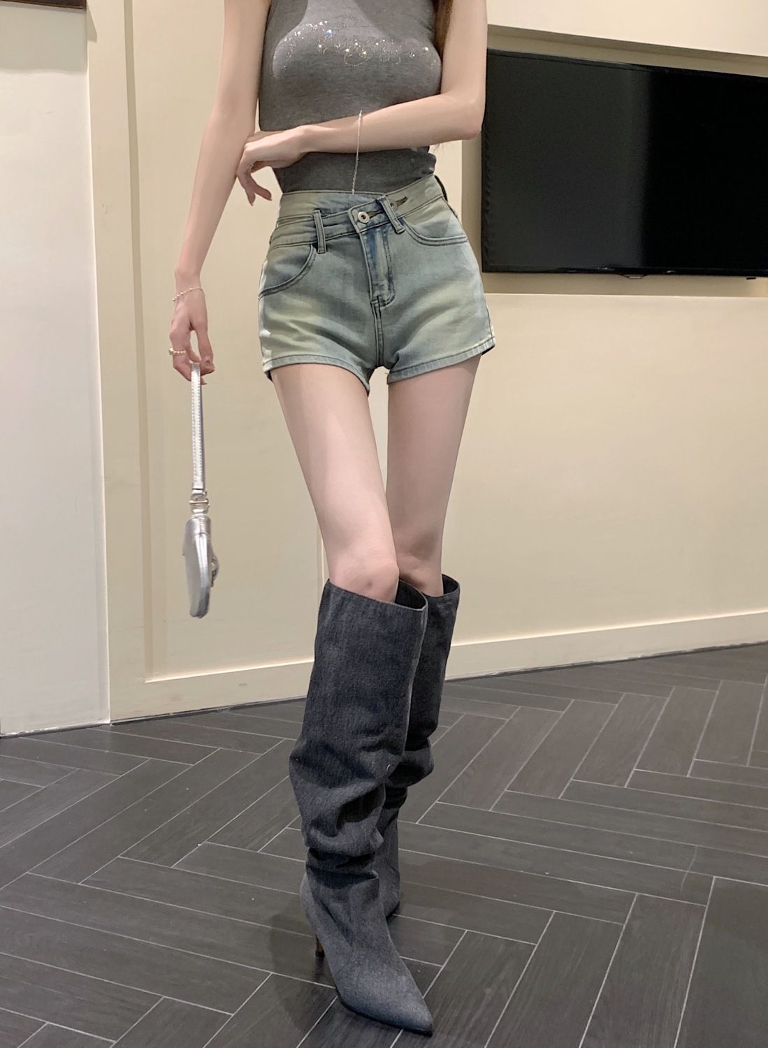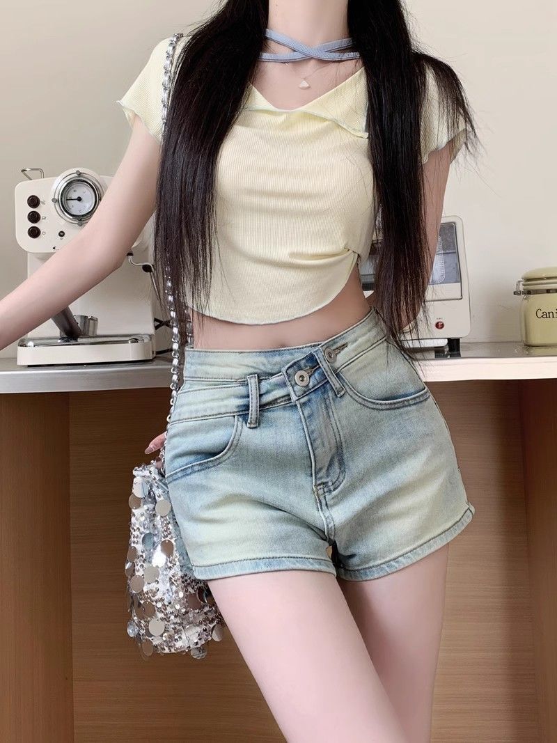미국의 빈티지 데님 반바지 여성 여름 2024 새로운 허리 틈새 디자인 슈퍼 짧은 핫 팬츠스토어 가기