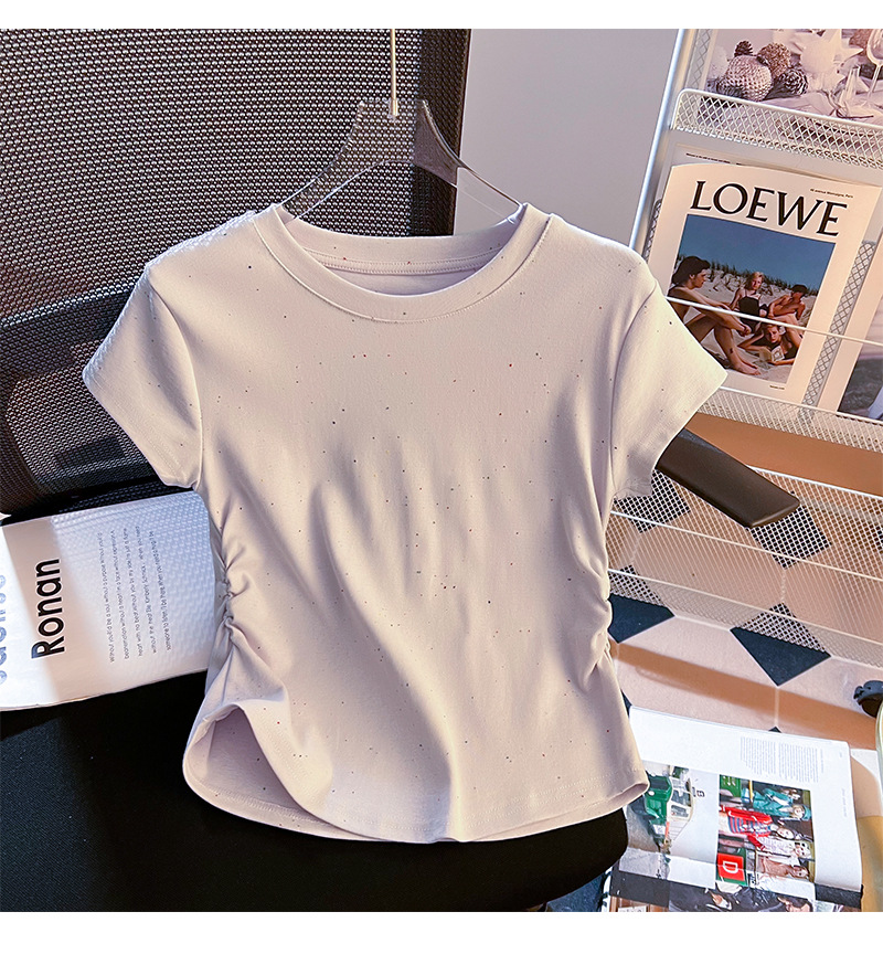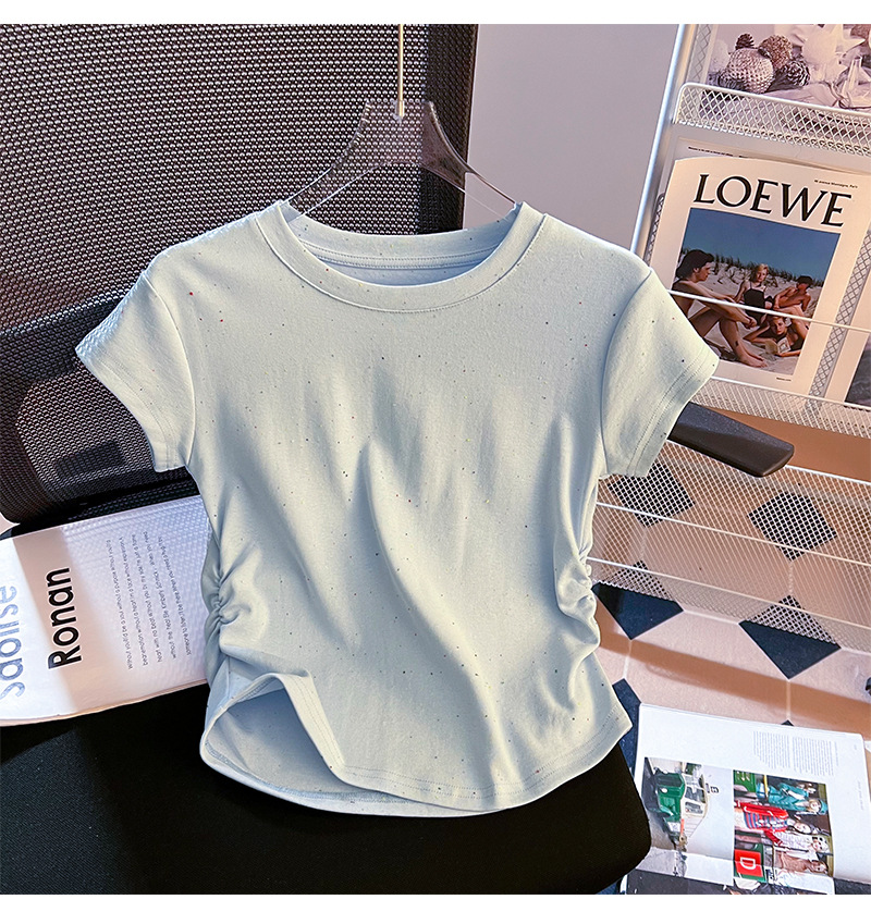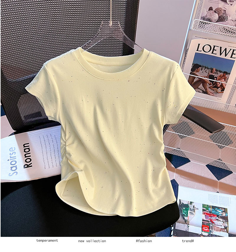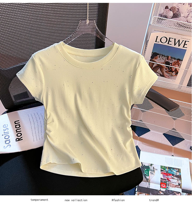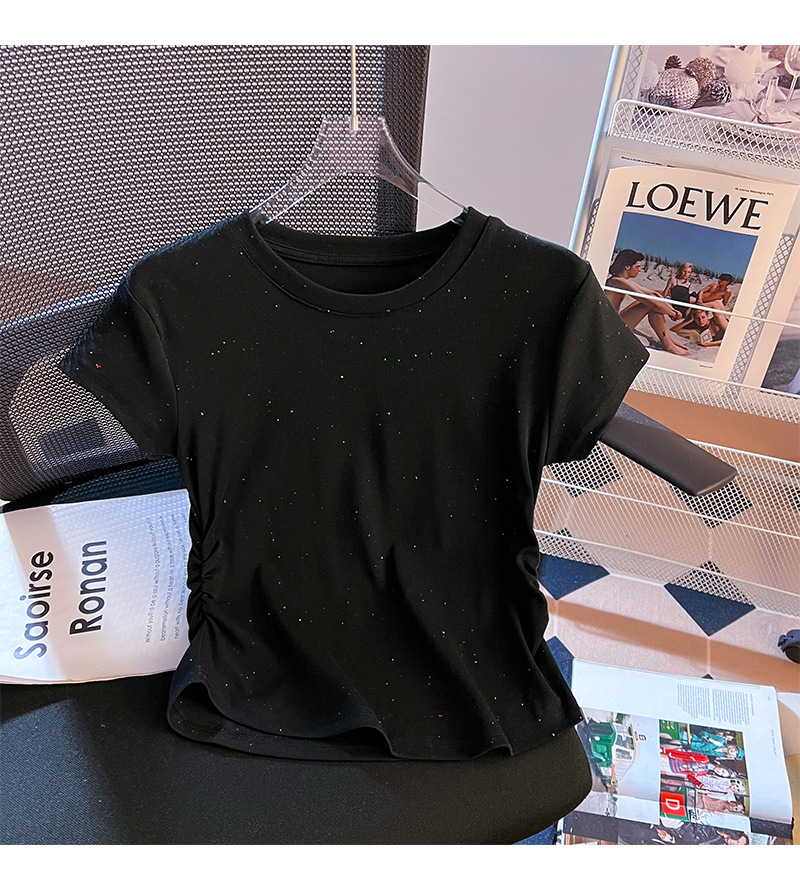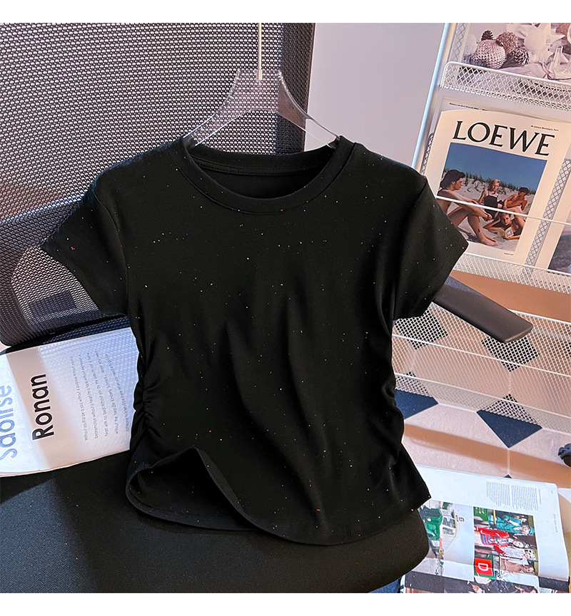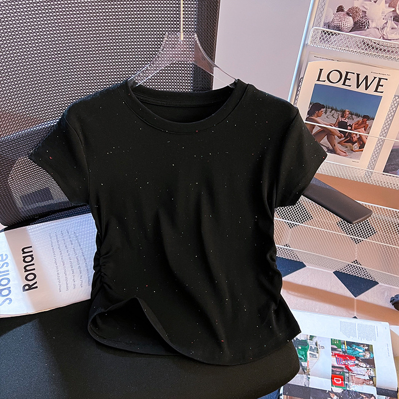 블랙 숄더 반팔 티셔츠 여성의 여름 새로운 디자인 센스 틈새 웨이브 도트 주름 허리 쇼트 탑 도매스토어 가기