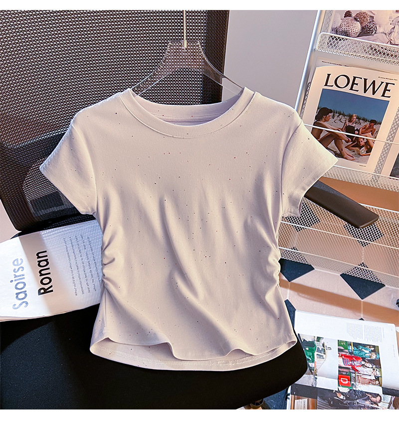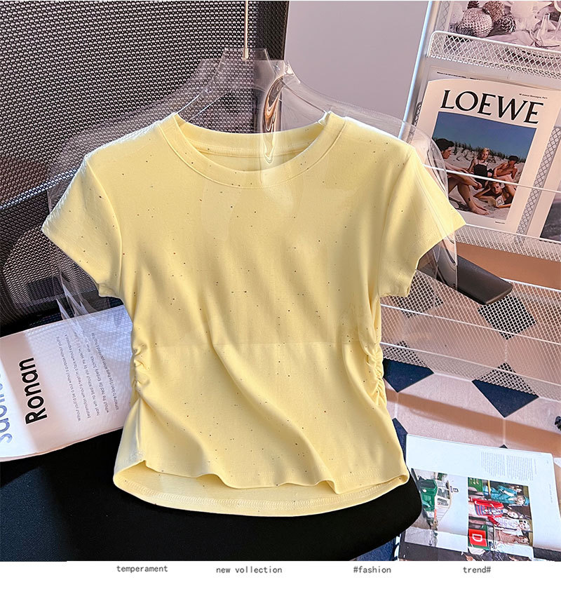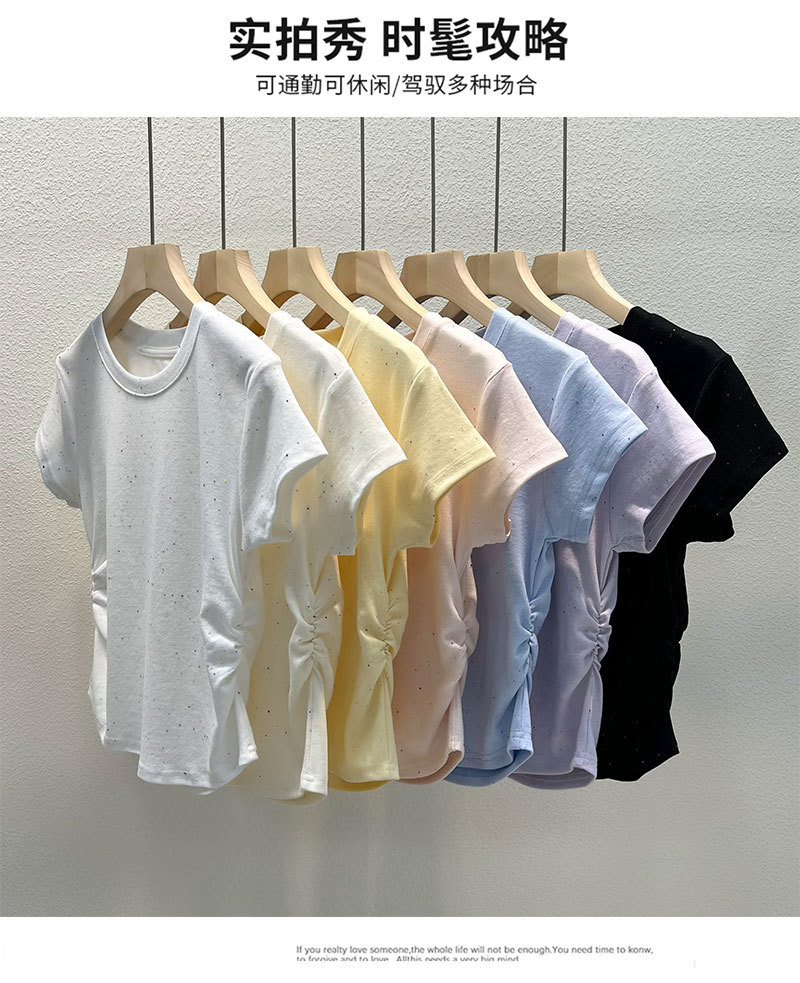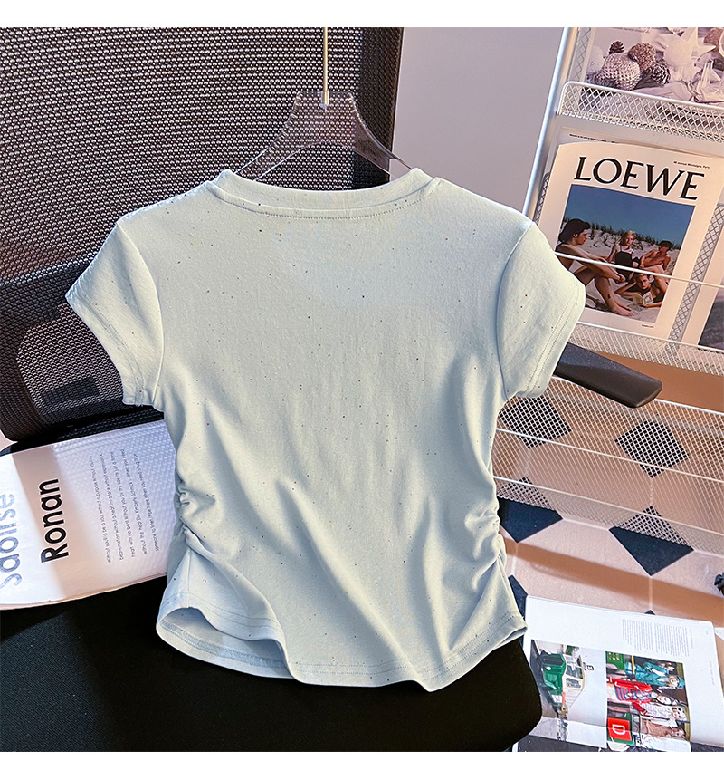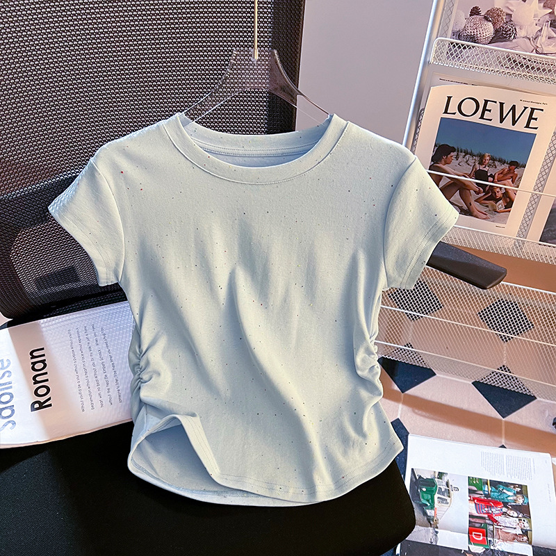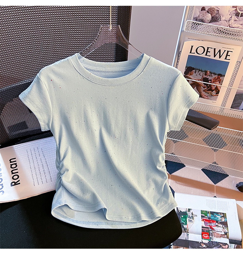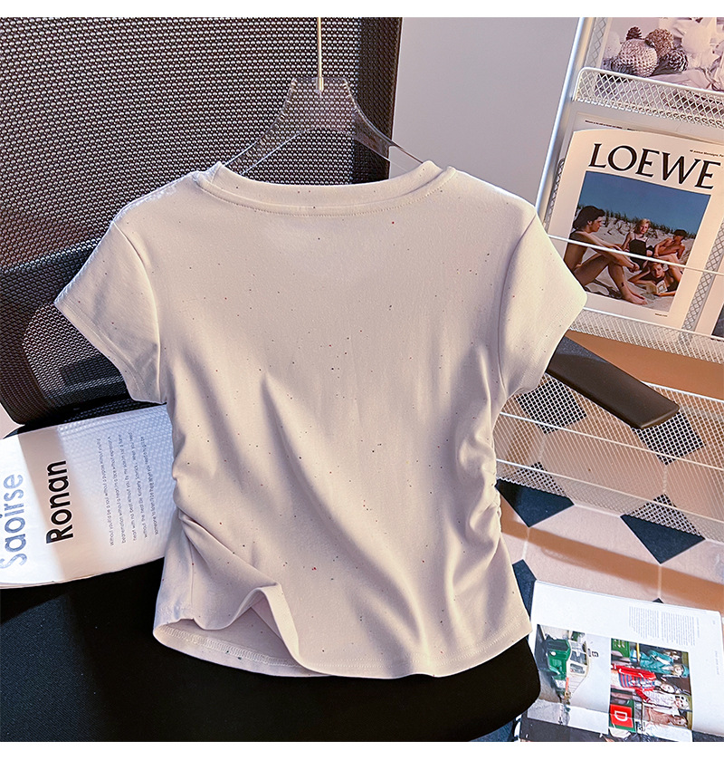 블랙 숄더 반팔 티셔츠 여성의 여름 새로운 디자인 센스 틈새 웨이브 도트 주름 허리 쇼트 탑 도매스토어 가기