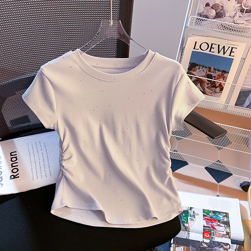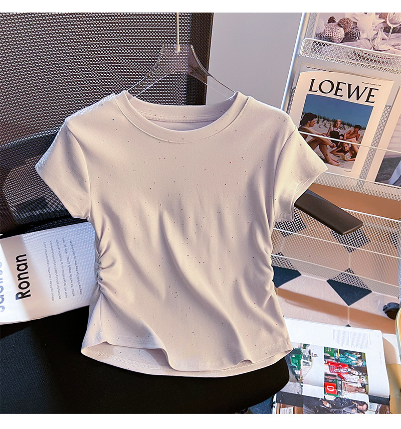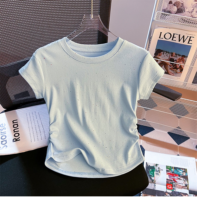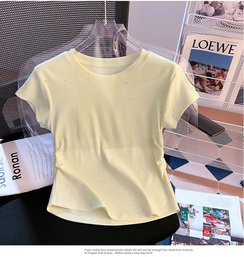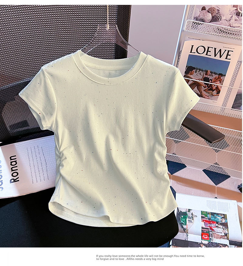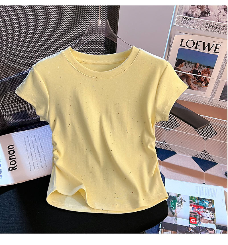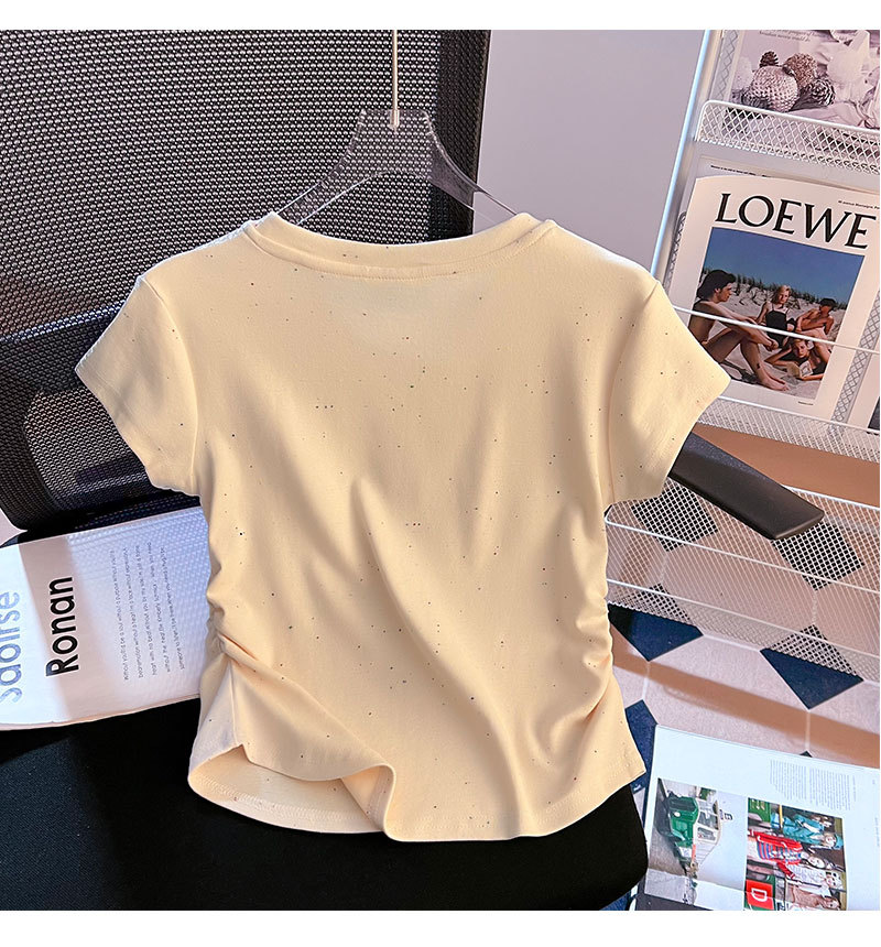 블랙 숄더 반팔 티셔츠 여성의 여름 새로운 디자인 센스 틈새 웨이브 도트 주름 허리 쇼트 탑 도매스토어 가기