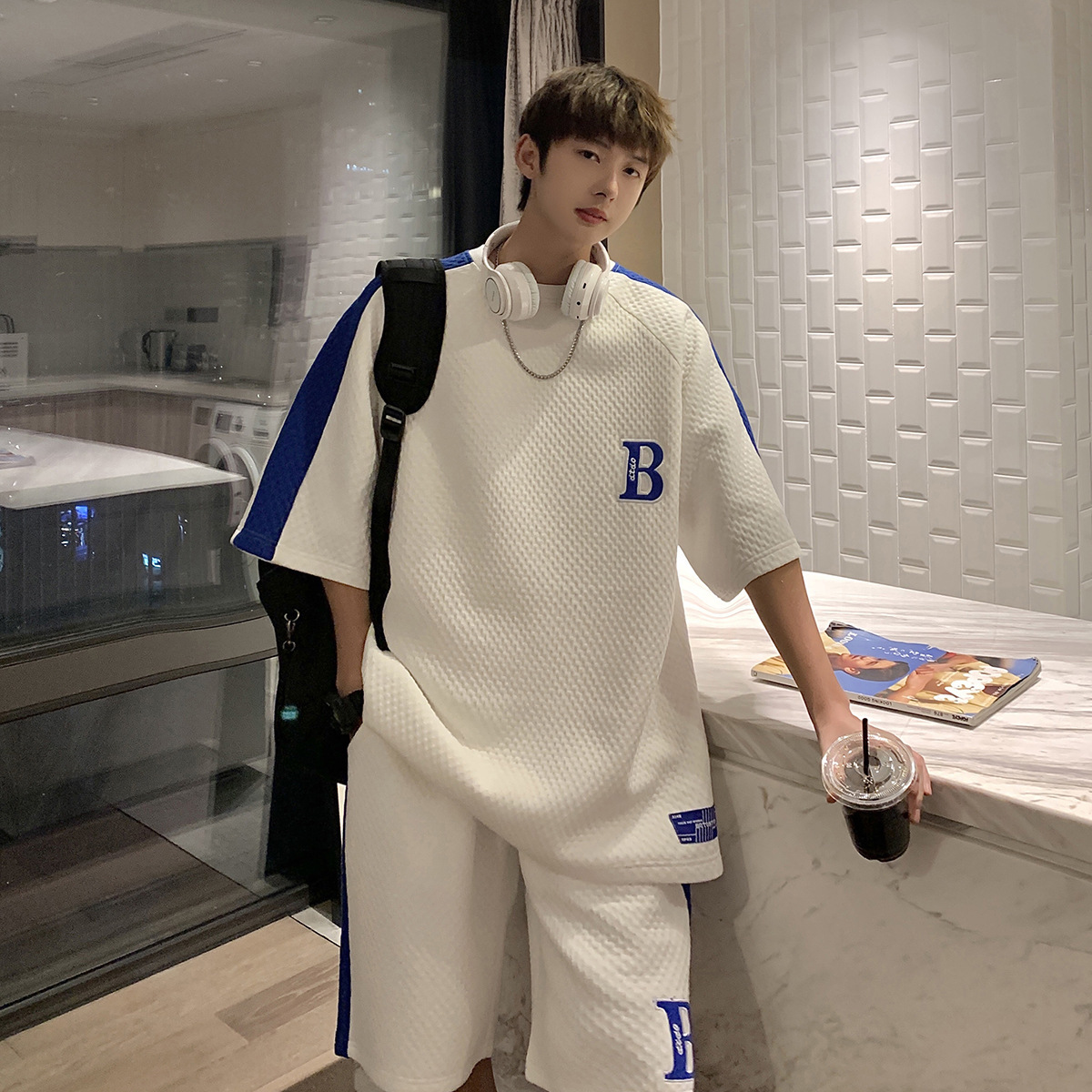 와플 세트 남자 여름 새 십대 학생 반팔 반바지 하이 스트리트 올매치 패셔너블 브랜드 캐주얼 투피스 세트