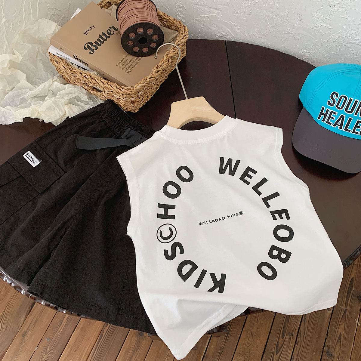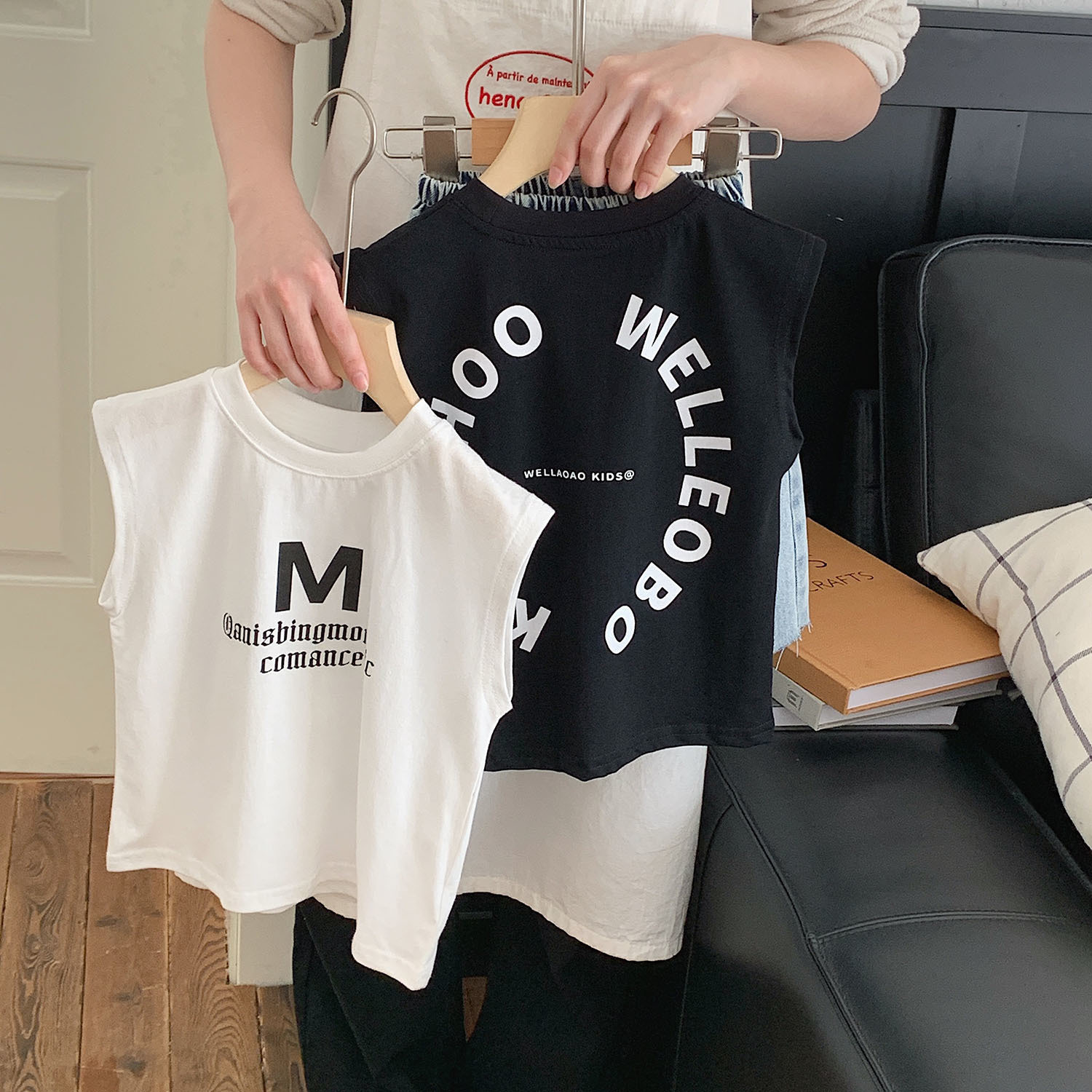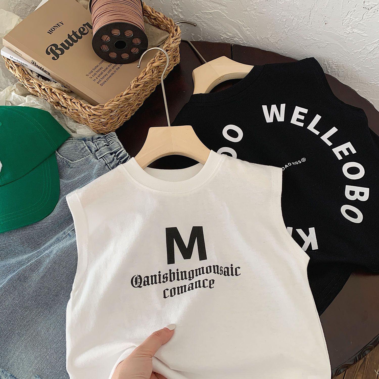 100% 면 아동 의류 2025 여름 새 스타일 소년 조끼 티셔츠 서양식 양복 조끼 편지 소녀 베이비 탑