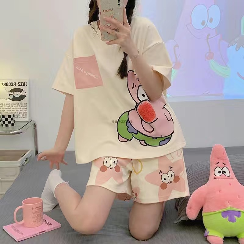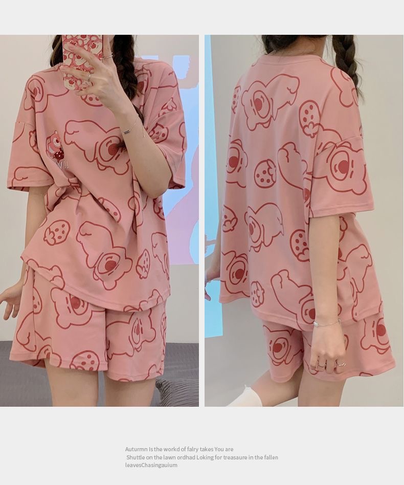 여성용 잠옷 반팔 반바지 라운드넥 루즈핏 대형 사이즈 홈웨어 투피스 세트 여름 외출 가능 만화 소녀 스타일 귀여움
