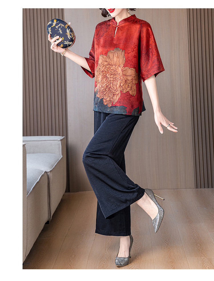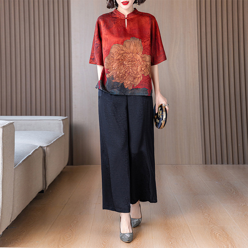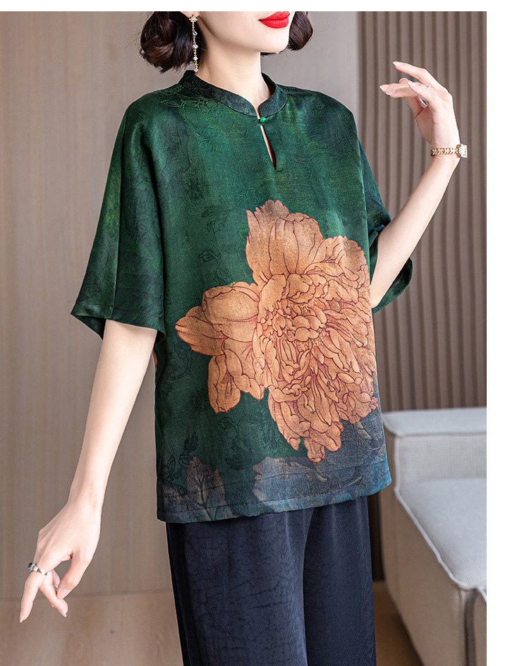 새로운 중국 스타일 어머니의 여름 최고 중년 및 노인 모방 Xiangyun 원사 실크 셔츠 여성의 작은 세트
