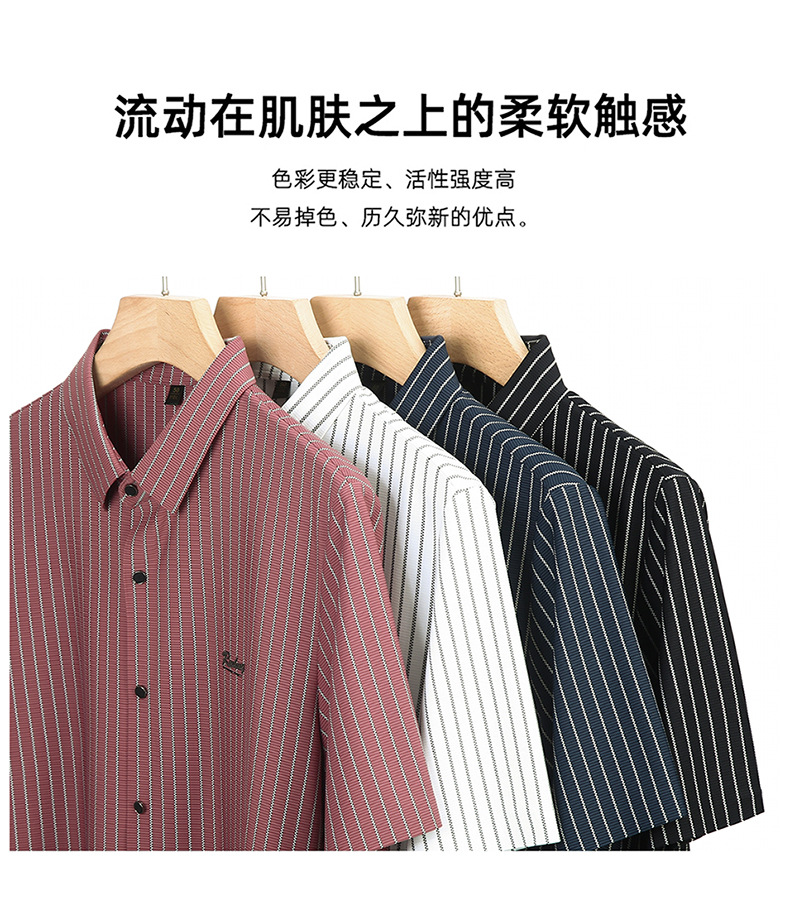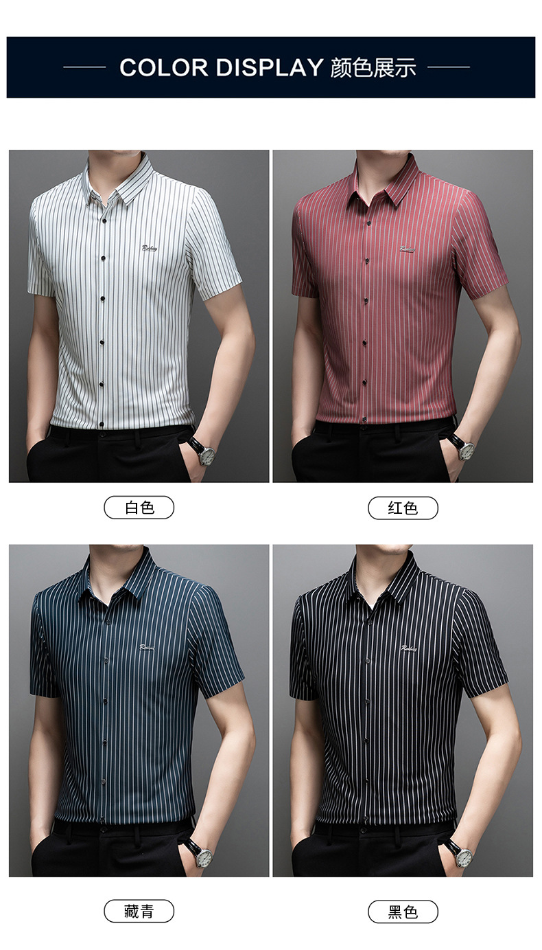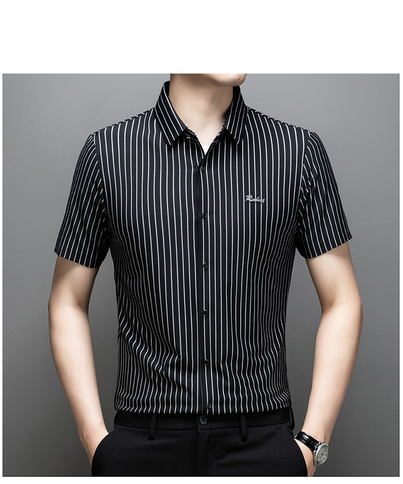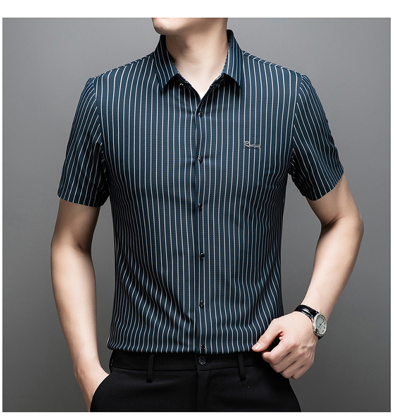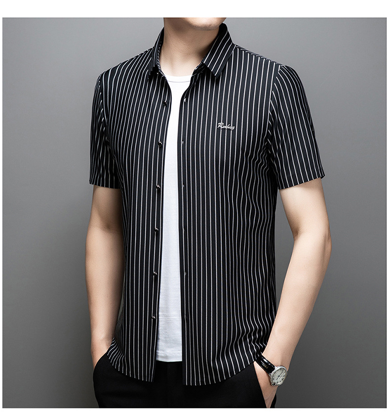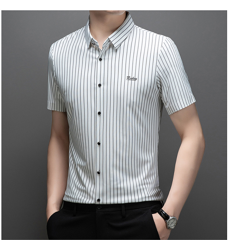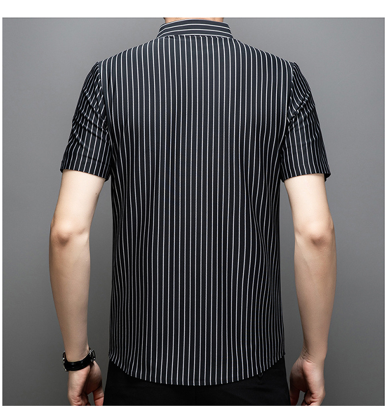 하이 엔드 남성 청소년 비즈니스 캐주얼 tracless 셔츠 여름 아이스 실크 스트레치 핫 스탬핑 스트라이프 드 래핑 짧은 소매 탑스토어 가기