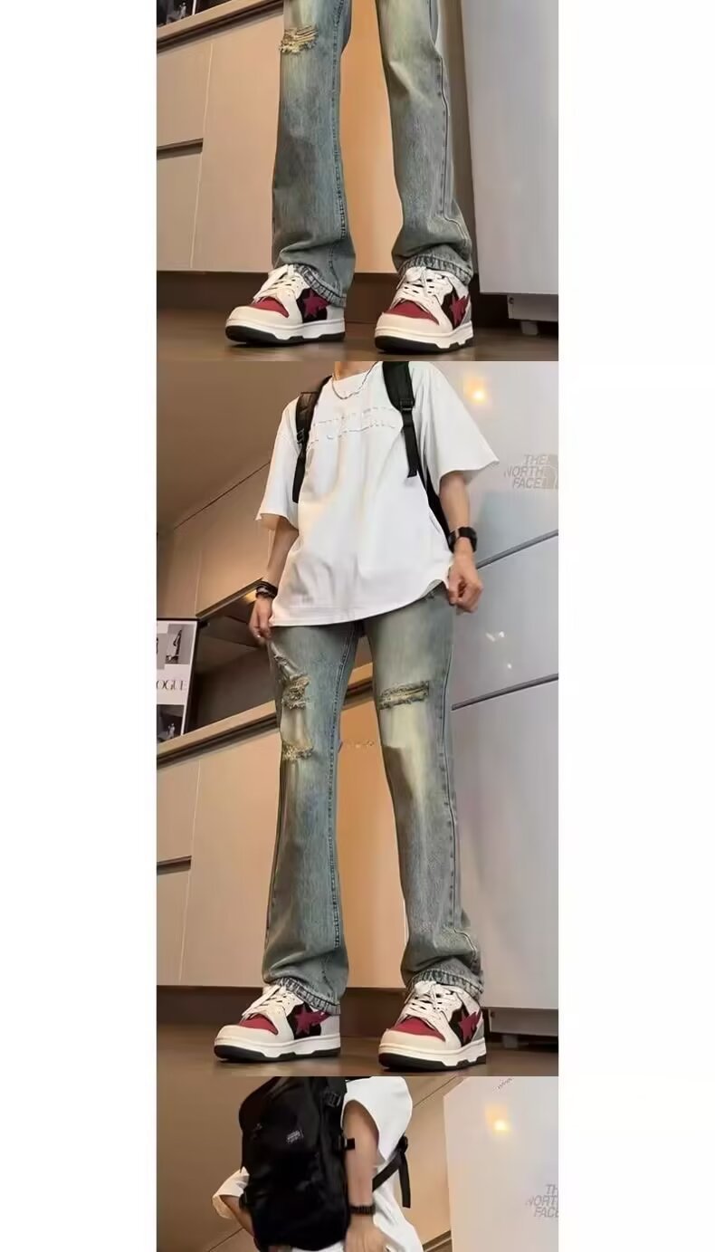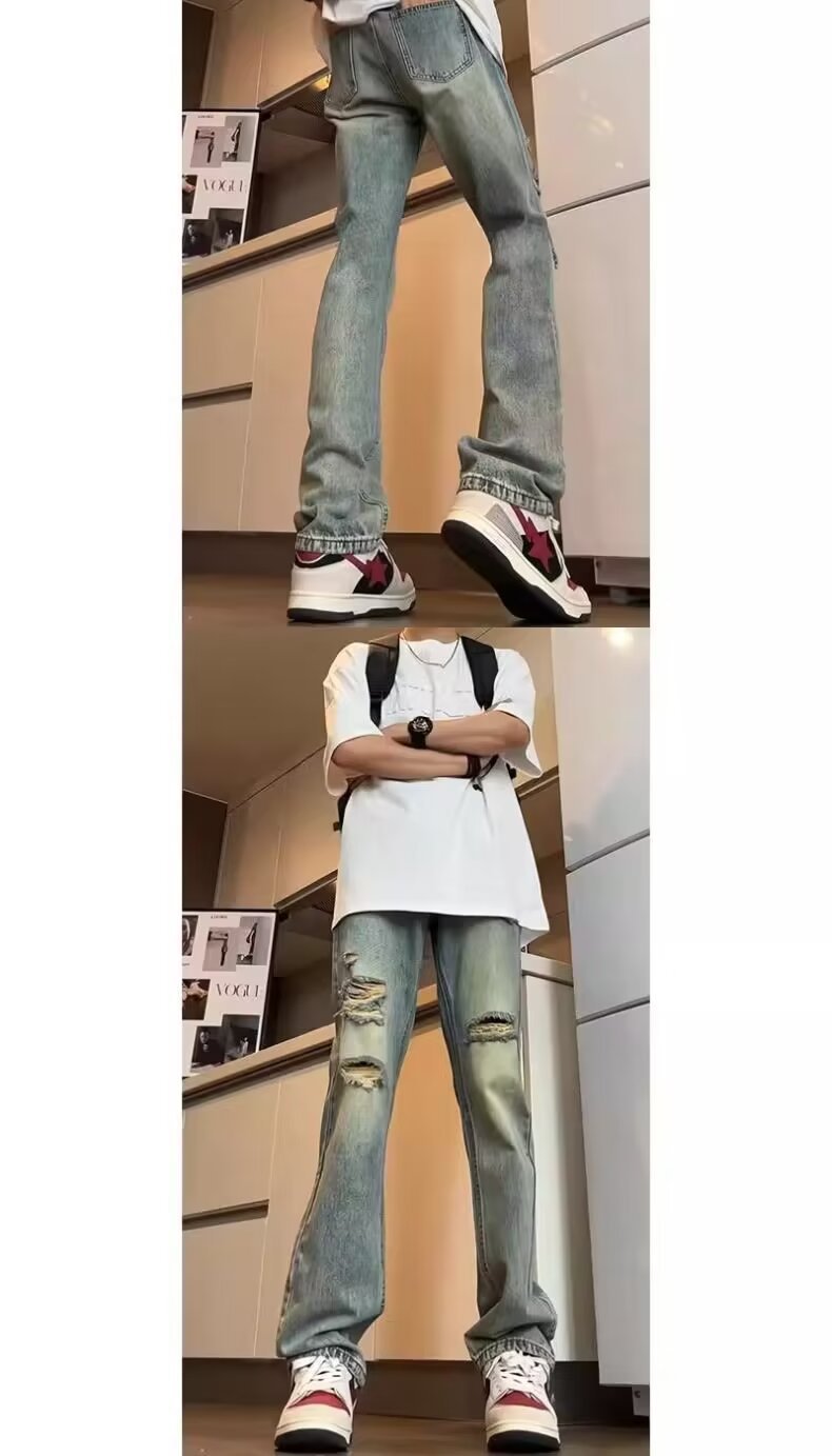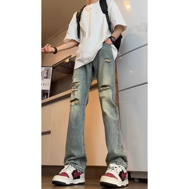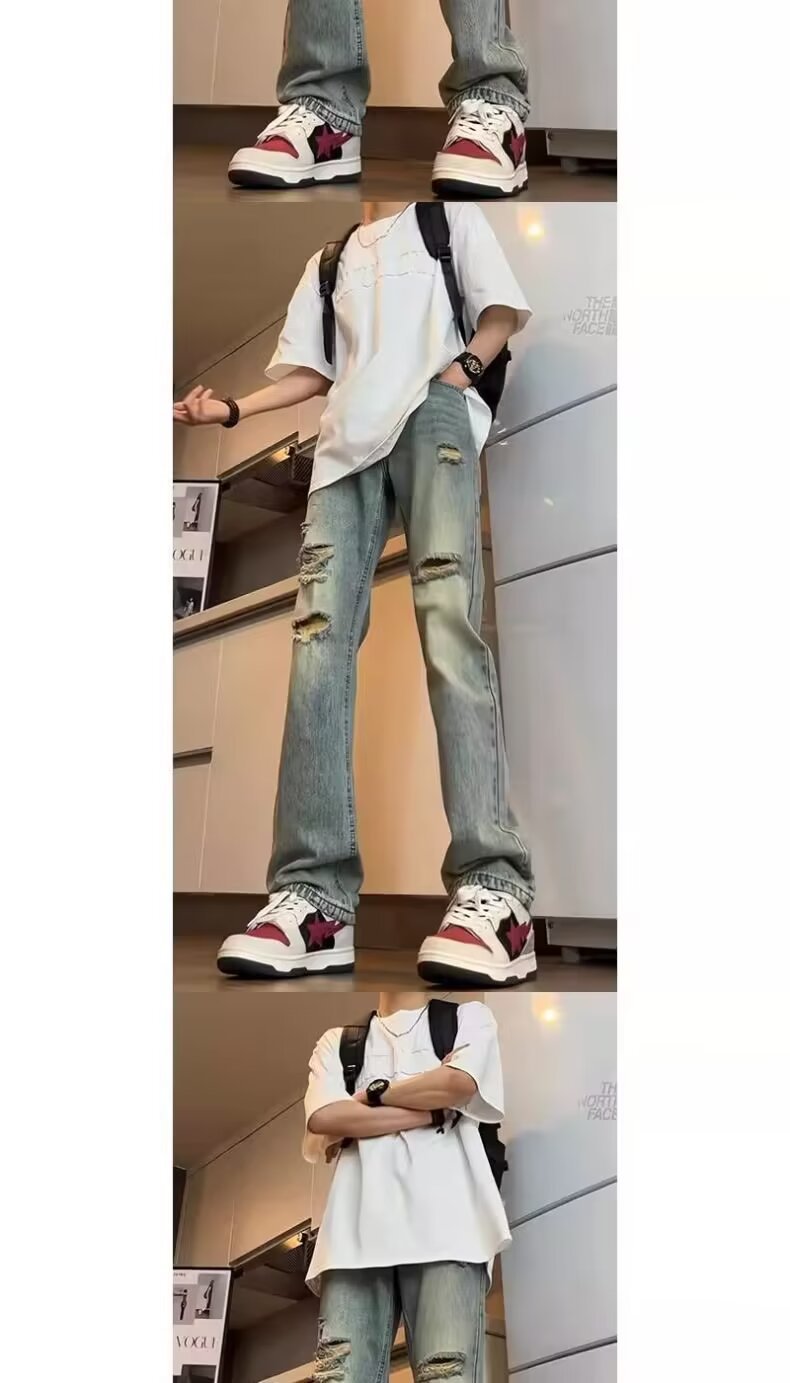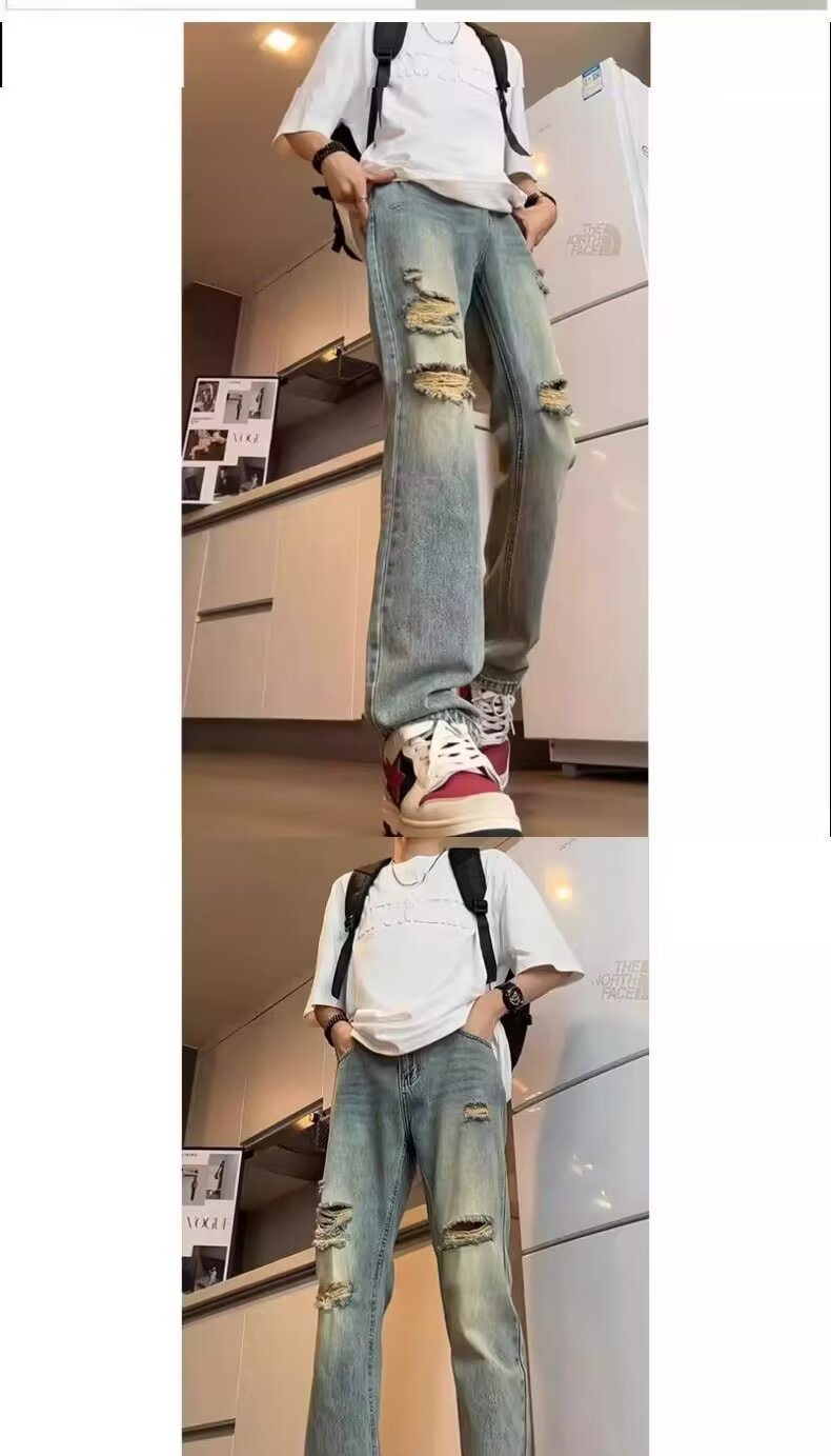 미국식 바이브 세탁 바지 하이 스트리트 레트로 찢어진 청바지 남자의 여름 스트레이트 루즈 하이 엔드 센스 거지 바지스토어 가기