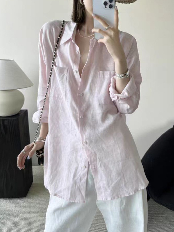 고급 창백한 핑크 리넨 셔츠 여성용 여름 선 스크린 카디건 경량 통기성 프렌치 코튼 리넨 셔츠스토어 가기