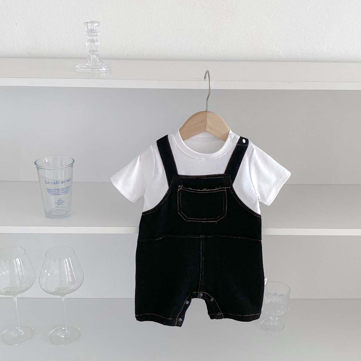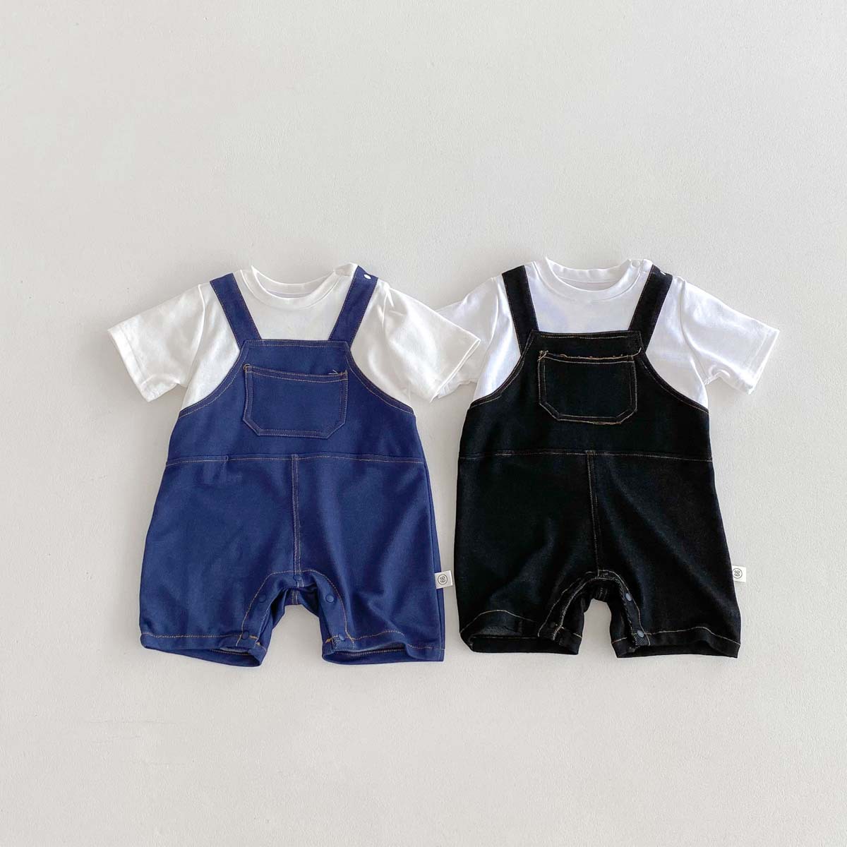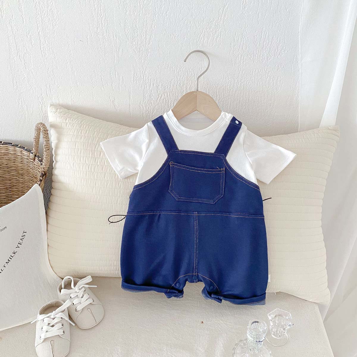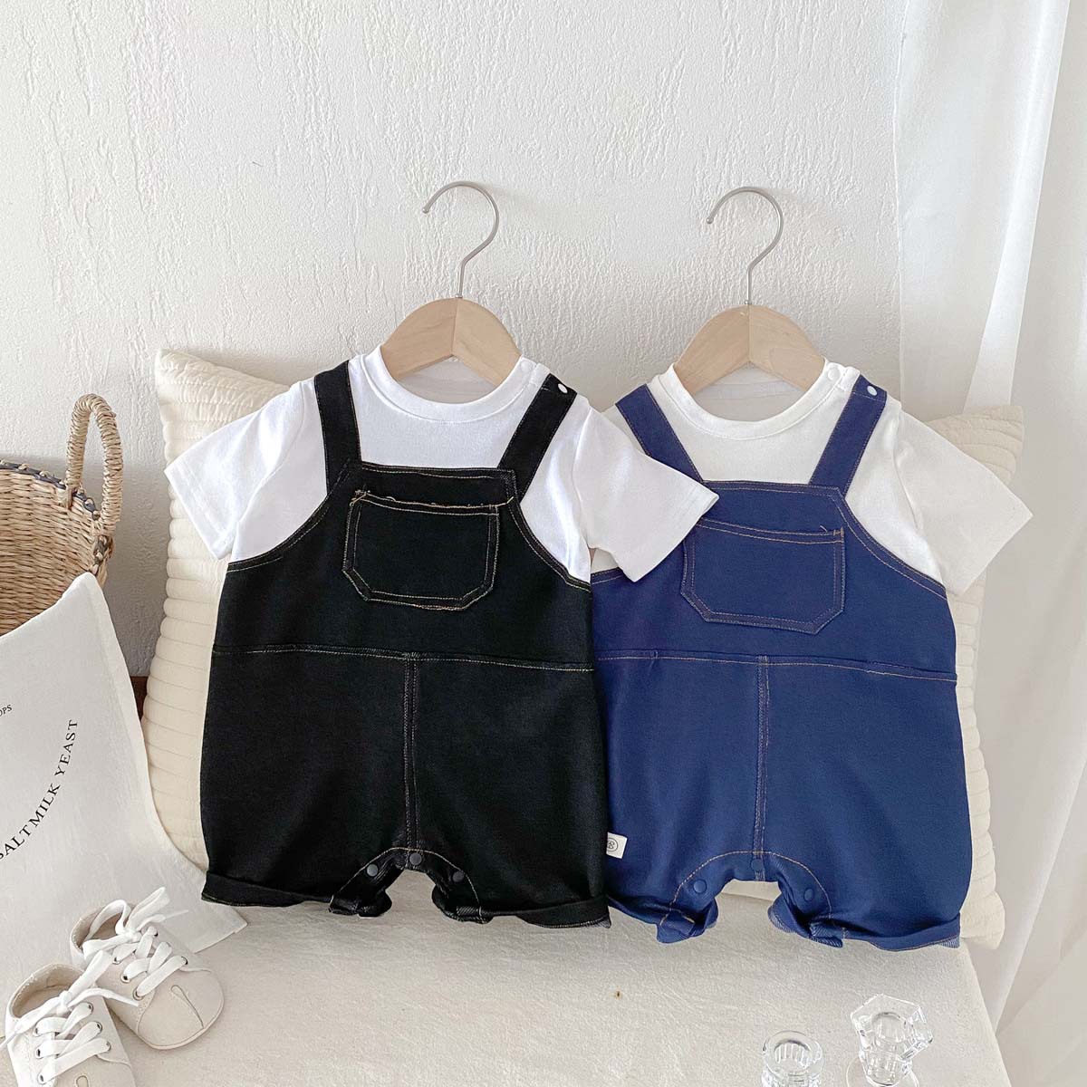 인스타일 한국식 소년 여름 반팔 점프 수트 가짜 투피스 서양식 여자 등반 세트