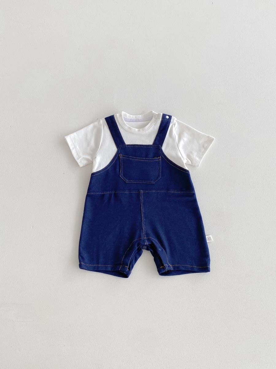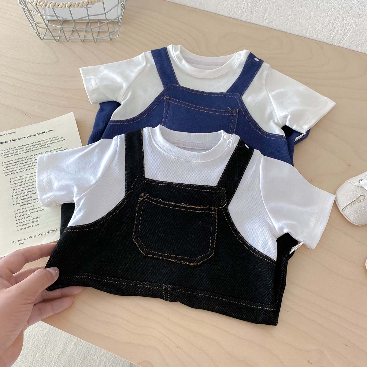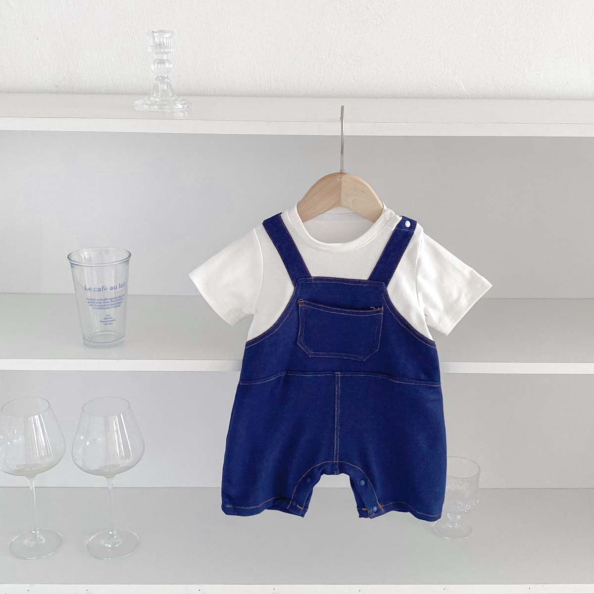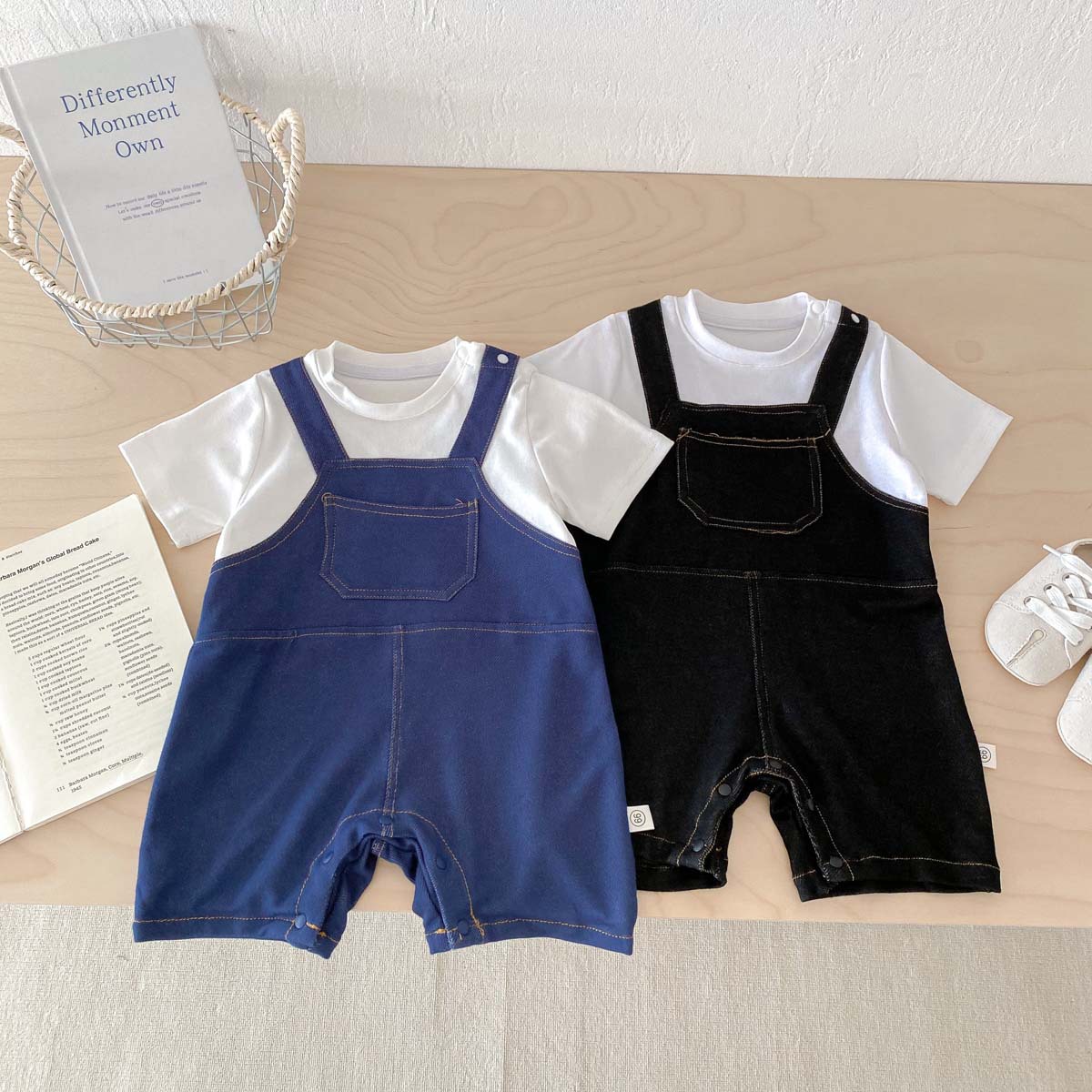 인스타일 한국식 소년 여름 반팔 점프 수트 가짜 투피스 서양식 여자 등반 세트