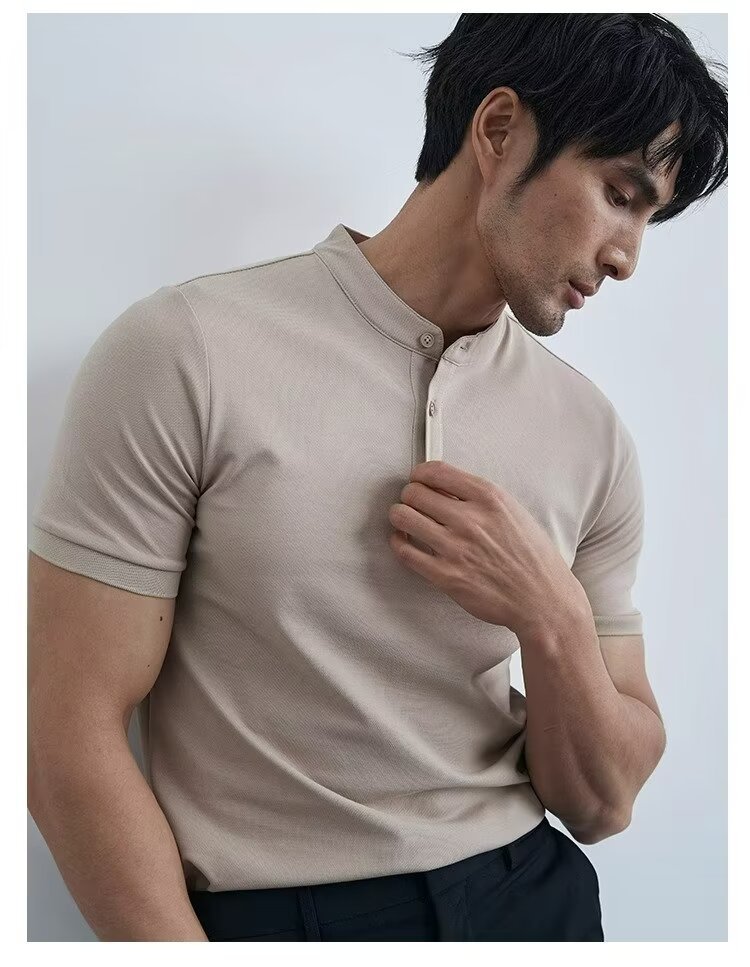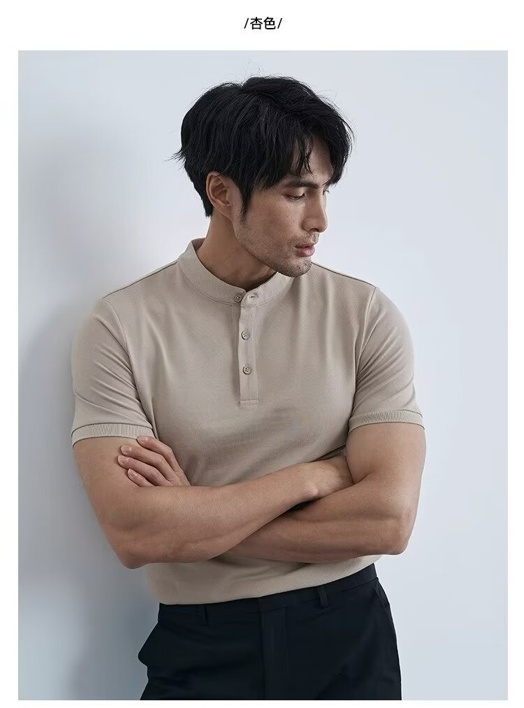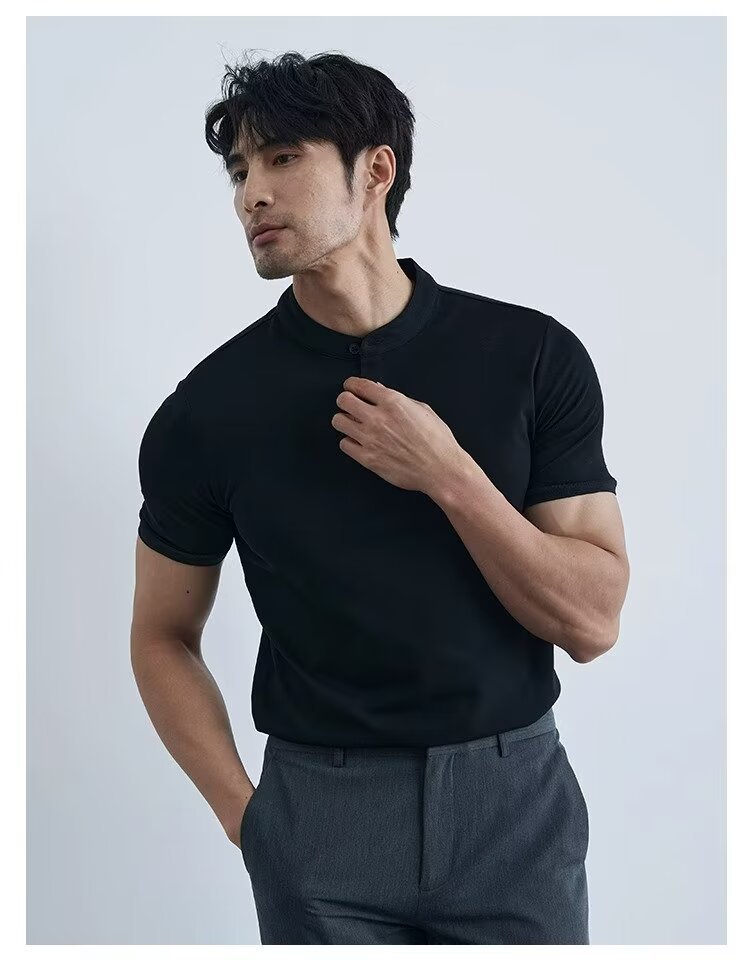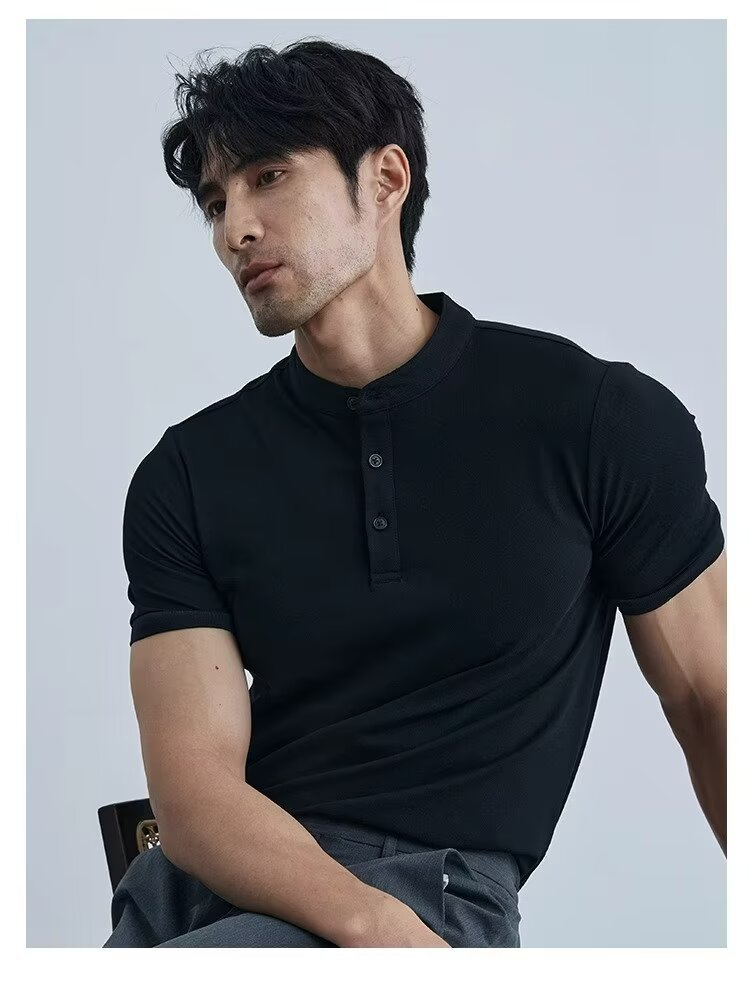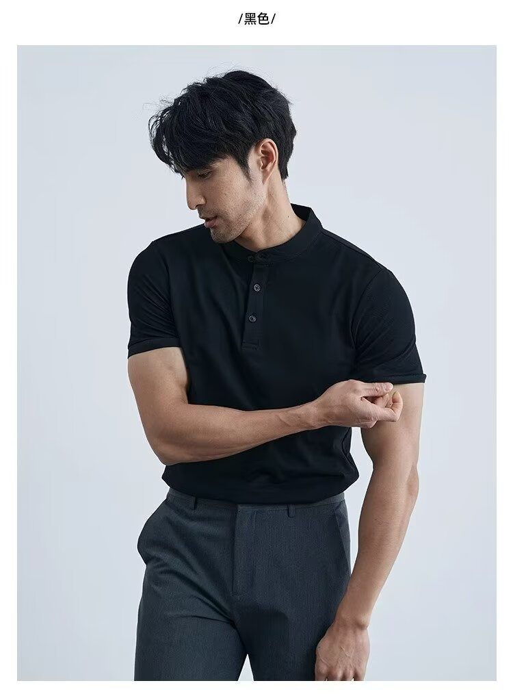 가벼운 성숙한 단색 헨리 칼라 단색 반팔 티셔츠 남성용 여름 슬림핏 폴로 셔츠 블랙 칼라 반소매 트렌디스토어 가기