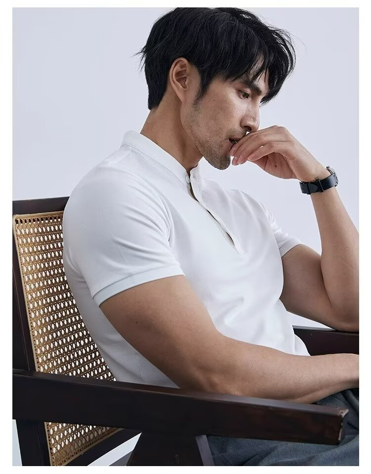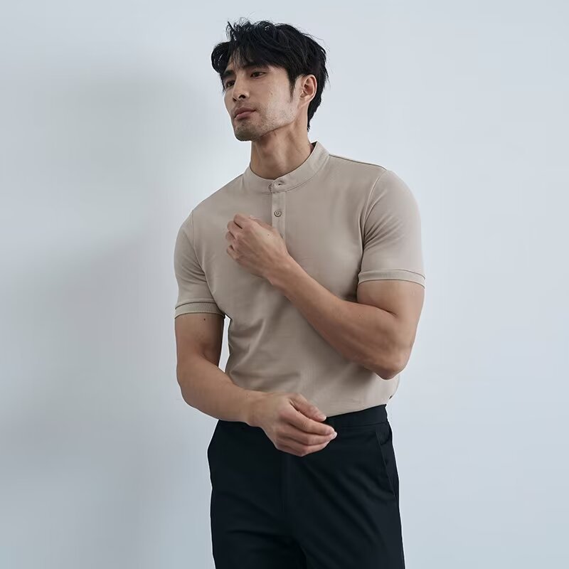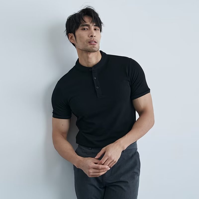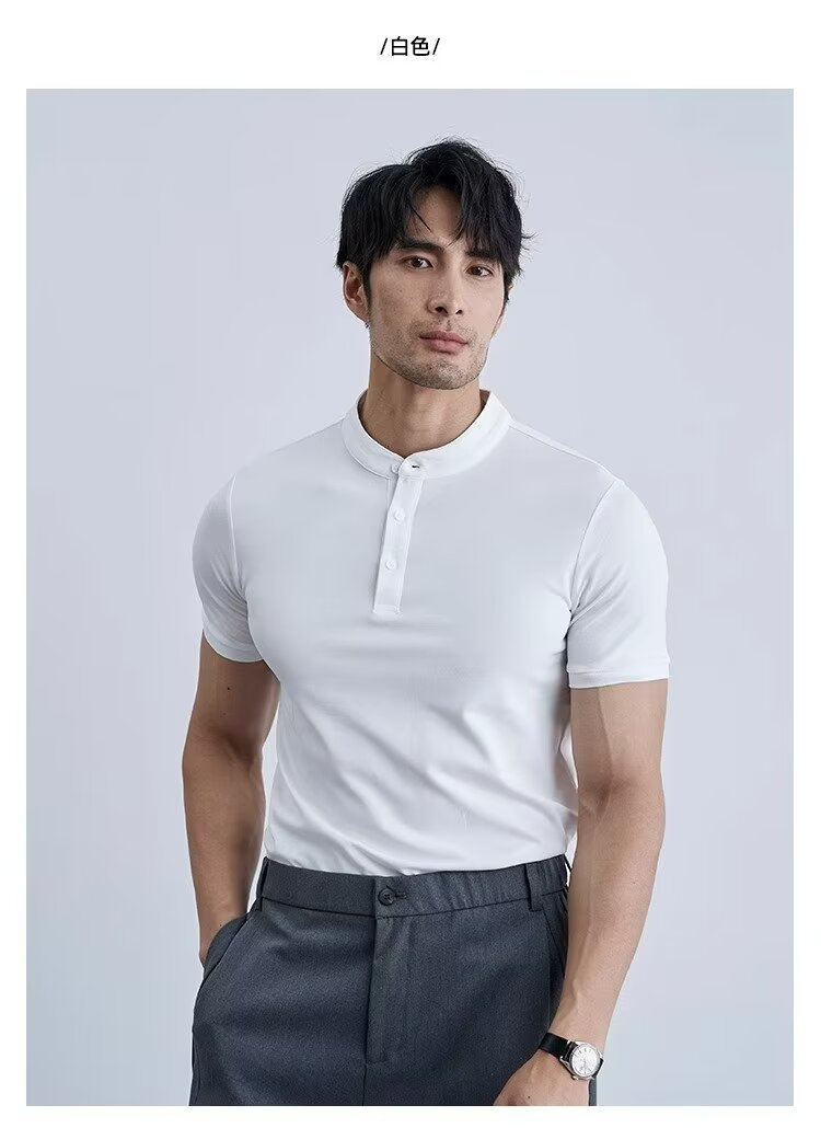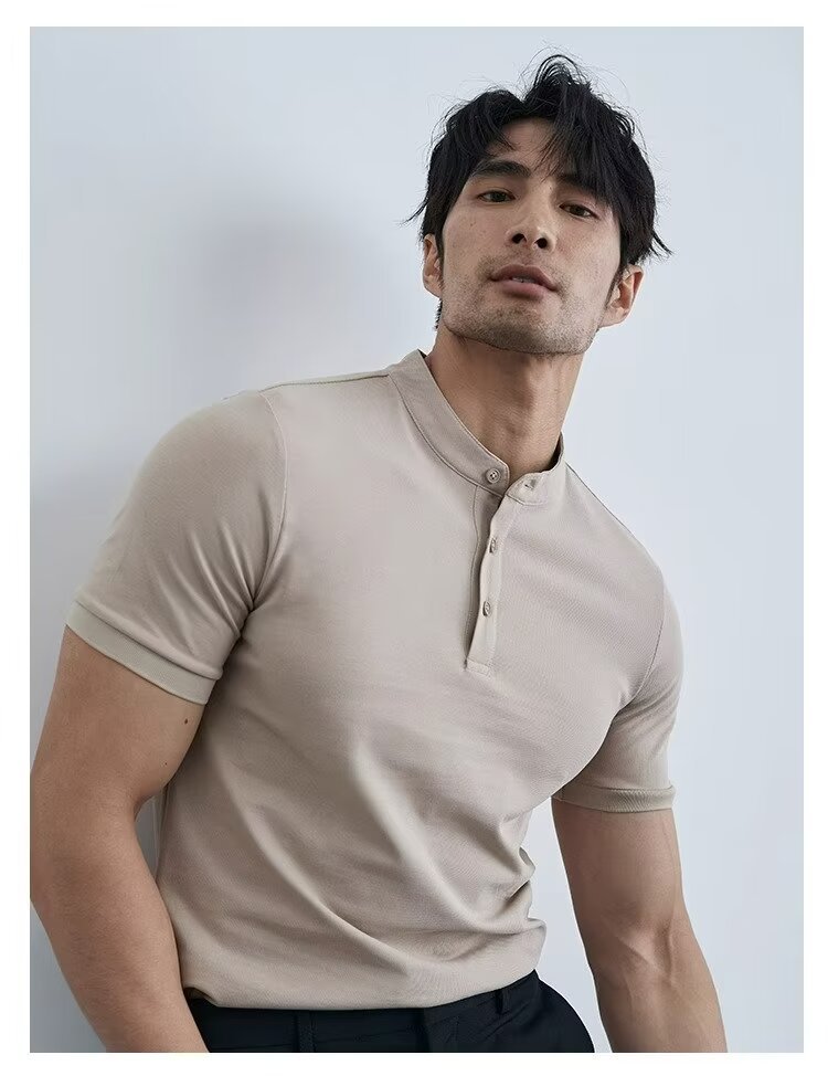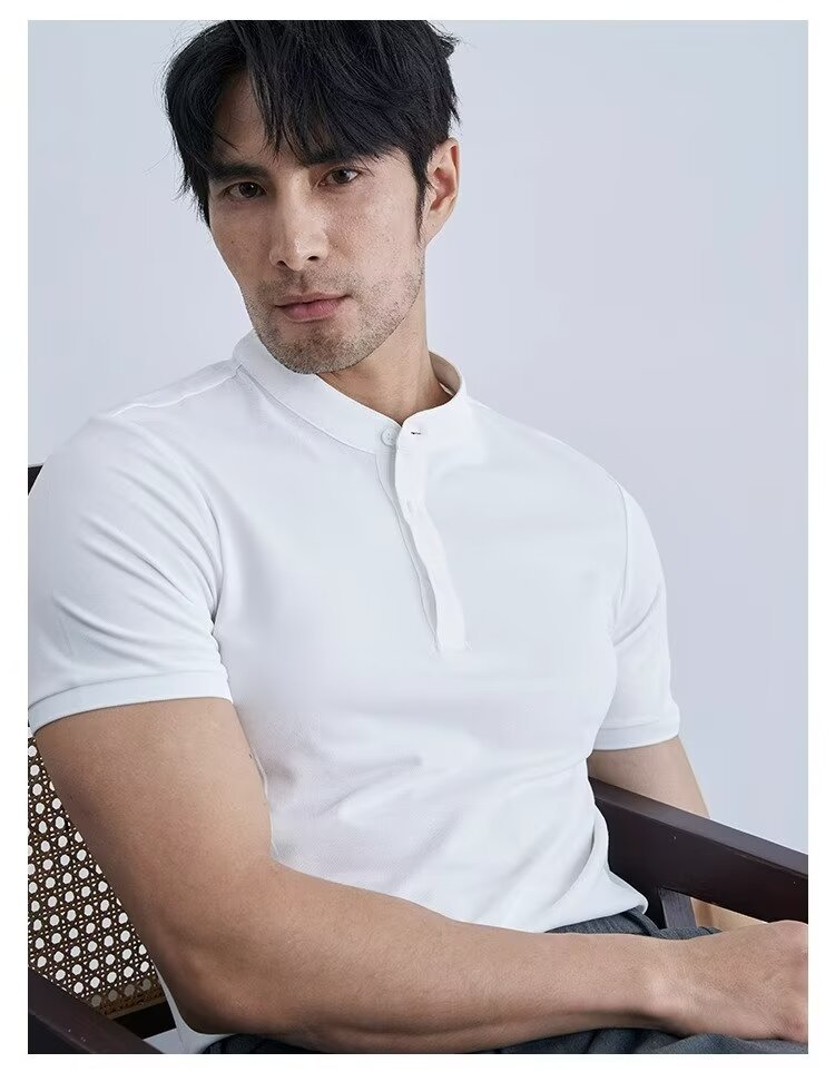 가벼운 성숙한 단색 헨리 칼라 단색 반팔 티셔츠 남성용 여름 슬림핏 폴로 셔츠 블랙 칼라 반소매 트렌디스토어 가기