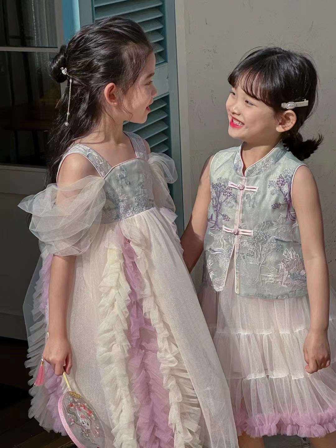 24 여름 새로운 중국 스타일 무거운 산업 어깨 스커트 부드러운 복고풍 소녀 메쉬 원피스 공주 원피스스토어 가기