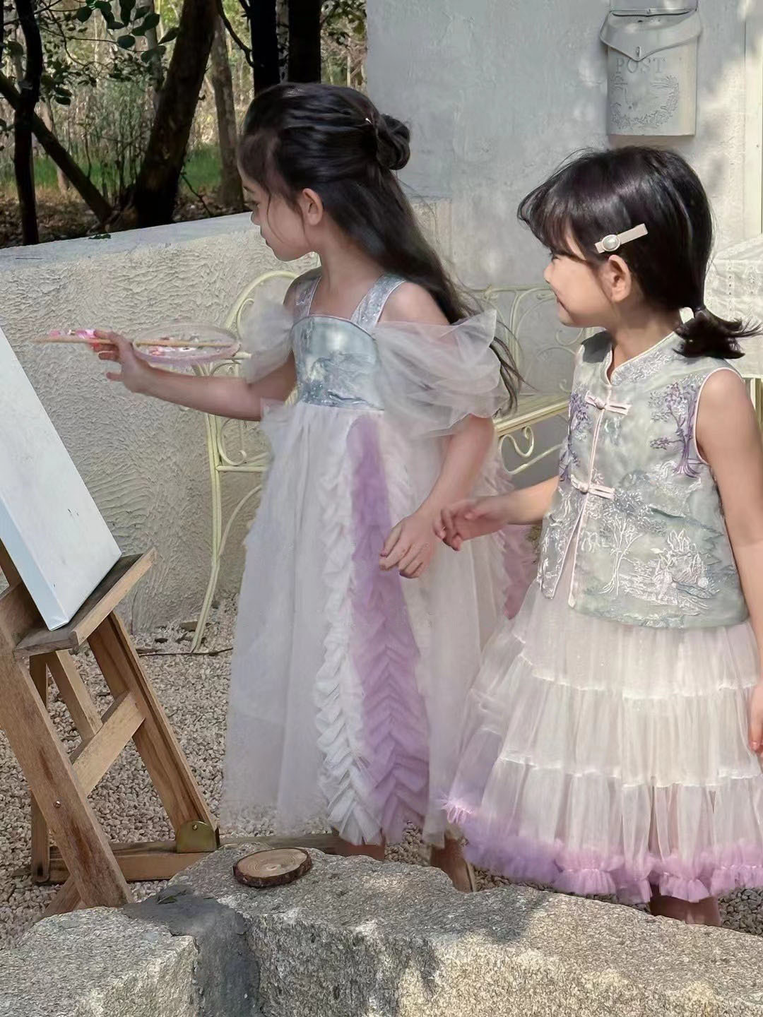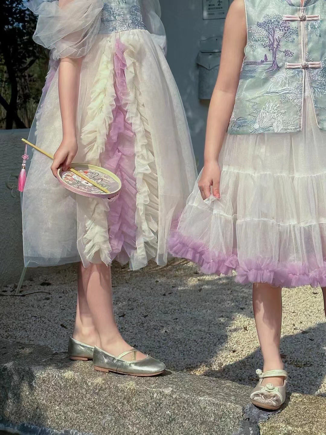 24 여름 새로운 중국 스타일 무거운 산업 어깨 스커트 부드러운 복고풍 소녀 메쉬 원피스 공주 원피스