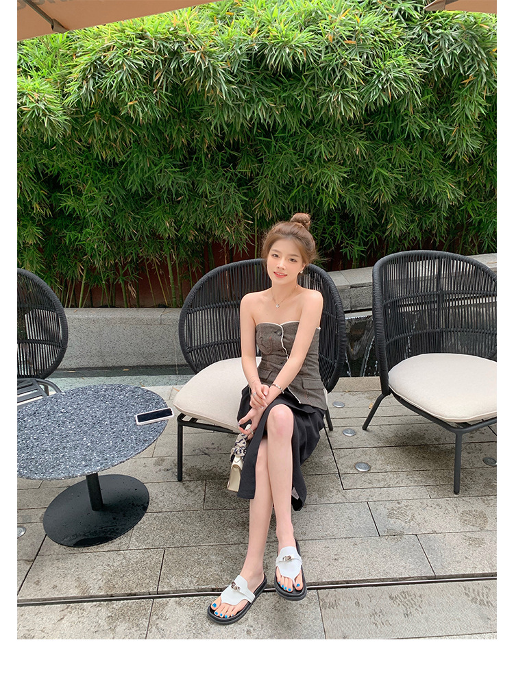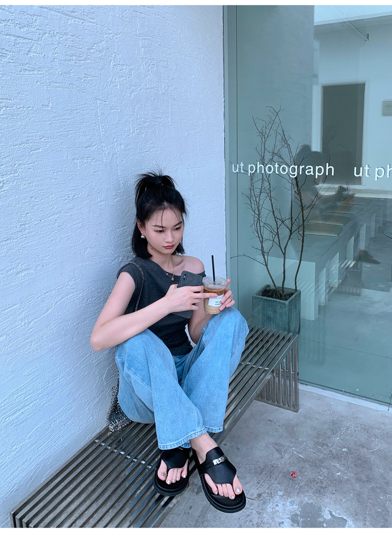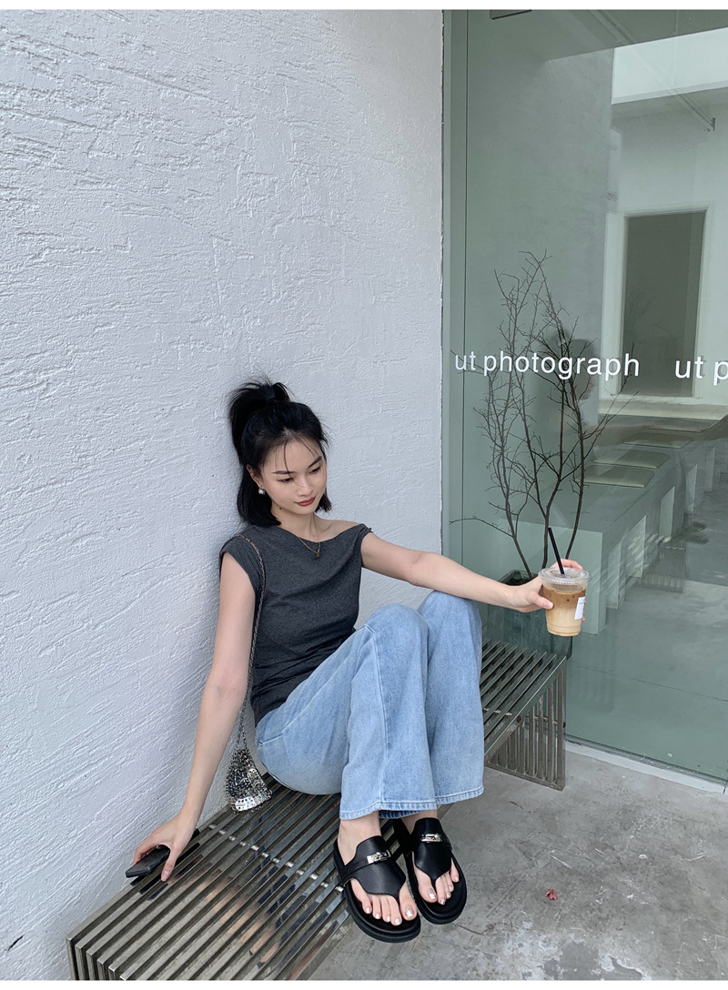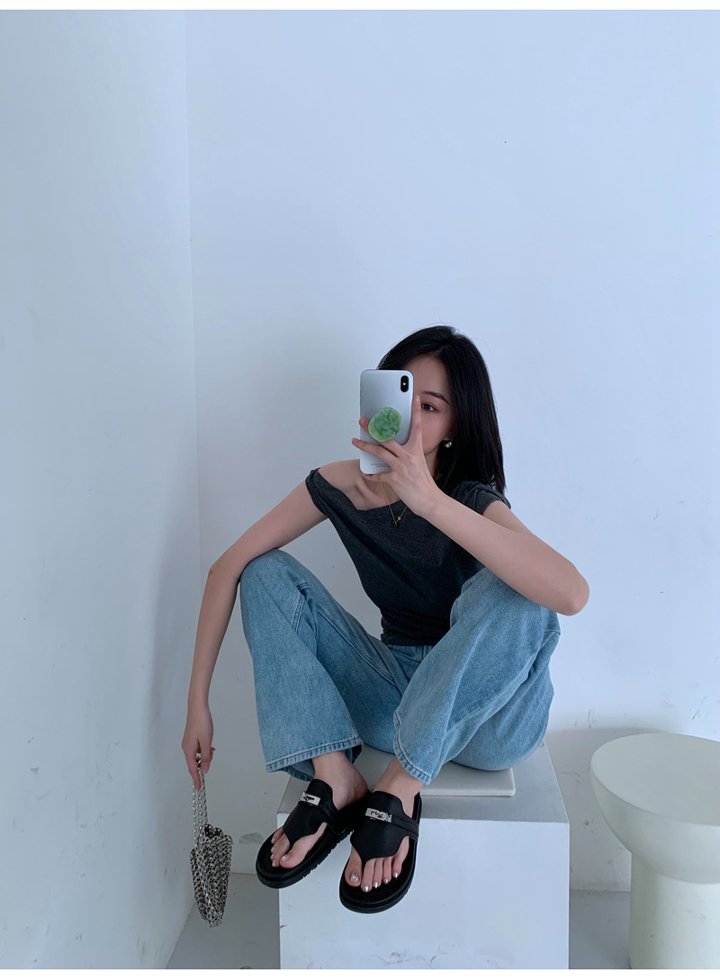 2024 년 여름 새로운 통 실버 버클 헤링스타일 로마 플랫 여성 레트로 Cowhide 플랫 캐주얼 샌들