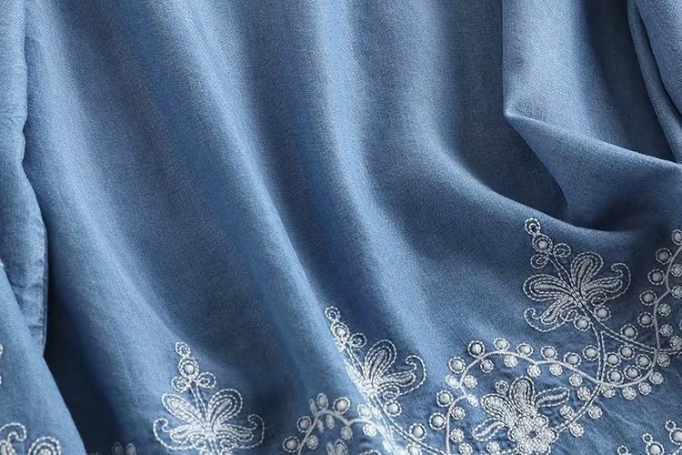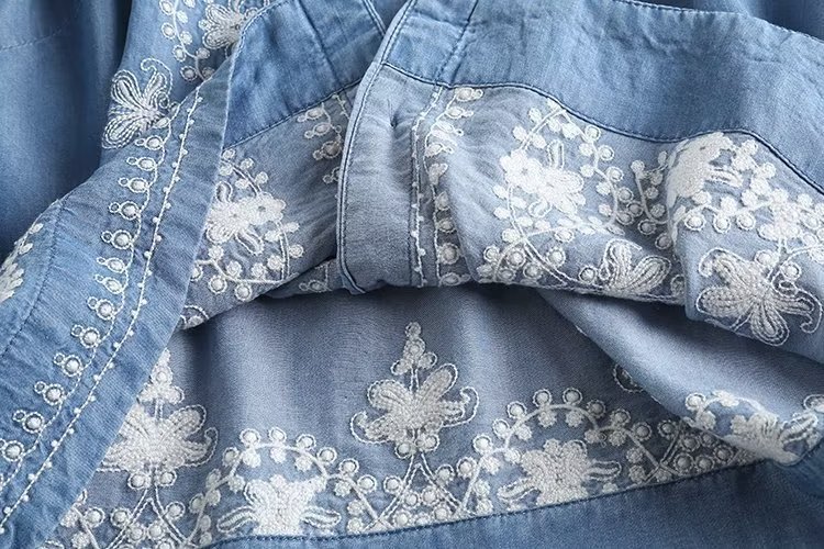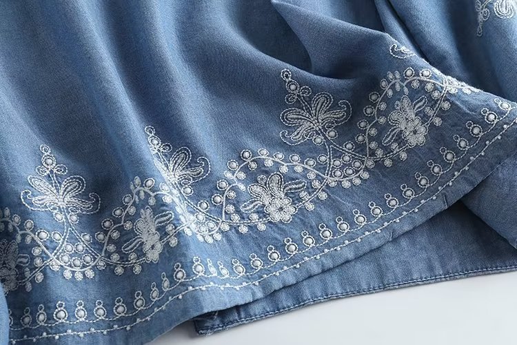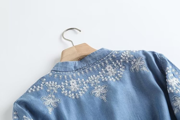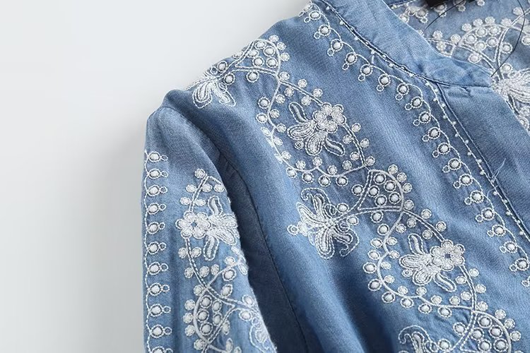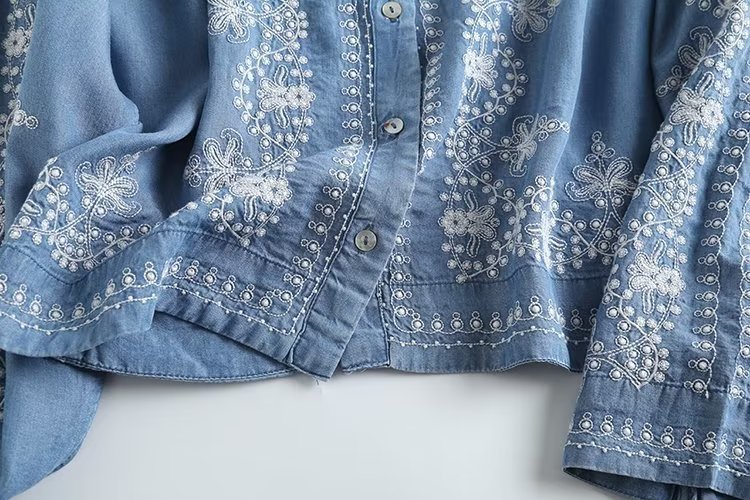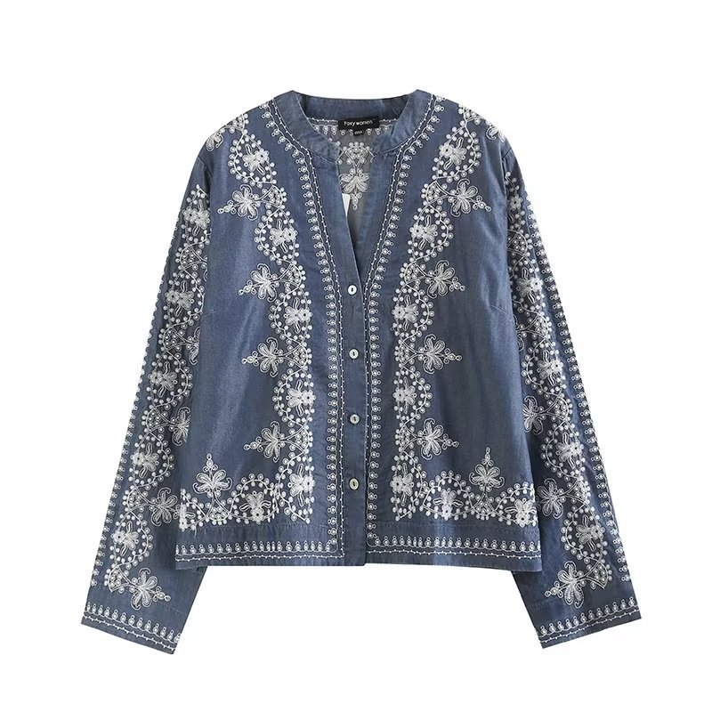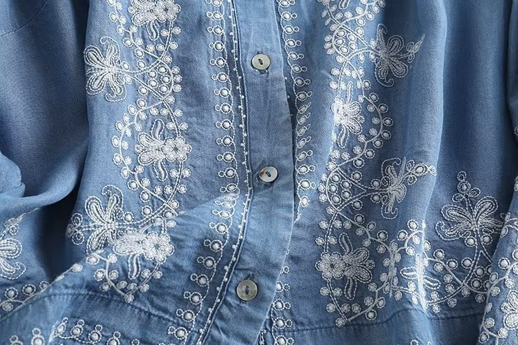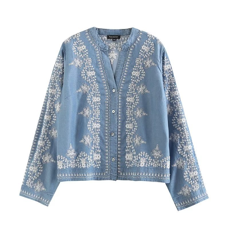 국경 도매 2024 여름 여성의 새로운 유럽 및 미국 V 넥 중공업 자수 긴 소매 캐주얼 데님 텐셀 셔츠스토어 가기