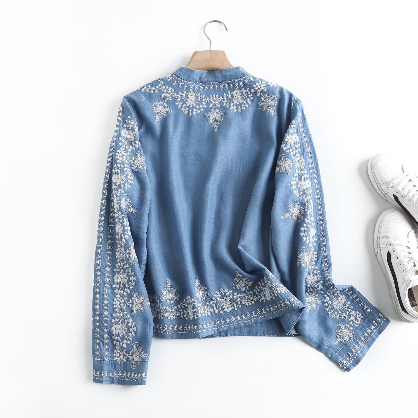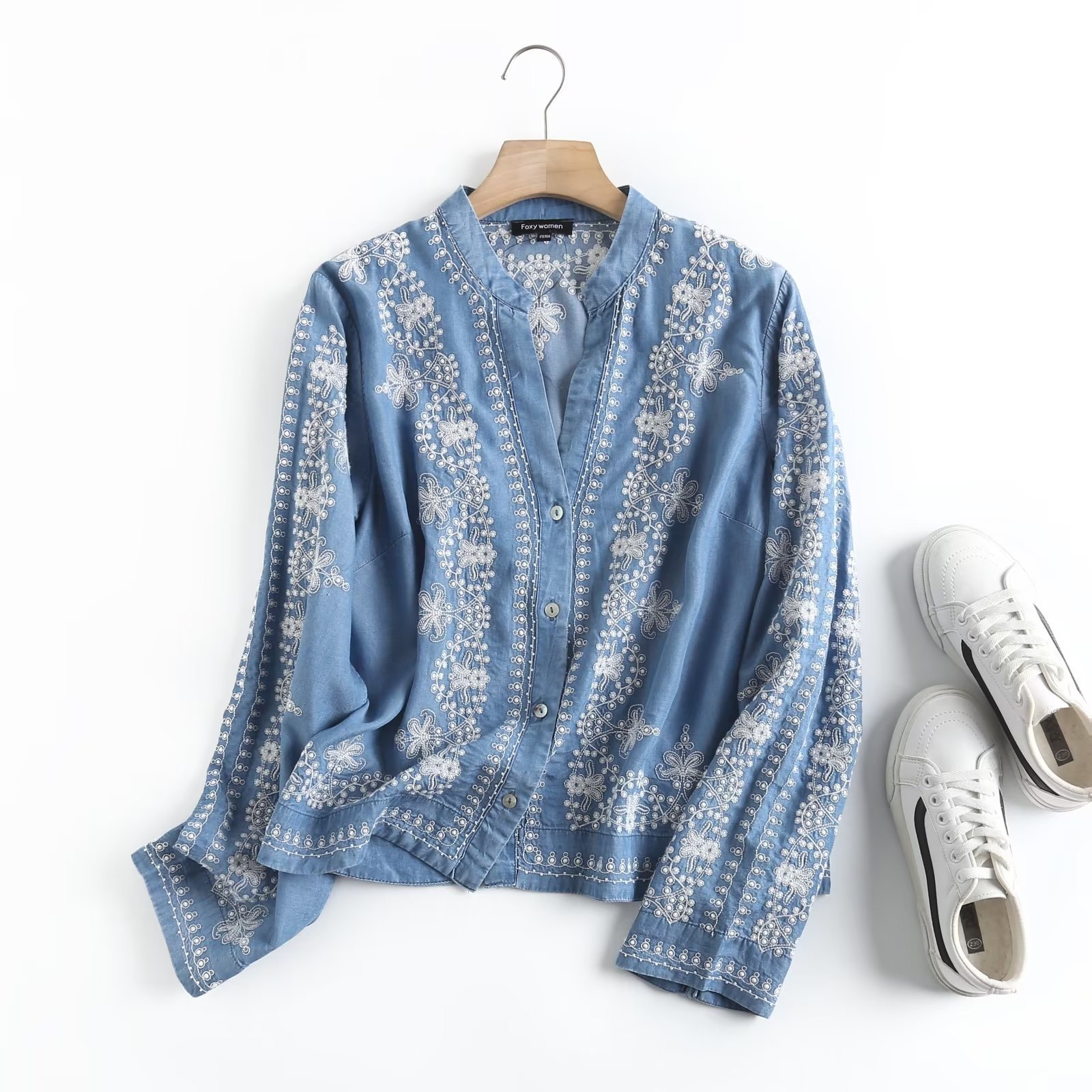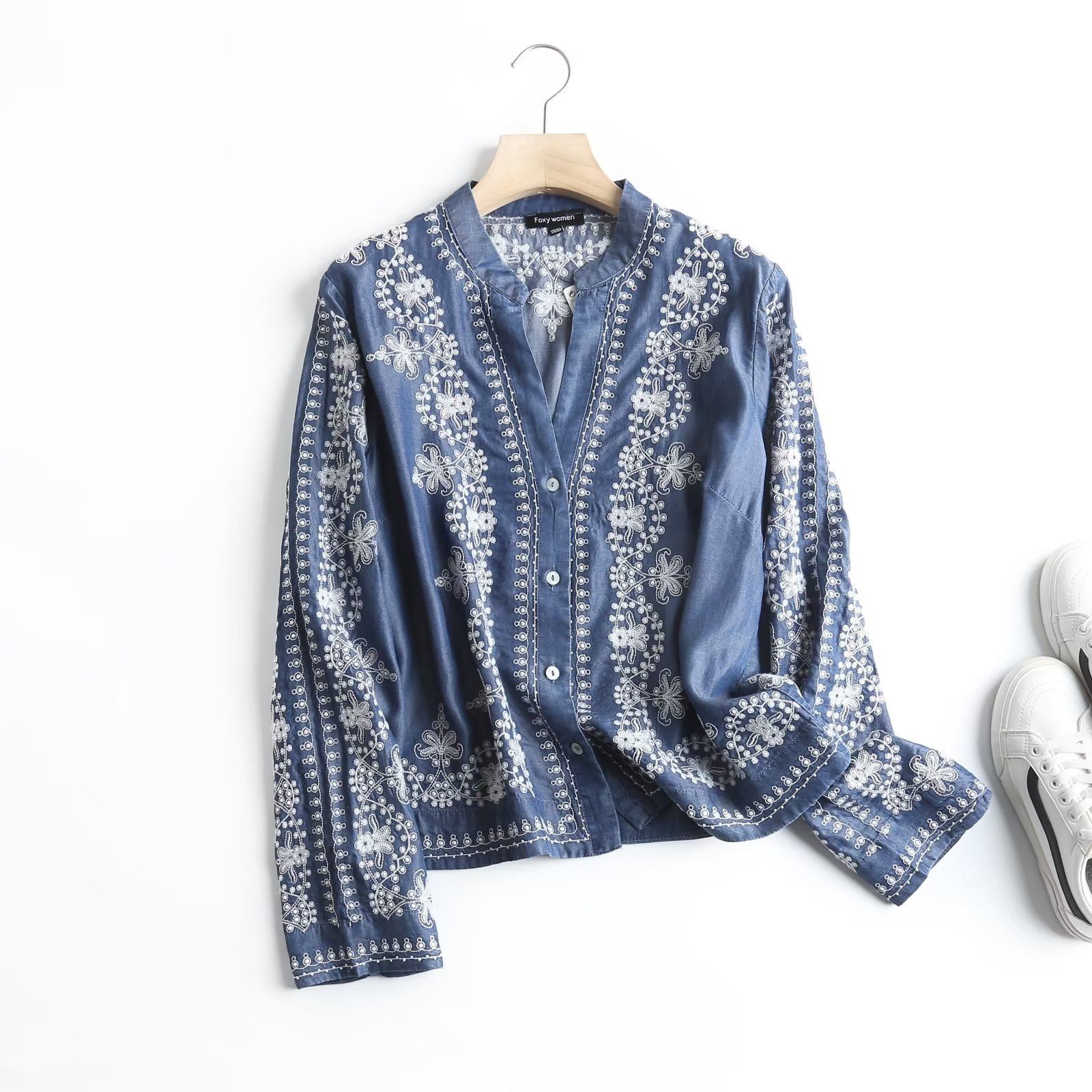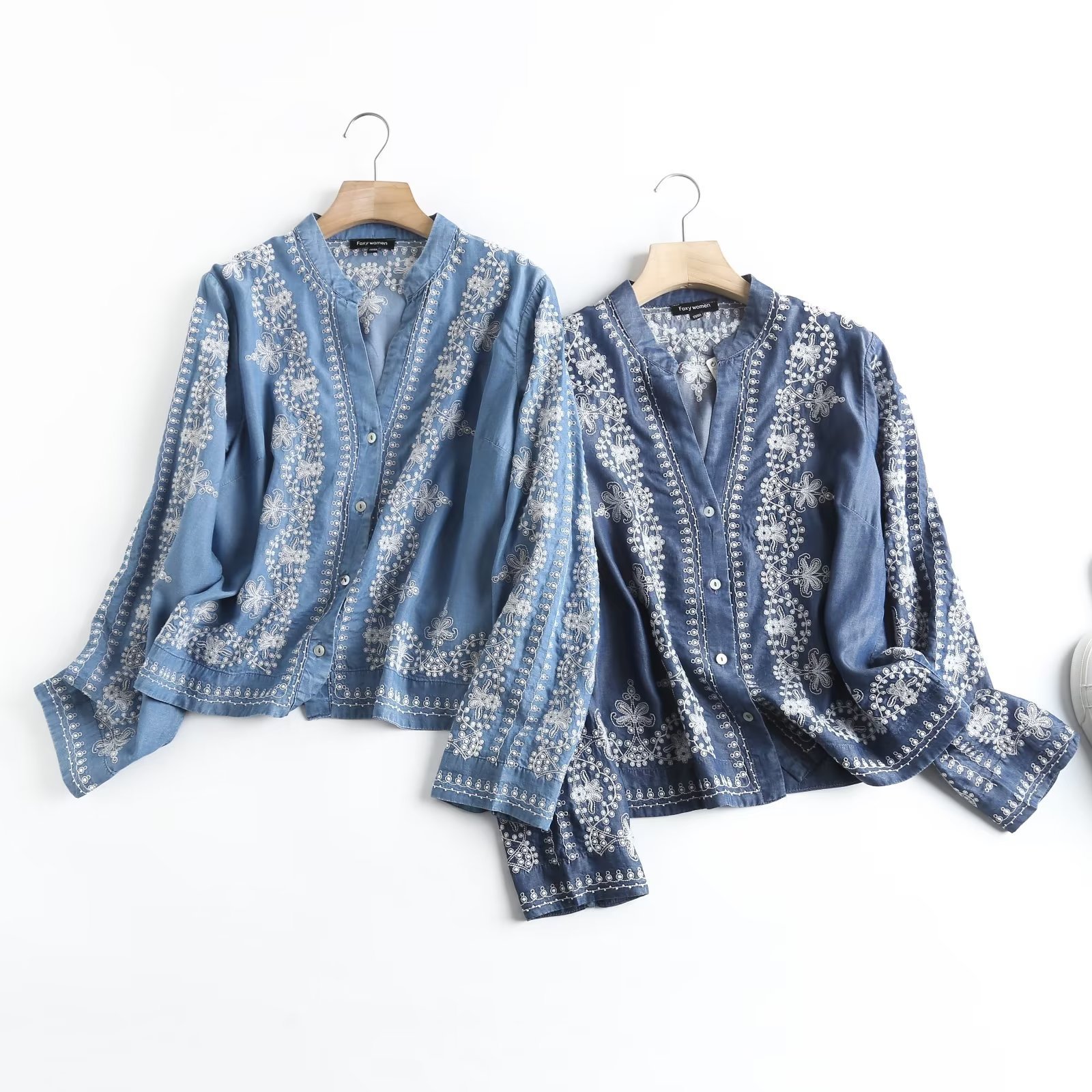 국경 도매 2024 여름 여성의 새로운 유럽 및 미국 V 넥 중공업 자수 긴 소매 캐주얼 데님 텐셀 셔츠스토어 가기