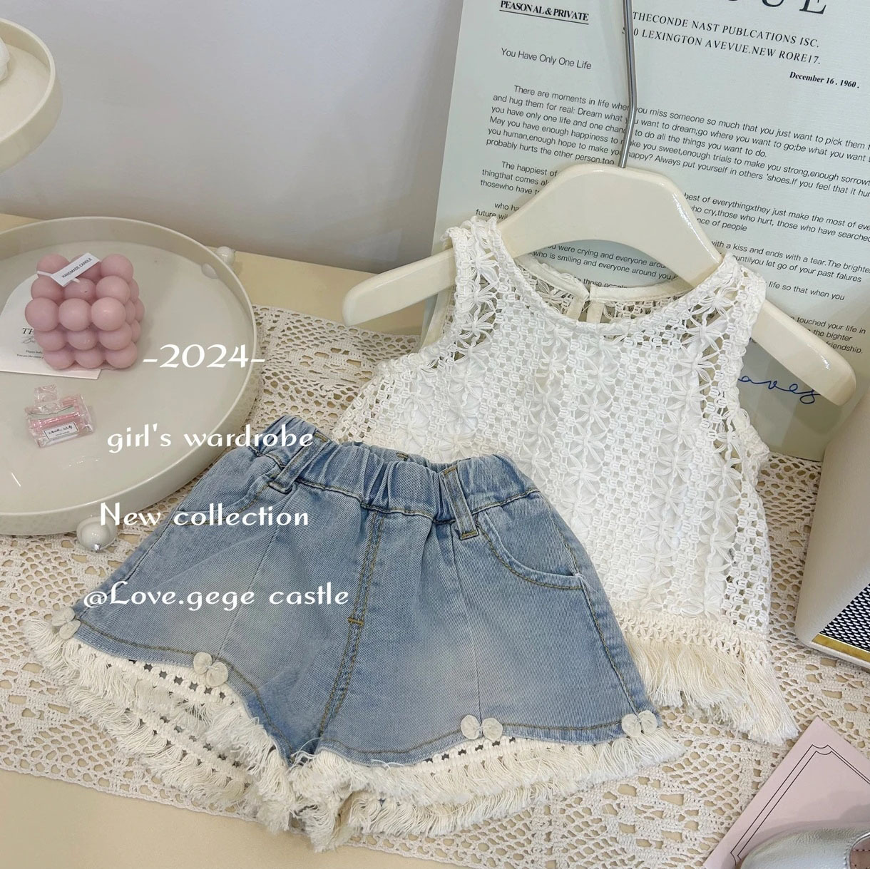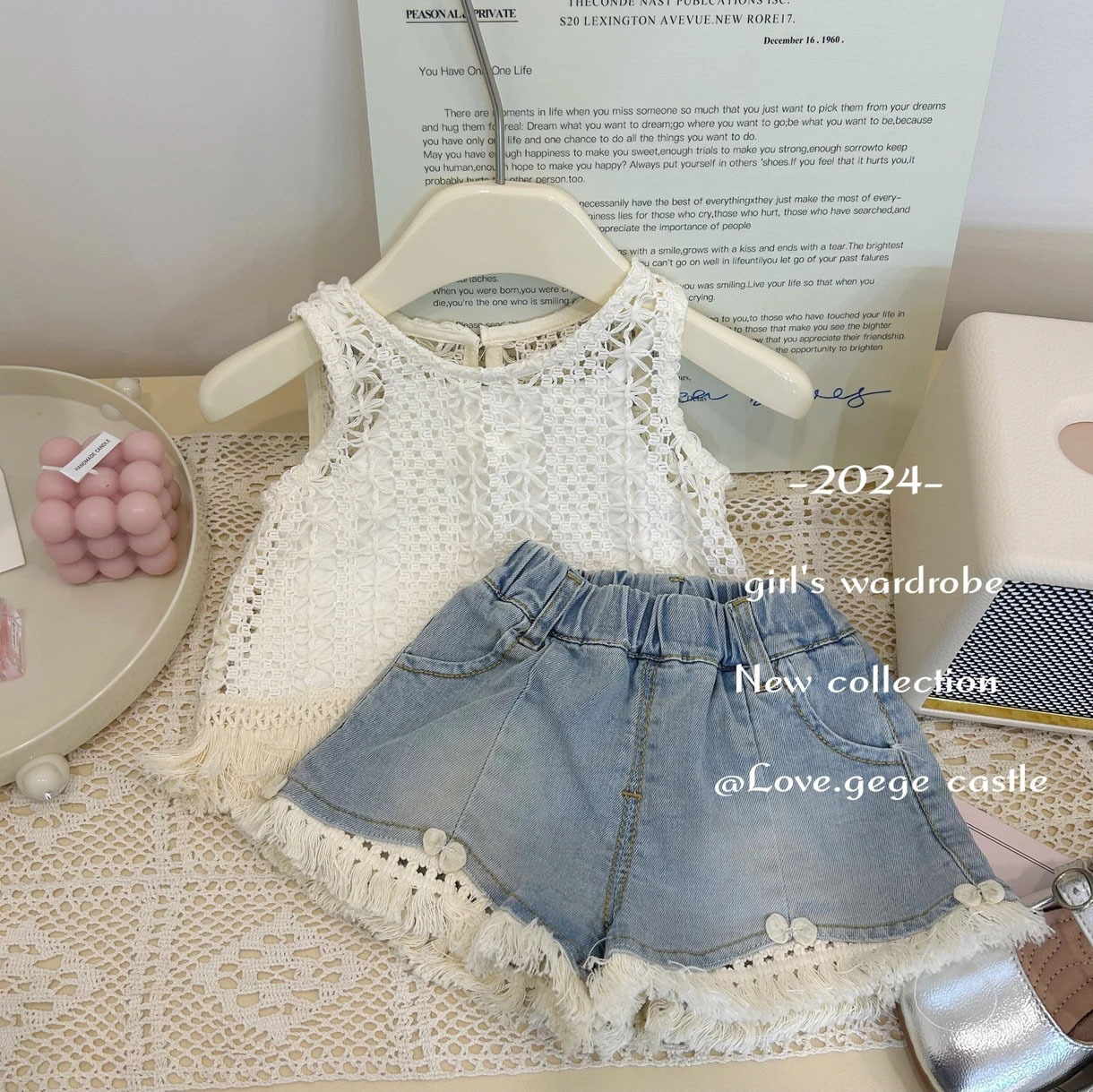 Tong Xingyuan 한국식 아동복 새로운 여름 소녀 중공 조끼 탑 어린이 스타일 데님 반바지 투피스 세트스토어 가기