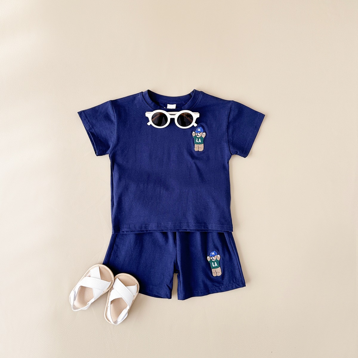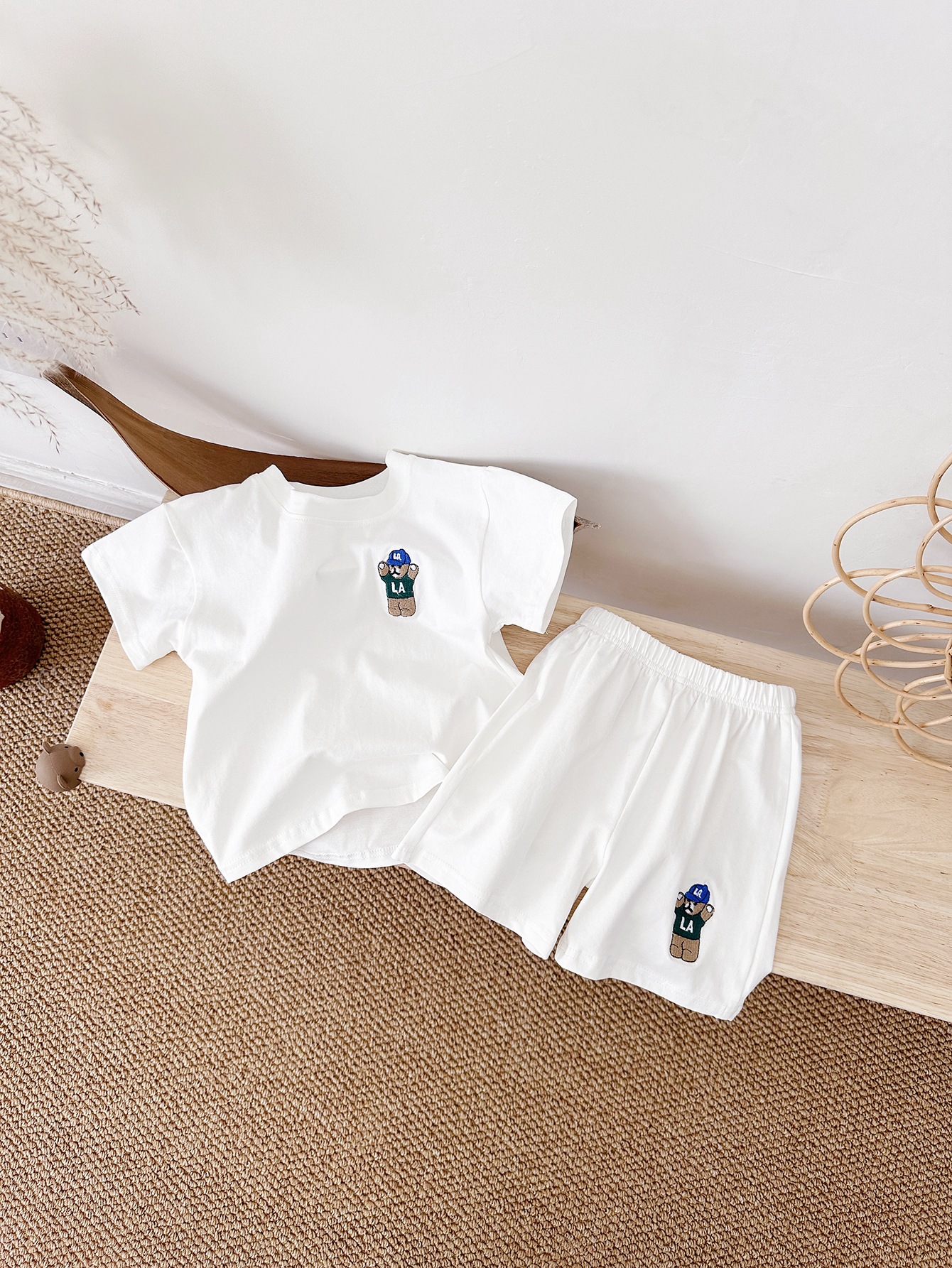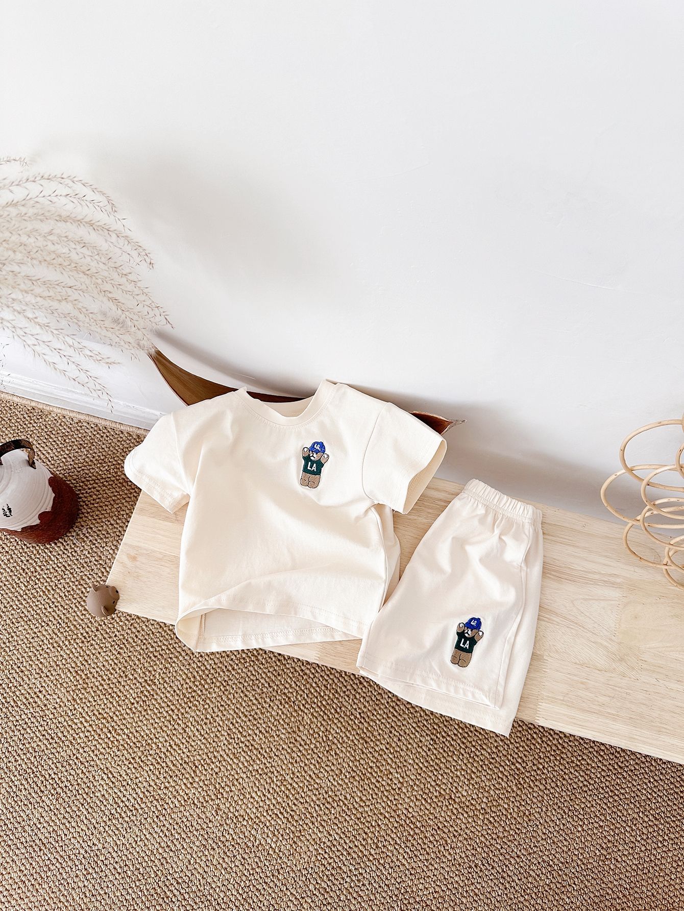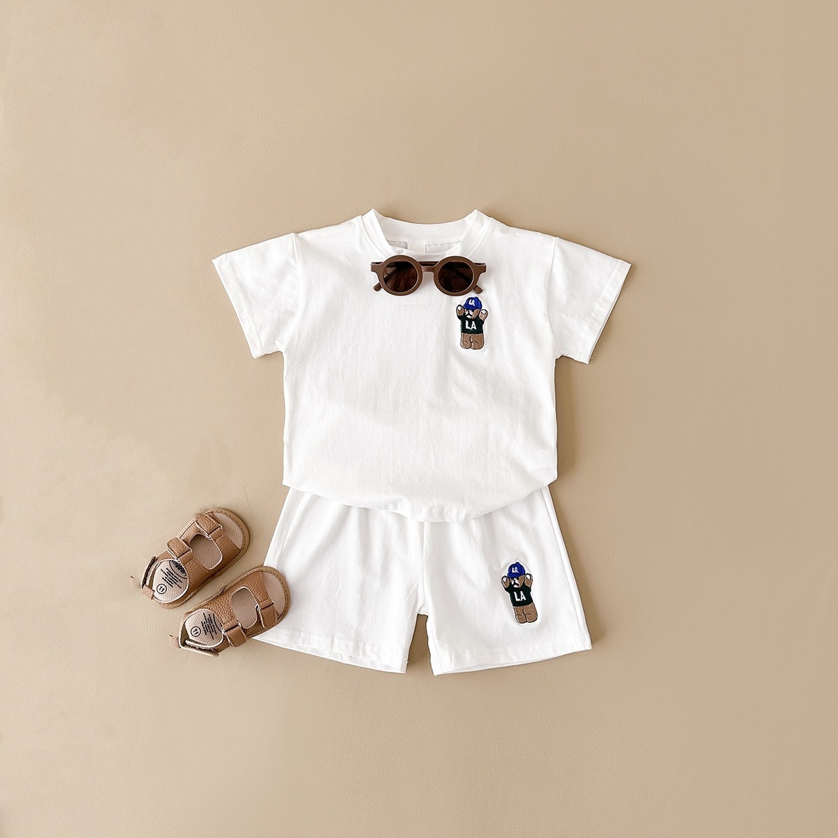 여름 어린이 귀여운 곰 수 놓은 반팔 세트 한국 남녀 아기 의류 투피스 국경 대외 무역