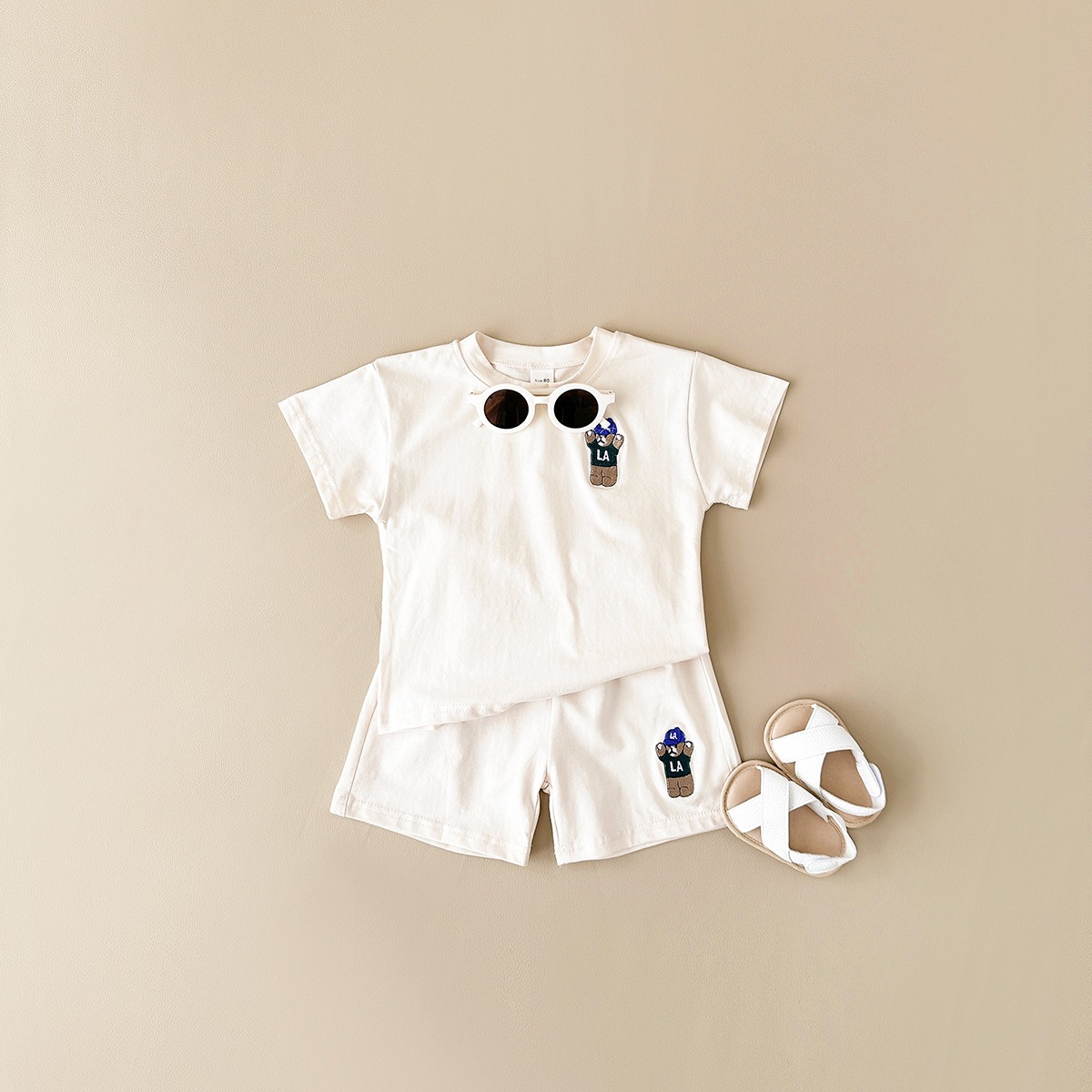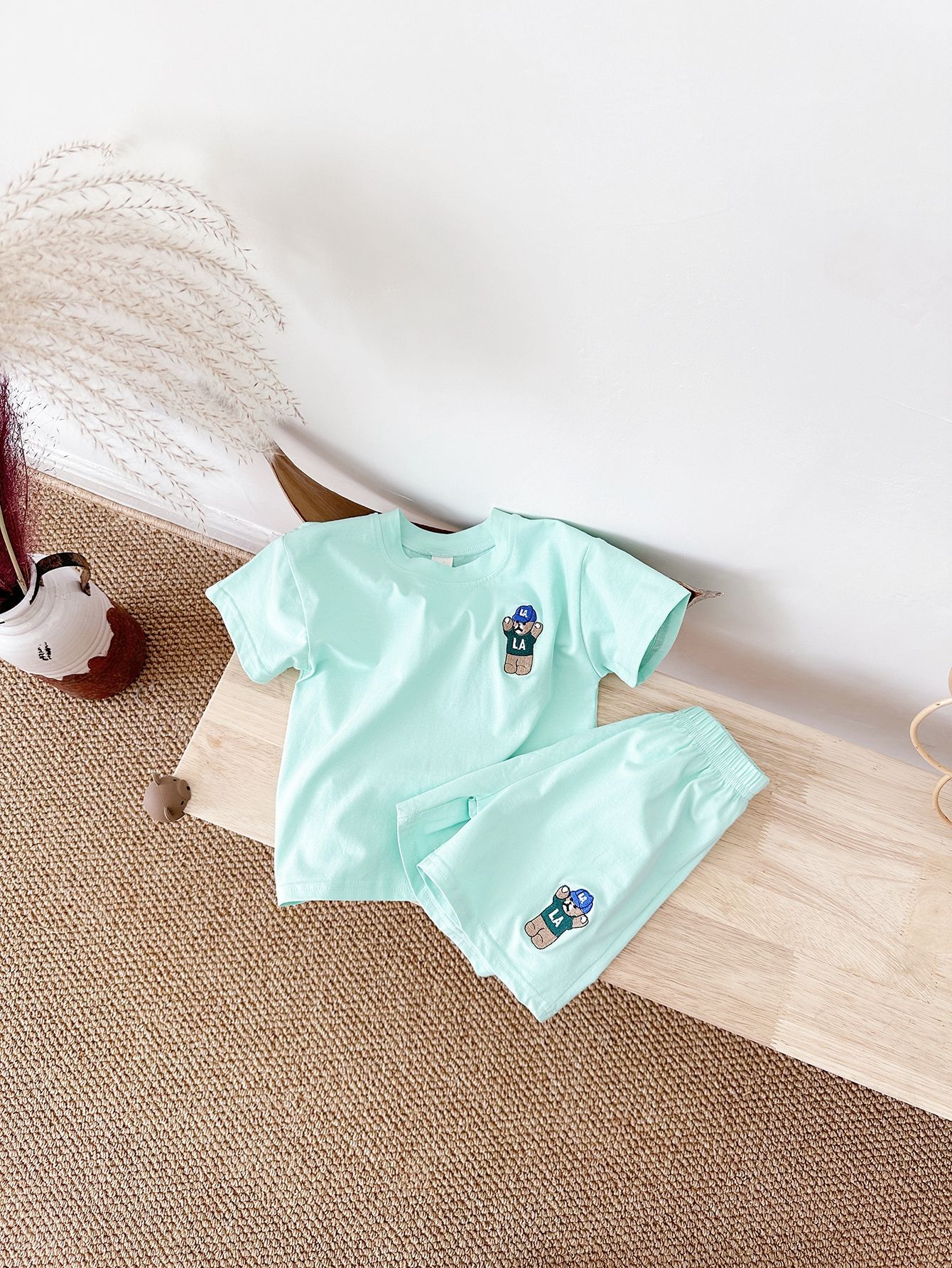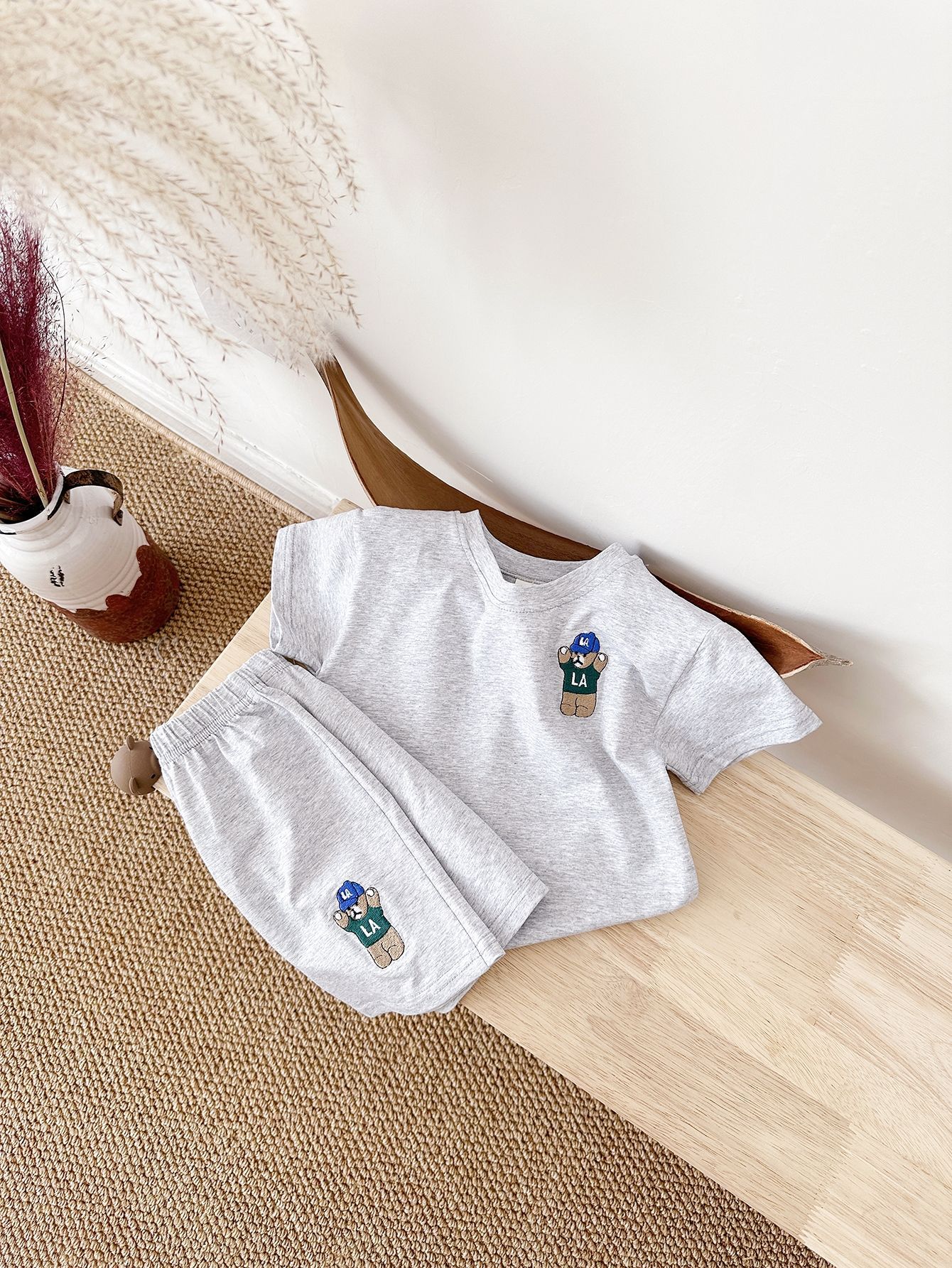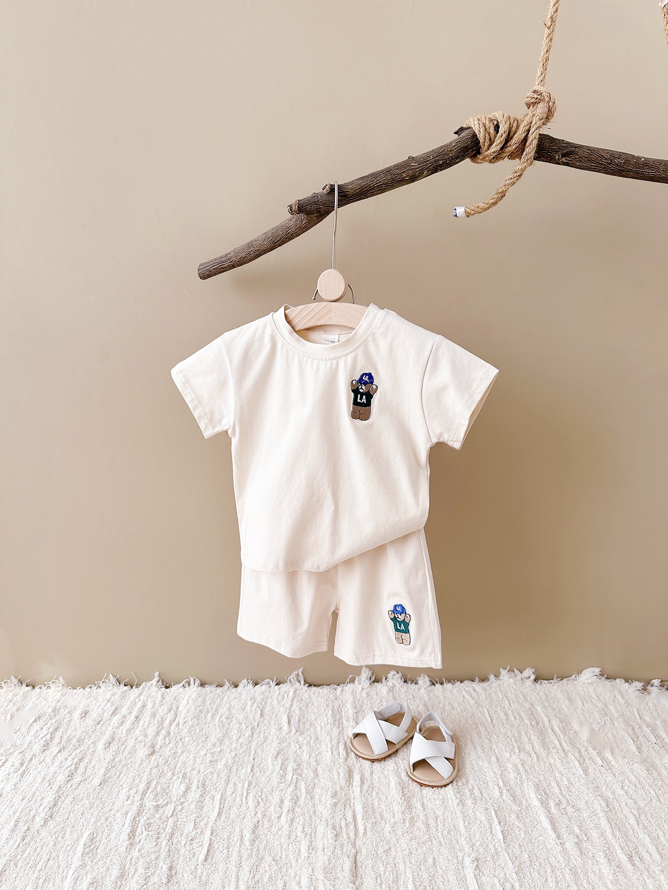 여름 어린이 귀여운 곰 수 놓은 반팔 세트 한국 남녀 아기 의류 투피스 국경 대외 무역