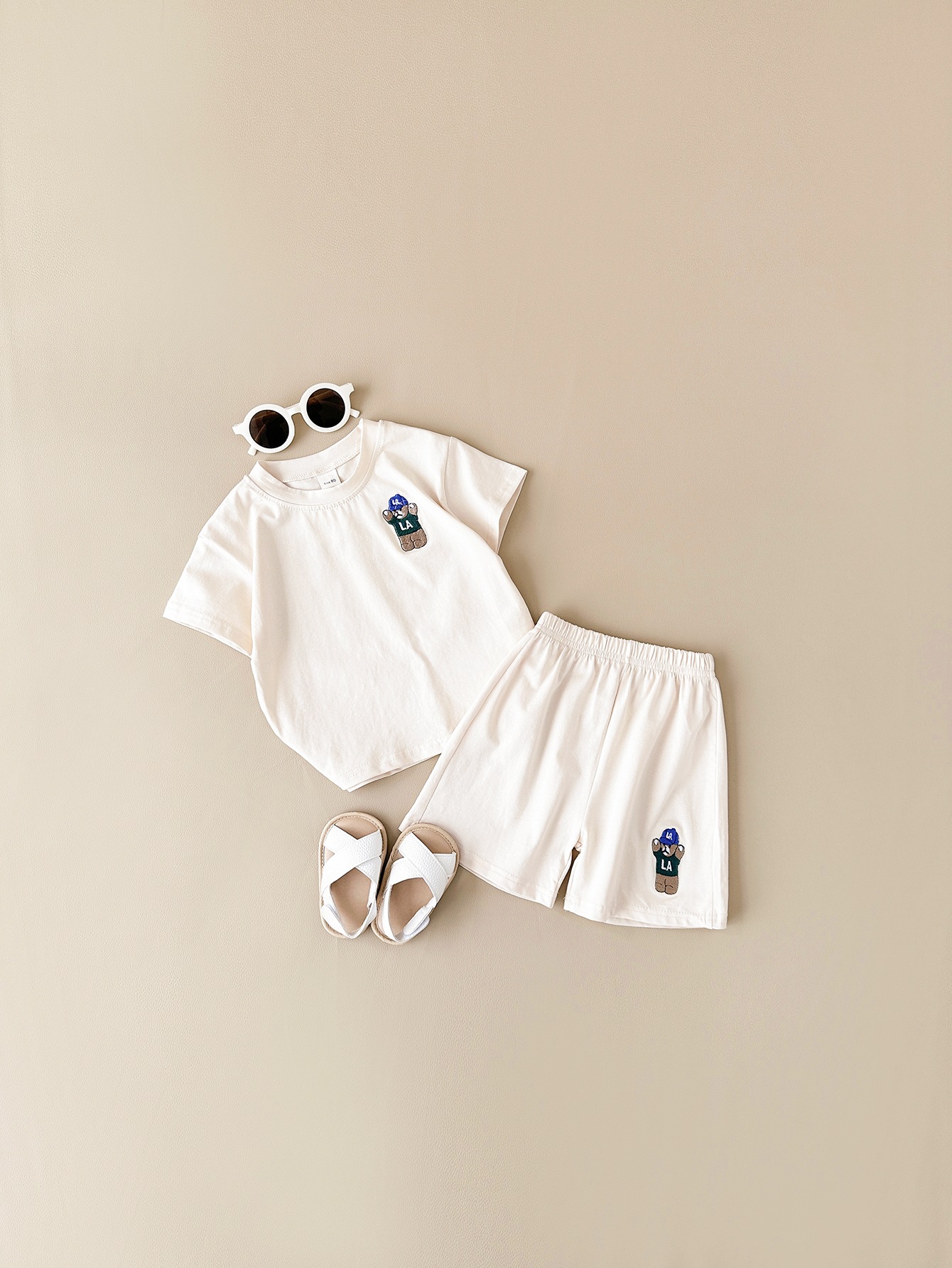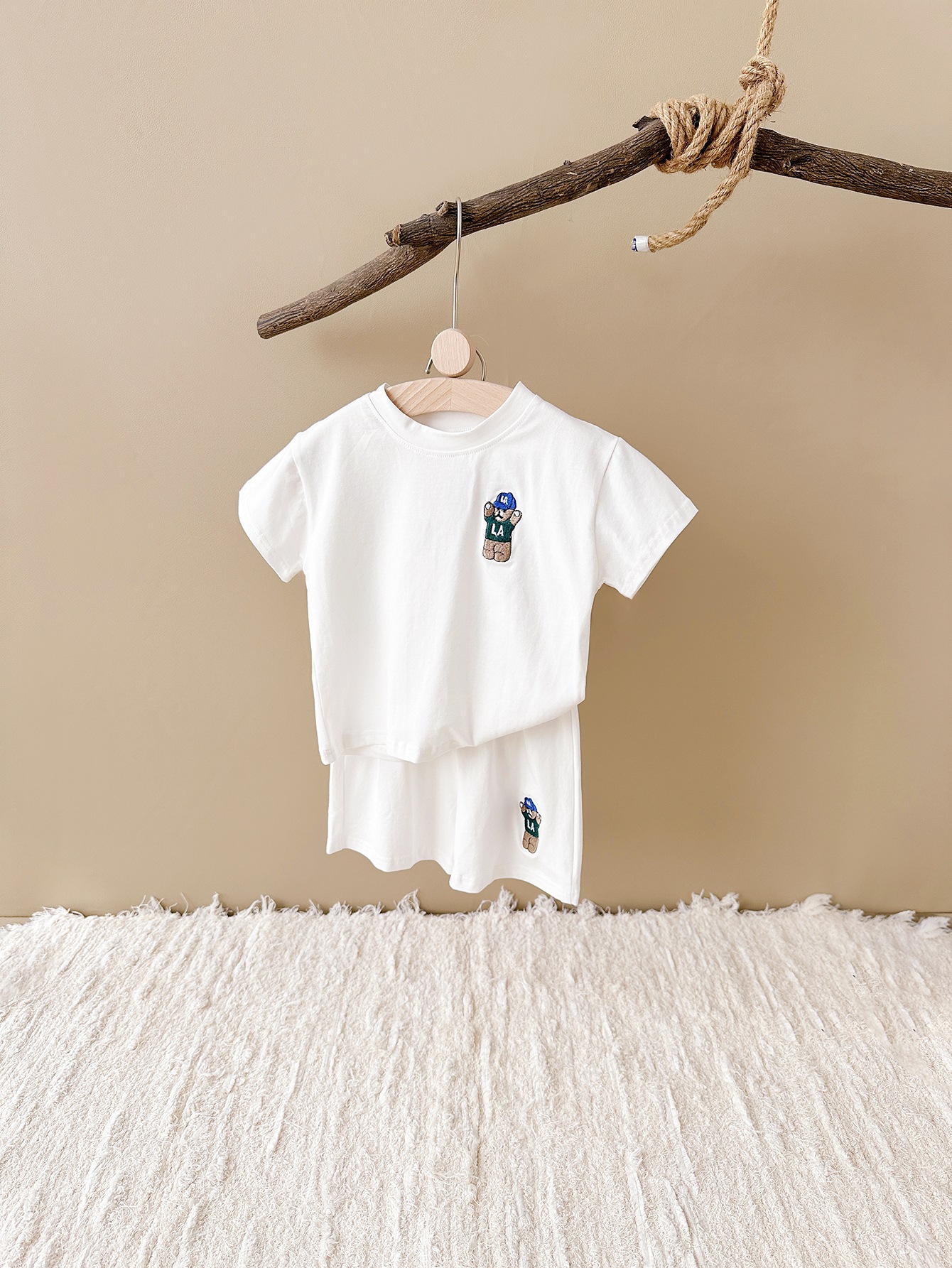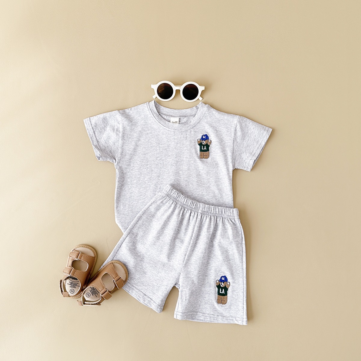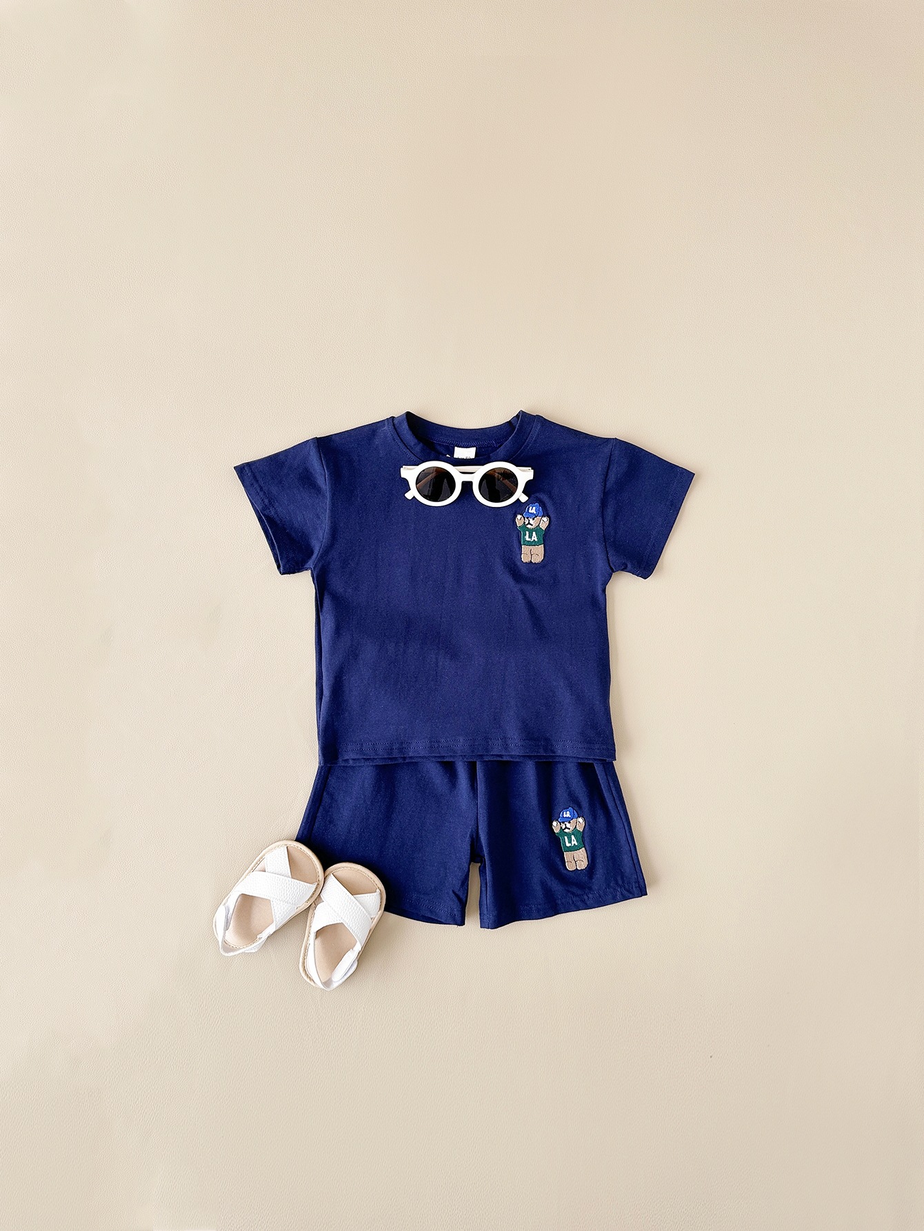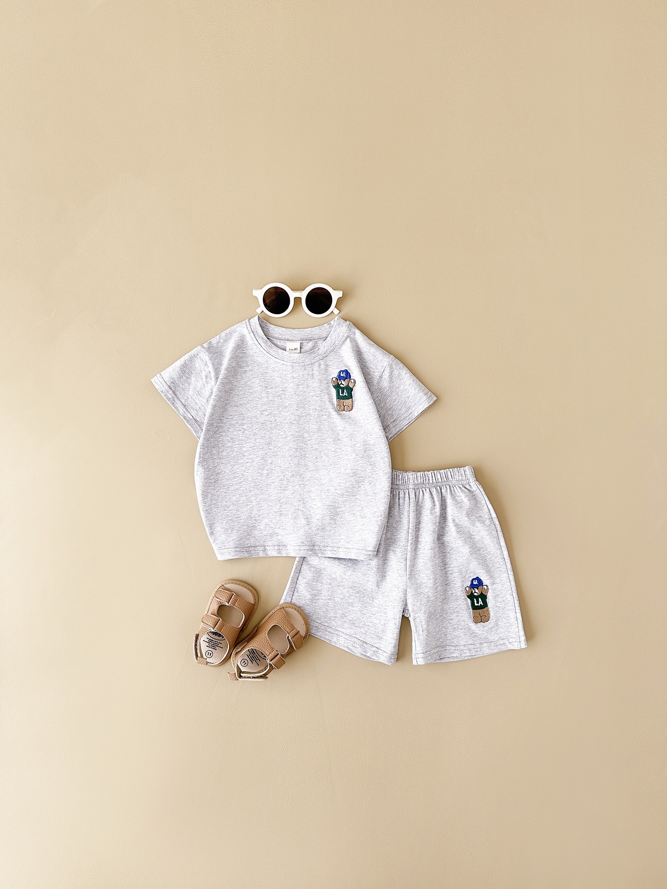 여름 어린이 귀여운 곰 수 놓은 반팔 세트 한국 남녀 아기 의류 투피스 국경 대외 무역