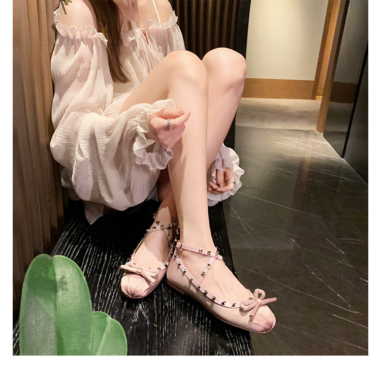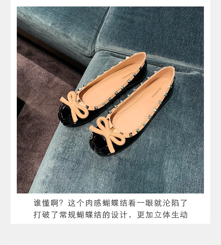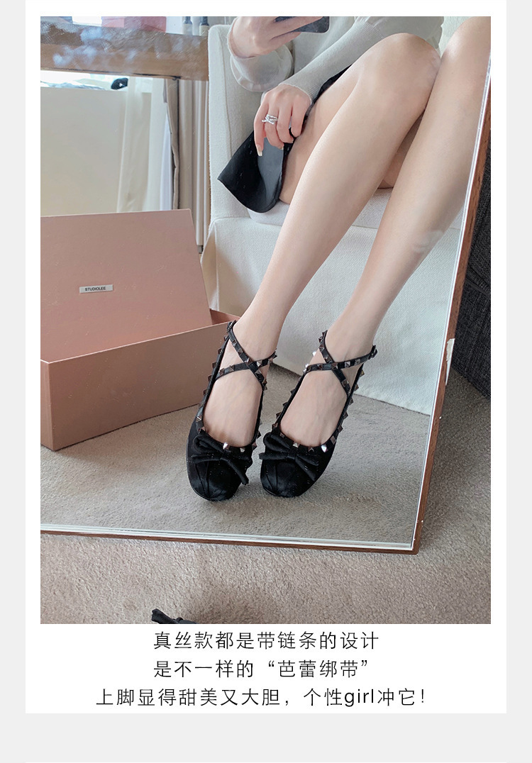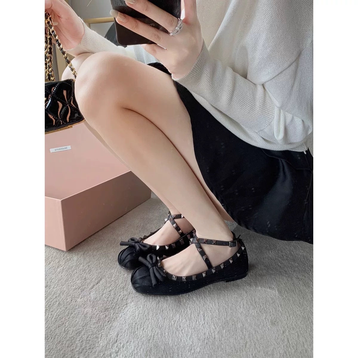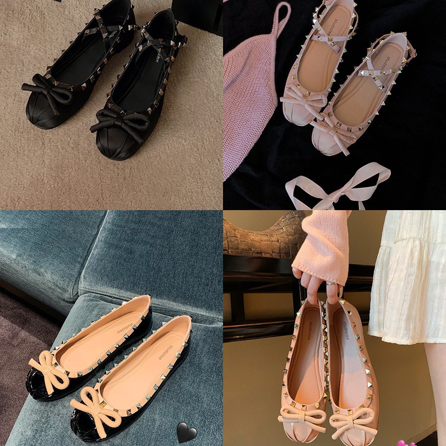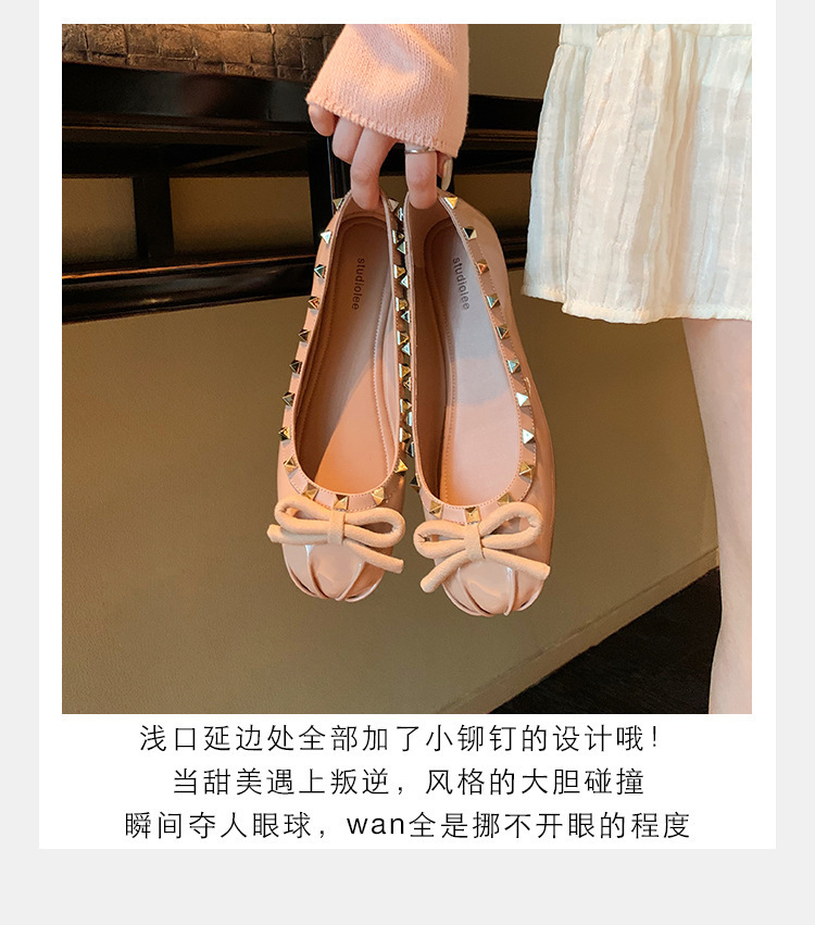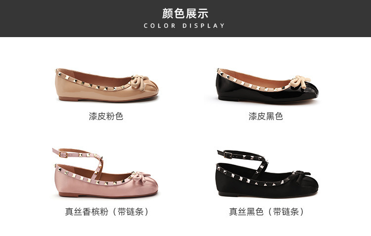 포도 엄마 Cowhide Valentino 스터드 싱글 레이어 신발 여성용 얕은 입 콘트라스트 활 플랫 발레 슈즈