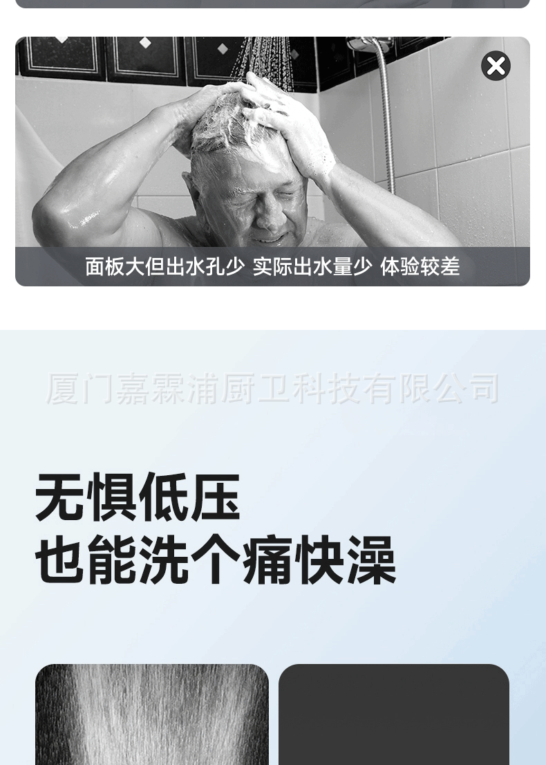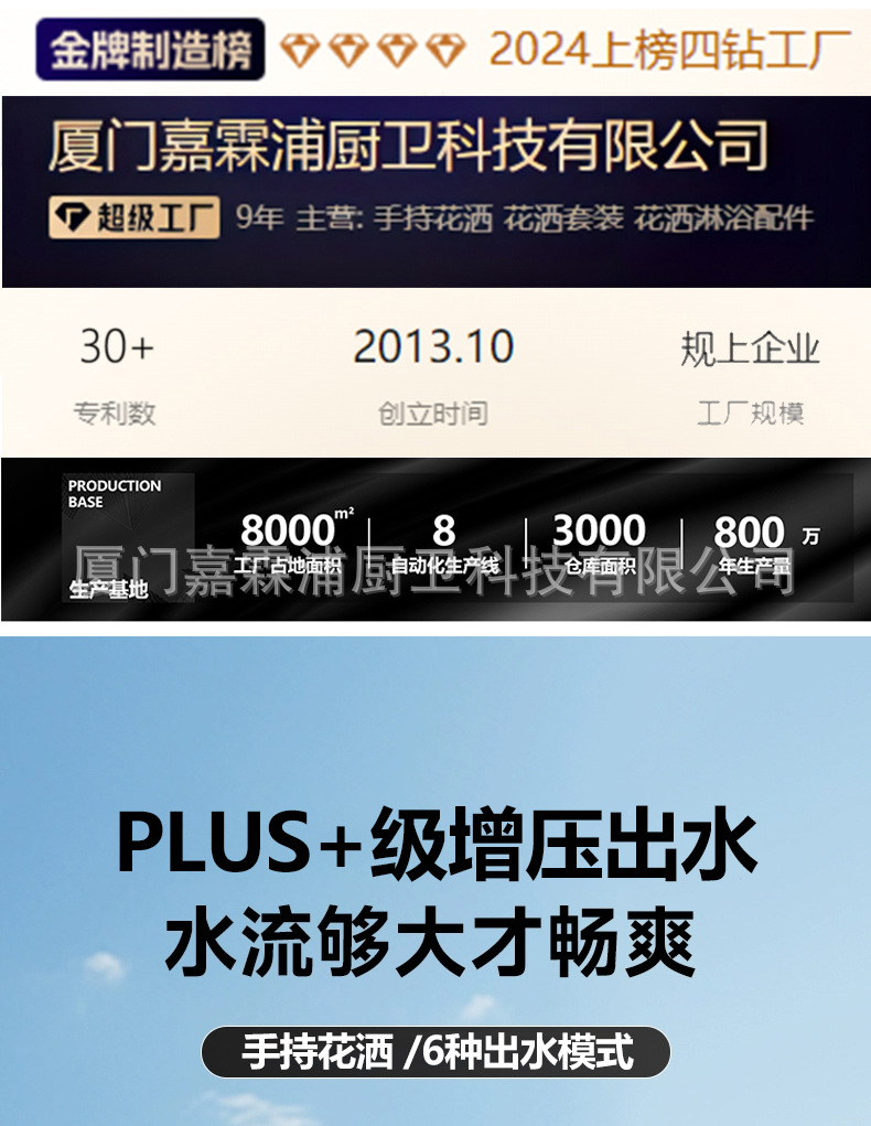 厦门嘉霖浦厨卫科技有限公司定位OEM为主,为客户提供整体卫浴花洒系列和相关配套服务,拥有软硬件设施完善的规模生产工厂,严格产品质量管控。多年来,凭借专业努力的团队及本地区成熟的供应系统,成功为多家龙头企业提供产品服务并成为颇有影响力的卫浴花洒供应商。在此过程中积累了丰富的行业设计及制造经验,曾解决众多此行业技术难题!