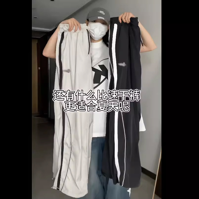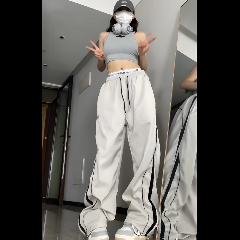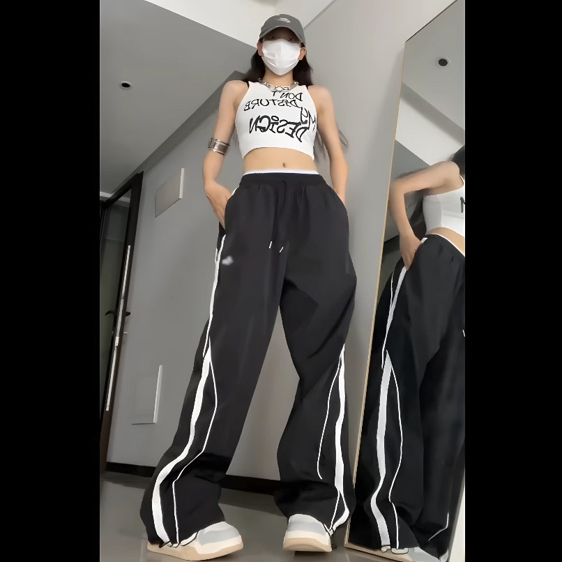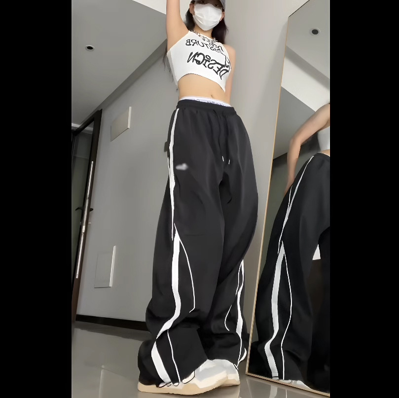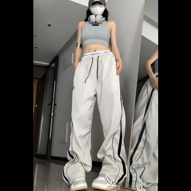 美式复古条纹速干冲锋运动裤女春季新款宽松直筒百搭休闲工装长裤